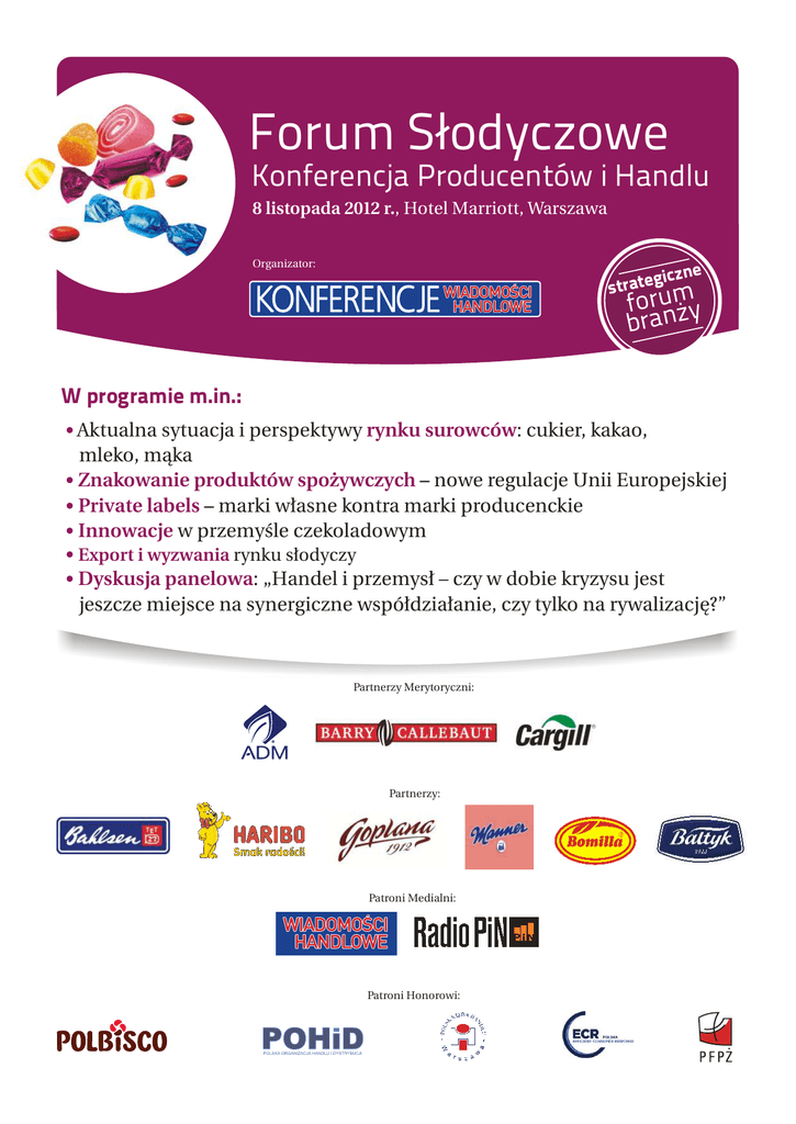 Forum Słodyczowe Konferencja Producentów i Handlu 8 listopada 2012 r., Hotel Marriott, Warszawa Organizator: giczne e t a r t s forunm y bra ż W programie m.in.: • Aktualna sytuacja i perspektywy rynku surowców: cukier, kakao, mleko, mąka • Znakowanie produktów spożywczych – nowe regulacje Unii Europejskiej • Private labels – marki własne kontra marki producenckie • Innowacje w przemyśle czekoladowym • Export i wyzwania rynku słodyczy • Dyskusja panelowa: „Handel i przemysł – czy w dobie kryzysu jest jeszcze miejsce na synergiczne współdziałanie, czy tylko na rywalizację?” Partnerzy Merytoryczni: Partnerzy: Patroni Medialni: Patroni Honorowi: PROGRAM FORUM Zapewniamy tłumaczenie symultaniczne na język angielski giczne strate m forunży bra 9:00 Poranna kawa i rejestracja 9:30 Przywitanie uczestników Paweł Kapuściński, Dyrektor Zarządzający, Wydawnictwo Gospodarcze 9:35 Dokąd zmierza polska gospodarka? Szanse i zagrożenia prof. Grzegorz Kołodko, były Minister Finansów 10:20 Stanowisko rządu względem reformy rynku cukru Przedstawiciel Ministerstwa Rolnictwa i Rozwoju Wsi 10:30 Sytuacja na rynku surowców – cukier, mleko, mąka dr Piotr Szajner, Instytut Ekonomiki Rolnictwa i Gospodarki Żywnościowej 10:45 The future of cocoa (Przyszłość surowców kakaowych) Nicholas Camu, Group Sustainability Manager, Barry Callebaut 11:05 Purchase of chocolate and cocoa products: how to gain more efficiency (Jak planować zakup czekolady i produktów kakaowych tak, żeby kupować je taniej) Grant Belden, Sales Director for Cocoa & Chocolate and Director of Cocoa Powder, ADM Trading 11:25 Przerwa kawowa 12:00 Rynek słodyczy w Polsce – trendy i kierunki rozwoju Joanna Rogalska, Senior Client Consultant, Nielsen 12:15 Znakowanie produktów spożywczych – nowe regulacje UE Dorota Balińska-Hajduk, Dyrektor Biura Kontroli Jakości Handlowej, Inspekcja Jakości Handlowej Artykułów Rolno - Spożywczych 12:35 Eksport i wyzwania stojące przed rynkiem słodyczy dr Alfred Schrott, Członek Zarządu ds. Marketingu i Sprzedaży, Josef Manner & Comp. AG (Austria) 12:55 Jak zarabiać więcej na słodyczach? Efektywne strategie cenowe w praktyce Maciej Kraus, Prezes Zarządu, Fern Partners 13:15 Równowaga pomiędzy private labels, a marką producencką – przykłady dobrych praktyk Alicja Koleśnik, Dyrektor Działu Zakupów, Jeronimo Martins Polska 13:35 Lunch 14:20 Efektywność taktyk w zarządzaniu kategoriami, w tym w zarządzaniu private labels Jarosław Jemczura, Dyrektor Handlowy, PPHU Bomilla 14:40 „Zaangażowanie” jako kluczowy element budowania skutecznych strategii komunikacji na rynku słodyczy Anna Lubowska, Chairman CEE, Russia & CIS, MEC 15:00 A journey to revolutionary know-how and nature working together (Rozwój rewolucyjnego know-how, aby współpracować z naturą) Herwig Bernaert, Innovation Manager Agronomy Fermentation & Functional Cocoa, Barry Callebaut 15:20 Perspektywy rynku słodyczy w Polsce na tle trendów europejskich Marek Przeździak, Sekretarz Generalny, POLBISCO 15:35 ECR – platforma efektywnej współpracy i rozwiązywania wspólnych problemów producentów i handlu Stefan Golonka, Współprzewodniczący, ECR 15:50 DYSKUSJA PANELOWA: Handel i przemysł – czy w dobie kryzysu jest jeszcze miejsce na synergiczne współdziałanie, czy tylko na rywalizację? Uczestnicy: Andrzej Faliński, Dyrektor Generalny, POHiD Krzysztof Jakubczak, Dyrektor Generalny, Perfetti van Melle Jan Kolański, Prezes Zarządu, Colian SA Jarosław Matysiak, Dyrektor Pionu Art. Świeże i Art. Suche-Food, Real Sp. z o.o. Waldemar Nowakowski, Prezes Zarządu, Polska Izba Handlu Krzysztof Tokarz, Prezes Zarządu, Grupa Kapitałowa Specjał Andrzej Wojciechowicz, FMCG Business Consulting PRELEGENCI Kto powinien uczestniczyć? PRODUCENCI SŁODYCZY: • • • • • • • prezesi, wiceprezesi, dyrektorzy zarządzający dyrektorzy i managerowie rozwoju i innowacji dyrektorzy i managerowie produkcji dyrektorzy i managerowie zakupu surowców dyrektorzy i managerowie handlowi (sprzedaży) dyrektorzy i managerowie marketingu specjaliści ds. private labels (marek własnych) HANDEL NOWOCZESNY I TRADYCYJNY: • • • • • dyrektorzy handlowi dyrektorzy zakupów category managerowie ds. słodyczy kupcy kategorii słodyczowej managerowie ds. private labels (marek własnych) Nicholas Camu Waldemar Nowakowski Grzegorz Kołodko Polska Izba Handlu, Prezes Zarządu prof. Grzegorz Kołodko ekonomista Barry Callebaut, Group Sustainability Manager Joanna Rogalska Alicja Koleśnik Nielsen, Senior Client Consultant Jeronimo Martins Polska, Dyrektor Działu Zakupów Grant Belden Alfred Schrott Piotr Szajner Stefan Golonka dr Alfred Schrott, Josef Manner & Comp. AG (Austria) Członek Zarządu ds. Marketingu i Sprzedaży dr Piotr Szajner Instytut Ekonomiki Rolnictwa i Gospodarki Żywnościowej Maciej Kraus Jarosław Jemczura Fern Partners, Prezes Zarządu PPHU Bomilla, Dyrektor Handlowy Inspekcja Jakości Handlowej Artykułów Rolno–Spożywczych, Dyrektor Biura Kontroli Jakości Handlowej Anna Lubowska Marek Przeździak Maria Andrzej Faliński MEC, Chairman CEE, Russia & CIS Krzysztof Tokarz POLBISCO, Sekretarz Generalny ADM Trading, Sales Director for Cocoa & Chocolate and Director of Cocoa Powder ECR Wieloletni Dyrektor Zarządzający polskiej części Kraft Foods, Prezes Zarządu POLBISCO – Stowarzyszenia Polskich Producentów Wyrobów Czekoladowych i Cukierniczych Dorota Balińska-Hajduk POHiD, Dyrektor Generalny Herwig Bernaert Krzysztof Jakubczak Barry Callebaut, Innovation Manager Agronomy Fermentation & Functional Cocoa Perfetti van Melle, General Manager Jan Kolański Jarosław Matysiak Andrzej Wojciechowicz Colian SA, Prezes Zarządu Real Sp. z o.o. Dyrektor Pionu Art. Świeże i Art. Suche-Food FMCG Business Consulting Specjał Grupa Kapitałowa, Prezes PROWADZĄCY KONFERENCJĘ Luis Andino Velez więcej informacji: www.forumslodyczowe.pl Dzi
