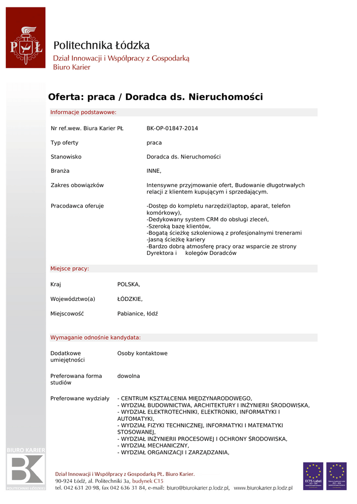 Oferta: praca / Doradca ds. Nieruchomości Informacje podstawowe: Nr ref.wew. Biura Karier PŁ BK-OP-01847-2014 Typ oferty praca Stanowisko Doradca ds. Nieruchomości Branża INNE, Zakres obowiązków Intensywne przyjmowanie ofert, Budowanie długotrwałych relacji z klientem kupującym i sprzedającym. Pracodawca oferuje -Dostęp do kompletu narzędzi(laptop, aparat, telefon komórkowy), -Dedykowany system CRM do obsługi zleceń, -Szeroką bazę klientów, -Bogatą ścieżkę szkoleniową z profesjonalnymi trenerami -Jasną ścieżkę kariery -Bardzo dobrą atmosferę pracy oraz wsparcie ze strony Dyrektora i kolegów Doradców Miejsce pracy: Kraj POLSKA, Województwo(a) ŁÓDZKIE, Miejscowość Pabianice, łódź Wymaganie odnośnie kandydata: Dodatkowe umiejętności Osoby kontaktowe Preferowana forma studiów dowolna Preferowane wydziały - CENTRUM KSZTAŁCENIA MIĘDZYNARODOWEGO, - WYDZIAŁ BUDOWNICTWA, ARCHITEKTURY I INŻYNIERII ŚRODOWISKA, - WYDZIAŁ ELEKTROTECHNIKI, ELEKTRONIKI, INFORMATYKI I AUTOMATYKI, - WYDZIAŁ FIZYKI TECHNICZNEJ, INFORMATYKI I MATEMATYKI STOSOWANEJ, - WYDZIAŁ INŻYNIERII PROCESOWEJ I OCHRONY ŚRODOWISKA, - WYDZIAŁ MECHANICZNY, - WYDZIAŁ ORGANIZACJI I ZARZĄDZANIA, Dane kontaktowe: Nazwa firmy/Pracodawcy Kraj Województwo Miasto Adres Kod pocztowy Osoba kontaktowa Telefon Email Metrohouse Pabianice POLSKA ŁÓDZKIE Pabianice ul. Św Jana 3 95-200 Mateusz Urbankiewicz 883334774 [email protected] Sposób aplikacji: CV proszę wysyłać na adres mailowy [email protected] Data umieszczenia: Oferta ważna od 26-08-2014 do 26-08-2018 Politechnika Łódzka, jest wpisana pod numerem 2414 do rejestru podmiotów prowadzących agencje zatrudnienia.