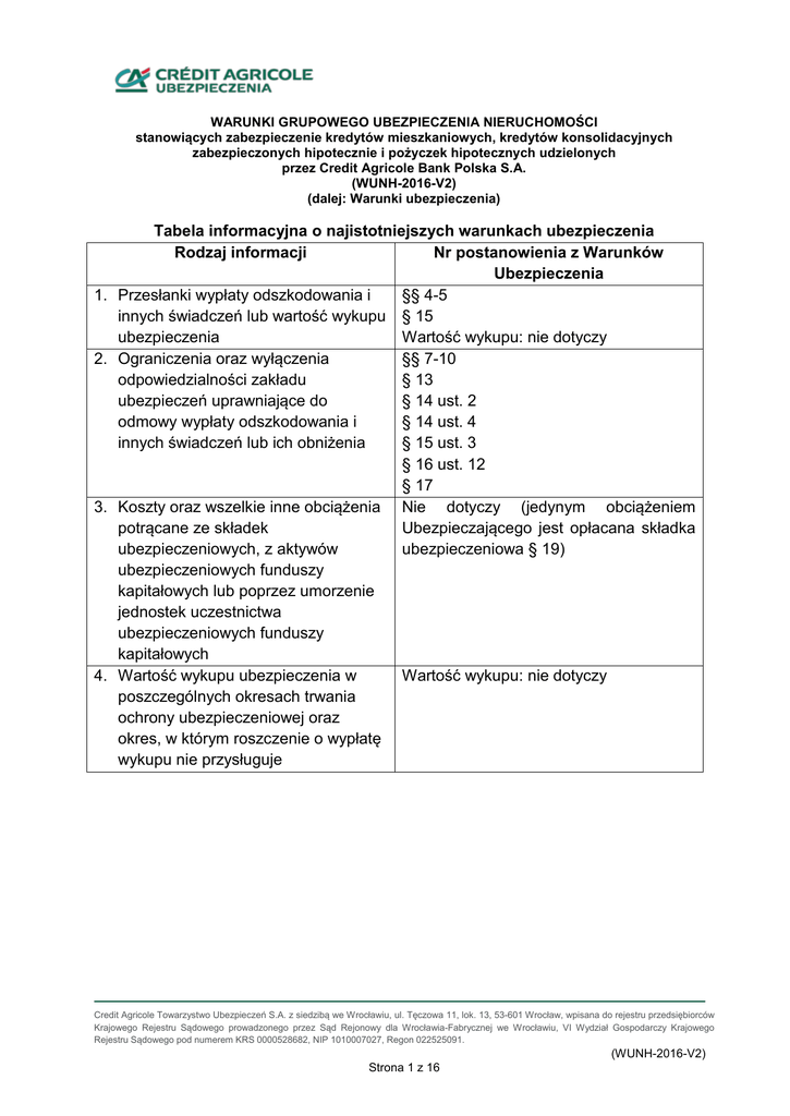 WARUNKI GRUPOWEGO UBEZPIECZENIA NIERUCHOMOŚCI stanowiących zabezpieczenie kredytów mieszkaniowych, kredytów konsolidacyjnych zabezpieczonych hipotecznie i pożyczek hipotecznych udzielonych przez Credit Agricole Bank Polska S.A. (WUNH-2016-V2) (dalej: Warunki ubezpieczenia) 1. 2. 3. 4. Tabela informacyjna o najistotniejszych warunkach ubezpieczenia Rodzaj informacji Nr postanowienia z Warunków Ubezpieczenia Przesłanki wypłaty odszkodowania i §§ 4-5 innych świadczeń lub wartość wykupu § 15 ubezpieczenia Wartość wykupu: nie dotyczy Ograniczenia oraz wyłączenia §§ 7-10 odpowiedzialności zakładu § 13 ubezpieczeń uprawniające do § 14 ust. 2 odmowy wypłaty odszkodowania i § 14 ust. 4 innych świadczeń lub ich obniżenia § 15 ust. 3 § 16 ust. 12 § 17 Koszty oraz wszelkie inne obciążenia Nie dotyczy (jedynym obciążeniem potrącane ze składek Ubezpieczającego jest opłacana składka ubezpieczeniowych, z aktywów ubezpieczeniowa § 19) ubezpieczeniowych funduszy kapitałowych lub poprzez umorzenie jednostek uczestnictwa ubezpieczeniowych funduszy kapitałowych Wartość wykupu ubezpieczenia w Wartość wykupu: nie dotyczy poszczególnych okresach trwania ochrony ubezpieczeniowej oraz okres, w którym roszczenie o wypłatę wykupu nie przysługuje Credit Agricole Towarzystwo Ubezpieczeń S.A. z siedzibą we Wrocławiu, ul. Tęczowa 11, lok. 13, 53-601 Wrocław, wpisana do rejestru przedsiębiorców Krajowego Rejestru Sądowego prowadzonego przez Sąd Rejonowy dla Wrocławia-Fabrycznej we Wrocławiu, VI Wydział Gospodarczy Krajowego Rejestru Sądowego pod numerem KRS 0000528682, NIP 1010007027, Regon 022525091. (WUNH-2016-V2) Strona 1 z 16 POSTANOWIENIA WSTĘPNE §1 Niniejsze Warunki ubezpieczenia regulują zasady udzielania przez Credit Agricole Towarzystwo Ubezpieczeń S.A. z siedzibą we Wrocławiu ochrony ubezpieczeniowej w zakresie ubezpieczenia Nieruchomości od Pożaru i innych Zdarzeń losowych, na podstawie „Umowy Grupowego Ubezpieczenia Nieruchomości stanowiących zabezpieczenie kredytów mieszkaniowych, kredytów konsolidacyjnych zabezpieczonych hipotecznie i pożyczek hipotecznych udzielonych przez Credit Agricole Bank Polska S.A.” z dnia 10 kwietnia 2015 r., której Stronami są Ubezpieczyciel oraz Credit Agricole Bank Polska S.A. DEFINICJE §2 Ilekroć w niniejszych Warunkach ubezpieczenia oraz wszelkich innych dokumentach i oświadczeniach sporządzanych w związku z ochroną ubezpieczeniową świadczoną zgodnie z Warunkami ubezpieczenia używa się następujących definicji, oznaczają one odpowiednio: 1) Bank lub Ubezpieczający - Credit Agricole Bank Polska S.A. z siedzibą we Wrocławiu; 2) Budynek o charakterze użytkowym/Lokal o charakterze użytkowym: a) pensjonat wypoczynkowy w miejscowości o charakterze wypoczynkowym; b) lokal przeznaczony do wykonywania działalności zawodowej, zgłoszony jako przeznaczony do wykonywania takiej działalności odpowiednim organom; 2 c) niewielki (do 300 m powierzchni użytkowej) budynek lub lokal o charakterze handlowym, usługowym, biurowym lub mieszanym (łączącym te funkcje); d) lokal użytkowy łącznie z Domem jednorodzinnym/Lokalem mieszkalnym - jeżeli stanowi całość z Nieruchomością mieszkalną lecz jest lokalem funkcjonalnie wydzielonym oraz zgłoszonym odpowiednim organom jako część Nieruchomości przeznaczona na prowadzenie działalności gospodarczej; 3) Deklaracja zgody - oświadczenie woli Ubezpieczonego w formie pisemnej, mocą którego wyraża on zgodę na objęcie Nieruchomości ochroną ubezpieczeniową, zgodnie z Warunkami ubezpieczenia; 4) Deszcz nawalny - opad deszczu o współczynniku wydajności co najmniej 4, ustalany w oparciu o dane pomiarowe uzyskane z IMiGW; w przypadku braku możliwości uzyskania opinii IMiGW wystąpienie Deszczu nawalnego stwierdza się na podstawie stanu faktycznego i rozmiaru Szkód w miejscu ich powstania oraz w najbliższej okolicy; 5) Dewastacja - bezprawne, umyślne zniszczenie lub uszkodzenie ubezpieczonej Nieruchomości lub ubezpieczonych Stałych elementów przez Osoby trzecie w związku z usiłowaniem lub dokonaniem Kradzieży z włamaniem lub Rabunku; 6) Dom jednorodzinny - budynek wolnostojący albo samodzielna część budynku bliźniaczego lub szeregowego, przeznaczony na zaspokajanie potrzeb mieszkaniowych albo jednocześnie mieszkaniowych i użytkowych, pod warunkiem, że powierzchnia wykorzystywana do celów użytkowych nie przekracza 30% całkowitej powierzchni Nieruchomości, przy czym za cel użytkowy uznaje się prowadzoną przez osobę fizyczną będącą Właścicielem nieruchomości działalność gospodarczą lub działalność zawodową. Jeżeli w Domu jednorodzinnym jest wbudowany garaż, garaż ten objęty jest niniejszą definicją; 7) Dym i sadza - zawiesina cząsteczek będąca bezpośrednim skutkiem: a) spalania, która nagle i w sposób krótkotrwały wydobywa się z urządzeń znajdujących się w Miejscu ubezpieczenia, eksploatowanych zgodnie z przeznaczeniem i przepisami technicznymi oraz przy sprawnym działaniu urządzeń wentylacyjnych i oddymiających; b) Pożaru, niezależnie od miejsca jego powstania; 8) Dzień roboczy - każdy dzień tygodnia od poniedziałku do piątku, z wyłączeniem dni ustawowo wolnych od pracy; 9) Eksplozja - nagle przebiegające uzewnętrznienie się siły spowodowanej dążeniem do rozszerzania się gazów, pyłów, cieczy lub pary, przy czym w odniesieniu do naczyń ciśnieniowych i innych tego rodzaju zbiorników warunkiem uznania Szkody za spowodowaną Eksplozją jest takie rozerwanie ścian tych naczyń i zbiorników, że zachodzi nagłe wyrównanie różnicy ciśnień wewnątrz i na zewnątrz zbiornika; 10) Grad - opad atmosferyczny w postaci bryłek lodu; Credit Agricole Towarzystwo Ubezpieczeń S.A. z siedzibą we Wrocławiu, ul. Tęczowa 11, lok. 13, 53-601 Wrocław, wpisana do rejestru przedsiębiorców Krajowego Rejestru Sądowego prowadzonego przez Sąd Rejonowy