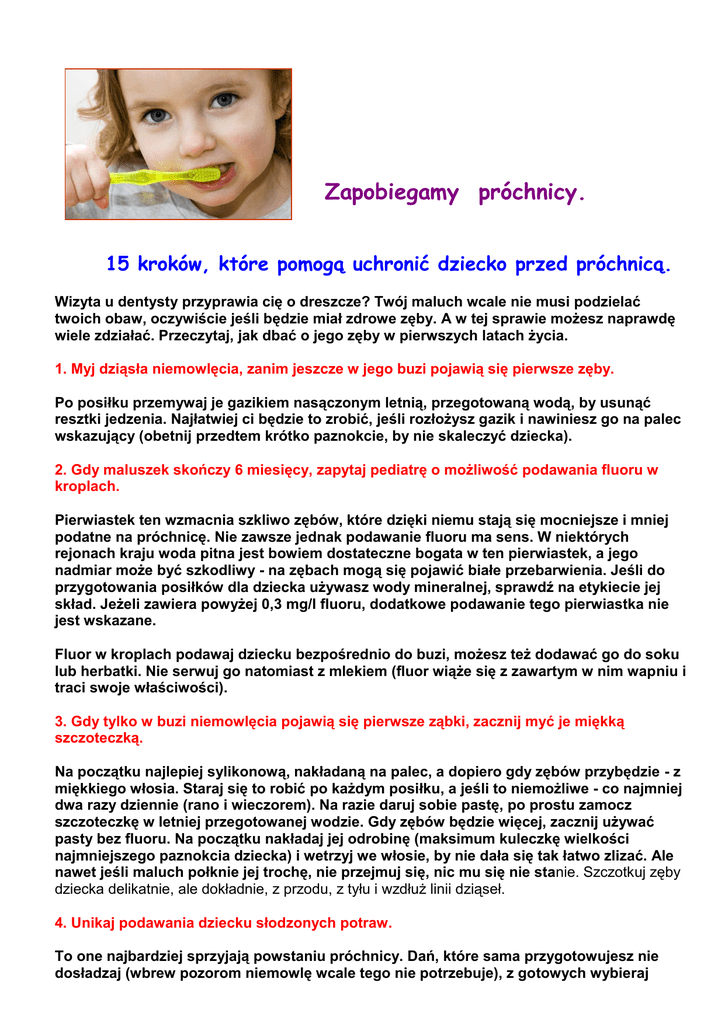 Zapobiegamy próchnicy. 15 kroków, które pomogą uchronić dziecko przed próchnicą. Wizyta u dentysty przyprawia cię o dreszcze? Twój maluch wcale nie musi podzielać twoich obaw, oczywiście jeśli będzie miał zdrowe zęby. A w tej sprawie możesz naprawdę wiele zdziałać. Przeczytaj, jak dbać o jego zęby w pierwszych latach życia. 1. Myj dziąsła niemowlęcia, zanim jeszcze w jego buzi pojawią się pierwsze zęby. Po posiłku przemywaj je gazikiem nasączonym letnią, przegotowaną wodą, by usunąć resztki jedzenia. Najłatwiej ci będzie to zrobić, jeśli rozłożysz gazik i nawiniesz go na palec wskazujący (obetnij przedtem krótko paznokcie, by nie skaleczyć dziecka). 2. Gdy maluszek skończy 6 miesięcy, zapytaj pediatrę o możliwość podawania fluoru w kroplach. Pierwiastek ten wzmacnia szkliwo zębów, które dzięki niemu stają się mocniejsze i mniej podatne na próchnicę. Nie zawsze jednak podawanie fluoru ma sens. W niektórych rejonach kraju woda pitna jest bowiem dostateczne bogata w ten pierwiastek, a jego nadmiar może być szkodliwy - na zębach mogą się pojawić białe przebarwienia. Jeśli do przygotowania posiłków dla dziecka używasz wody mineralnej, sprawdź na etykiecie jej skład. Jeżeli zawiera powyżej 0,3 mg/l fluoru, dodatkowe podawanie tego pierwiastka nie jest wskazane. Fluor w kroplach podawaj dziecku bezpośrednio do buzi, możesz też dodawać go do soku lub herbatki. Nie serwuj go natomiast z mlekiem (fluor wiąże się z zawartym w nim wapniu i traci swoje właściwości). 3. Gdy tylko w buzi niemowlęcia pojawią się pierwsze ząbki, zacznij myć je miękką szczoteczką. Na początku najlepiej sylikonową, nakładaną na palec, a dopiero gdy zębów przybędzie - z miękkiego włosia. Staraj się to robić po każdym posiłku, a jeśli to niemożliwe - co najmniej dwa razy dziennie (rano i wieczorem). Na razie daruj sobie pastę, po prostu zamocz szczoteczkę w letniej przegotowanej wodzie. Gdy zębów będzie więcej, zacznij używać pasty bez fluoru. Na początku nakładaj jej odrobinę (maksimum kuleczkę wielkości najmniejszego paznokcia dziecka) i wetrzyj we włosie, by nie dała się tak łatwo zlizać. Ale nawet jeśli maluch połknie jej trochę, nie przejmuj się, nic mu się nie stanie. Szczotkuj zęby dziecka delikatnie, ale dokładnie, z przodu, z tyłu i wzdłuż linii dziąseł. 4. Unikaj podawania dziecku słodzonych potraw. To one najbardziej sprzyjają powstaniu próchnicy. Dań, które sama przygotowujesz nie dosładzaj (wbrew pozorom niemowlę wcale tego nie potrzebuje), z gotowych wybieraj raczej te, które nie zawierają cukru. Jak najdłużej (co najmniej do końca pierwszego roku życia) staraj się nie podawać maluchowi słodyczy, ani nie pozwalaj na to innym. 5. Po wieczornym myciu zębów nie dawaj malcowi do picia soków. Zawarty w nich naturalny cukier, czyli fruktoza, podobnie jak zwykły cukier źle działa na zęby. Oczywiście nie serwuj też w nocy słodzonej herbatki. Jeśli maluchowi chce się pić, zaproponuj mu niskomineralizowaną wodę mineralną (niemowlętom powyżej sześciu miesięcy nie trzeba już jej przegotowywać). 6. Jak najszybciej staraj się odzwyczaić niemowlę od picia przez smoczek. Jeśli karmisz piersią, najlepiej w ogóle nie kupuj butelki ze smoczkiem. Długotrwałe picie przez smoczek słodkich napojów (a takie są także niedosładzane soki i mleko), fatalnie wpływa na zęby. Sześcio-, siedmiomiesięczny maluch może już nauczyć się pić z kubeczka z dziobkiem lub przez słomkę. Gęste potrawy najlepiej zaś podawać mu łyżeczką. 7. Pod koniec pierwszego roku życia dziecka, spróbuj zrezygnować z nocnych karmień. Maluch w tym wieku na ogół ich już nie potrzebuje (wyjątkiem są dzieci o bardzo słabym apetycie, z niedowagą), a mleko zarówno to naturalne, kobiece, jak i modyfikowane zawiera laktozę, naturalny cukier, który podobnie jak fruktoza nie najlepiej wpływa na zęby. Dzieci karmione sztucznie zwykle witają tę większych zmianę bez protestów (na ogół wystarczy przesunięcie godziny wieczornego posiłku). Jeśli karmisz piersią, rezygnacja z nocnego karmienia może być nieco trudniejsza, ale wbrew pozorom w tym wieku znacznie łatwiej do niej przekonać malca niż kilka miesięcy później. 8. Gdy niemowlę skończy rok, wybierz się z nim do dentysty na wizytę kontrolną. Zrób to także, gdy dziecko wciąż nie ma zębów. Stomatolog sprawdzi, czy wszystko jest w porządku (jeśli stosowałaś się do powyższych rad, prawdopodobnie tak jest). Nie obawiaj się reakcji malca. Młodsze dzieci zwykle znacznie lepiej znoszą wizyty w gabinecie niż starsze. Oczywiście jeśli dentysta ma cierpliwość i serce dla małych pacjentów. Warto więc takiego poszukać. Jeżeli ząbki są zdrowe, wizyty kontrolne należy powtarzać co pół roku. Jeśli coś jest nie tak, oczywiście zgodnie z zaleceniami lekarza. 9. Naucz malca, że po jedzeniu słodyczy, myje się zęby. Oczywiście najlepiej by było, żeby dziecko nadal nie jadło słodyczy, ale bądźmy realistami wcześniej czy później łakocie pojawią się w jego jadłospisie. Warto wtedy zadbać, by maluch nie pojadał ich co chwila. Jeden słodki deser w ciągu dnia wystarczy (radykałowie radzą nawet zupełne wyeliminowanie słodyczy w ciągu tygodnia i wprowadzenie jednego słodkiego dnia np. w niedzielę). Jeśli będziesz pamiętać, by dokładnie po nim umyć zęby dziecka, możesz spać w miarę spokojnie. Starannie wybieraj łakocie, które podajesz maluchowi. Najbardziej sprzyjają powstaniu próchnicy te, które długo się trzyma w buzi (lizaki, dropsy, landrynki), i te, które oblepiają zęby (krówki, toffi, pianki, owocowe i miętowe cukierki do żucia). Mniej groźne dla zębów są ciastka, herbatniki czy czekolada. Źródło internet : http://www.edziecko.pl/pierwszy_rok/1,79405,4560610.html