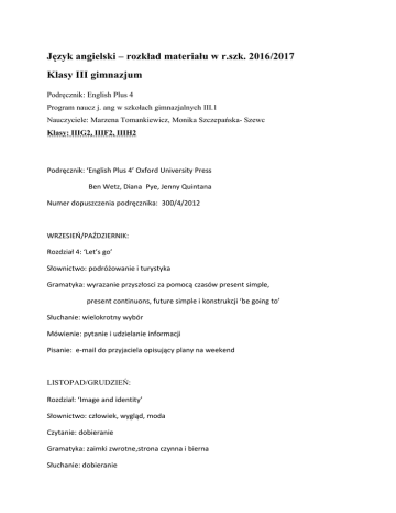 Język angielski – rozkład materiału w r.szk. 2016/2017 Klasy III gimnazjum Podręcznik: English Plus 4 Program naucz j. ang w szkołach gimnazjalnych III.1 Nauczyciele: Marzena Tomankiewicz, Monika Szczepańska- Szewc Klasy: IIIG2, IIIF2, IIIH2 Podręcznik: ‘English Plus 4’ Oxford University Press Ben Wetz, Diana Pye, Jenny Quintana Numer dopuszczenia podręcznika: 300/4/2012 WRZESIEŃ/PAŹDZIERNIK: Rozdział 4: ‘Let’s go’ Słownictwo: podróżowanie i turystyka Gramatyka: wyrazanie przyszłosci za pomocą czasów present simple, present continuons, future simple i konstrukcji ‘be going to’ Słuchanie: wielokrotny wybór Mówienie: pytanie i udzielanie informacji Pisanie: e-mail do przyjaciela opisujący plany na weekend LISTOPAD/GRUDZIEŃ: Rozdział: ‘Image and identity’ Słownictwo: człowiek, wygląd, moda Czytanie: dobieranie Gramatyka: zaimki zwrotne,strona czynna i bierna Słuchanie: dobieranie Mówienie: zakupy w sklepie odzieżowym Pisanie: list formalny(reklamacja), notatka STYCZEŃ/LUTY: Rozdział: ‘A perfect world’ Słownictwo: życie społeczne i polityczne Czytanie: dobieranie Gramatyka: pierwszy i drugi tryb warunkowy Słuchanie: dobieranie Mówienie: wyrażanie życzeń i żalu Pisanie: rozprawka, zaproszenie MARZEC/KWIECIEŃ: Rozdział: ‘Ups and downs’ Słownictwo: człowiek, cechy charakteru, uczucia Czytanie: wielokrotny wybór Gramatyka: trzeci tryb warunkowy, zdania przydawkowe Słuchanie: wielokrotny wybór Mówienie: wyrażanie współczucia Pisanie: list do przyjaciela MAJ/CZERWIEC: Rozdział: ‘Honestly’ Słownictwo: życie rodzinne i towarzyskie Czytanie: dobieranie Gramatyka: mowa zależna-zmiana czasów, pytania pośrednie Słuchanie: dobieranie Mówienie: opisywanie zdarzeń (wyjaśnianie, co zaszło) Pisanie: opowiadanie, wiadomość Język angielski Rozkład materiału 2016/2017 3F1, 3G1, 3H1 Podręcznik: Victoria Evans. EXPRESS PUBLISHING: EGZAMIN GIMNAZJALNY REPETYTORIUM. POZIOM PODSTAWOWY I ROZSZERZONY A2/B1 (rozdziały 3-14) Nauczyciel: Małgorzata Grzechulska, Monika Szczepańska-Szewc 1. Moduł 3. Szkoła – słownictwo, ćwiczenia leksykalno-gramatyczne. Powtórzenie – liczebniki, zaimki wskazujące i czasy przeszłe. 2. E-camp – praca z tekstem. Analiza zadań typu egzaminacyjnego: rozumienie tekstów pisanych/ ze słuchu, znajomość funkcji/ środków językowych. 3. Zadania typu egzaminacyjnego. Reagowanie na sytuacje. Zajęcia pozalekcyjne w mojej szkole – ćwiczenia w mówieniu. 4. Analiza zadań typu egzaminacyjnego – poziom rozszerzony: rozumienie tekstów pisanych i rozumienie ze słuchu. 5. Analiza zadań typu egzaminacyjnego – poziom rozszerzony: znajomość środków językowych i wypowiedź pisemna (list). 6. Przygotowujemy prezentacje na temat Republiki Irlandii i Stanów Zjednoczonych. 7. Moduł 4. Zawody i związane z nimi czynności, miejsca pracy – słownictwo. Czasy przyszłe – powtórzenie. Ćwiczenia leksykalno-gramatyczne. 8. Zadania typu egzaminacyjnego. Rozmowa kwalifikacyjna – tworzenie i odgrywanie dialogów. 9. Zadania typu egzaminacyjnego. Which job would be ideal for…? Why? – ćwiczenia w mówieniu 10. Analiza zadań typu egzaminacyjnego – poziom rozszerzony: rozumienie tekstów pisanych i rozumienie ze słuchu. Pisanie ogłoszenia o pracy. 11. Analiza zadań typu egzaminacyjnego – poziom rozszerzony: znajomość środków językowych i wypowiedź pisemna (list). 12. Moduł 5. Moja rodzina i mój typowy dzień – słownictwo. Czasowniki modalne – powtórzenie. Ćwiczenia leksykalno-gramatyczne. 13. Zadania typu egzaminacyjnego. Rozmowa kwalifikacyjna – tworzenie i odgrywanie dialogów. 14. Uroczystości – ćwiczenia w czytaniu i słuchaniu, uzupełnianie luk w tekstach. 15. Zadania typu egzaminacyjnego – poziom rozszerzony: ćwiczenia w czytaniu i słuchaniu, ćwiczenia leksykalne. 16. Piszemy e-maila – zwroty używane na początki i na końcu e-maila. Parafrazowanie zdań. 17. Moduł 6. Żywienie – słownictwo; rzeczowniki policzalne i niepoliczalne (powtórzenie) – ćwiczenia leksykalno-gramatyczne. Tworzenie i odgrywanie dialogów. 18. Tabliczki informacyjne; ulubione potrawy – ćwiczenia w czytaniu, słuchaniu i mówieniu. 19. Konkursy kulinarne – ćwiczenia w czytaniu i słuchaniu, uzupełnianie luk w tekście. Prezentacje na temat konkursów kulinarnych w Polsce 20. Zadania typu egzaminacyjnego – poziom rozszerzony: ćwiczenia w czytaniu i słuchaniu. Prezentowanie zebranych informacji na temat soli. 21. Piszemy list – interpunkcja, podział na akapity, zawartość, styl, poprawność ortograficzna i gramatyczna. 22. Moduł 7. Zakupy i usługi – słownictwo; przedimki (a/ an/ the) i określniki (złożenia z some/ any/ no/ every) (powtórzenie) – ćwiczenia leksykalno-gramatyczne. 23. Zakupy i usługi – ćwiczenia w czytaniu, słuchaniu i mówieniu. 24. Zadania typu egzaminacyjnego – poziom rozszerzony: ćwiczenia w czytaniu i słuchaniu. Prezentowanie informacji na temat zakupów. 25. Zadania typu egzaminacyjnego – znajomość środków językowych. Pisanie e-maila – uwzględnianie wszystkich informacji z polecenia. 26. Prezentujemy informacje na temat Australii i Walii. 27. Moduł 8. podróżowanie – słownictwo; bezokoliczniki i czasowniki z końcówką -ing. Wskazywanie drogi – tworzenie i odgrywanie dialogów 28. Wakacje – ćwiczenia w czytaniu, słuchaniu i mówieniu 29. Wakacje w Olympia Sports Camp – odgrywanie dialogów. Ćwiczenia w czytaniu, słuchaniu i mówieniu. 30. Miejsca wakacyjnego wypoczynku – ćwiczenia w czytaniu i słuchaniu. 31. Pisanie i prezentowanie informacji na temat miejsc wypoczynku. Tłumaczenie fragmentów zdań, środki językowe. Pisanie listu prywatnego. 32. Moduł 9. Performing arts & fine arts – słownictwo. Zaimki względne – powtórzenie. Ćwiczenia leksykalno-gramatyczne. 33. Zadania typu egzaminacyjnego na poziomie podstawowym (kultura). 34. Zadania typu egzaminacyjnego 