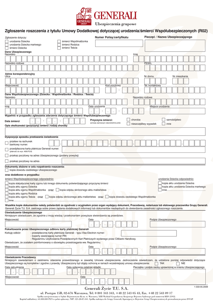 Zg∏oszenie roszczenia z tytu∏u Umowy Dodatkowej dotyczàcej urodzenia/Êmierci Wspó∏ubezpieczonych (R02) Piecz´ç / Nazwa Ubezpieczajàcego Numer Polisy/certyfikatu Zg∏oszenie dotyczy: urodzenia Dziecka urodzenia Dziecka martwego Êmierci Dziecka Êmierci Wspó∏ma∏˝onka Êmierci Rodzica Êmierci TeÊcia Dane Ubezpieczonego Nazwisko Imi´ Nazwisko rodowe PESEL Adres korespondencyjny Ulica Nr domu MiejscowoÊç Kod pocztowy Nr mieszkania Tel. kontaktowy Dane Wspó∏ubezpieczonego (Dziecka / Wspó∏ma∏˝onka / Rodzica / TeÊcia) Nazwisko Imi´ Nazwisko rodowe Miejsce urodzenia Data urodzenia d - d m - m r r r r Wype∏niç w przypadku zg∏aszania zdarzenia dotyczàcego Êmierci Wspó∏ubezpieczonego Data Êmierci d - d m m - r r r r Przyczyna Êmierci: choroba samobójstwo (prosz´ zaznaczyç odpowiednie pole) nieszcz´Êliwy wypadek inne Opis okolicznoÊci (przyczyny) Êmierci /rodzaj choroby Dyspozycja sposobu przekazania Êwiadczenia przelew na rachunek bankowy numer: - - - - - - przedp∏acona karta p∏atnicza Generali numer: (p∏atnoÊç do wys. 4000 PLN) przekaz pocztowy na adres Ubezpieczonego (podany powy˝ej) przekaz pocztowy na adres Dokumenty z∏o˝one w celu rozpatrzenia roszczenia: kopia dowodu osobistego Ubezpieczonego oraz dodatkowo w przypadku: urodzenia Dziecka odpowiednio: Êmierci Wspó∏ubezpieczonego odpowiednio: kopia statystycznej karty zgonu lub innego dokumentu potwierdzajàcego przyczyn´ Êmierci kopia aktu zgonu Dziecka kopia odpisu skróconego aktu ma∏˝eƒstwa kopia aktu zgonu Wspó∏ma∏˝onka oraz kopia aktu zgonu Rodzica kopia odpisu skróconego aktu ma∏˝eƒstwa oraz kopia dowodu osobistego Wspó∏ma∏˝onka kopia aktu zgonu TeÊcia oraz inne…………………………................................................................................................................................................................……………... kopia aktu urodzenia Dziecka kopia aktu urodzenia Dziecka martwego inne………………………………………... Wszelkie kopie dokumentów nale˝y potwierdziç za zgodnoÊç z orygina∏em przez organ wydajàcy dokument, Pracodawc´, notariusza lub etatowego pracownika Grupy Generali. Generali ˚ycie T.U. S.A. zastrzega sobie prawo ˝àdania dodatkowych informacji lub dokumentów niezb´dnych do stwierdzenia zasadnoÊci zg∏oszonego roszczenia. OÊwiadczenie Ubezpieczonego Niniejszym oÊwiadczam, ˝e zgodnie z mojà wiedzà i przekonaniem powy˝sze stwierdzenia sà prawdziwe. MiejscowoÊç Podpis Ubezpieczonego Data d d - m - m r r r r Pokwitowanie przez Ubezpieczonego odbioru karty p∏atniczej Generali Kwituj´ odbiór: - przedp∏aconej karty p∏atniczej Generali – typu Visa Electron numer: - koperty zawierajàcej numer PIN - Regulaminu U˝ytkowania Przedp∏aconych Kart P∏atniczych wydanego przez Citibank Handlowy. OÊwiadczam, ˝e zosta∏em poinformowany o obowiàzku przestrzegania ww. Regulaminu. MiejscowoÊç Podpis Ubezpieczonego Data d d - m - m r r r r OÊwiadczenie Pracodawcy Niniejszym zawiadamiam o zaistnieniu zdarzenia przewidzianego w zawartej Umowie ubezpieczenia. JednoczeÊnie oÊwiadczam, ˝e udzielone poni˝ej odpowiedzi dotyczàce Ubezpieczonego sà kompletne i zgodne z prawdà. Ubezpieczony by∏ obj´ty ochronà w ramach wczeÊniejszej umowy ubezpieczenia: NIE TAK Data zatrudnienia d d - MiejscowoÊç m Pieczàtka i podpis osoby uprawnionej w imieniu Ubezpieczajàcego Data op∏acenia ostatniej sk∏adki m - r r r r d d - m m - r r d - m m r r Data d - r r r r Generali ˚ycie T.U. S.A. ul. Post´pu 15B, 02-676 Warszawa, Tel. 0 801 343 343, +48 22 543 05 43, Fax. +48 22 543 09 17 Spó∏ka zarejestrowana w Sàdzie Rejownowym dla m. st. Warszawy, XIII Wydzia∏ Gospodarczy Krajowego Rejestru Sàdowego pod numerem KRS 25952. Kapita∏ zak∏adowy: 61.000.000 PLN w pe∏ni op∏acony; NIP: 521-28-87-341. Spółka nale˝àca do Grupy Generali, figurujàcej w Rejestrze Grup Ubezpieczeniowych prowadzonym przez ISVAP. 1-333-05.2009
