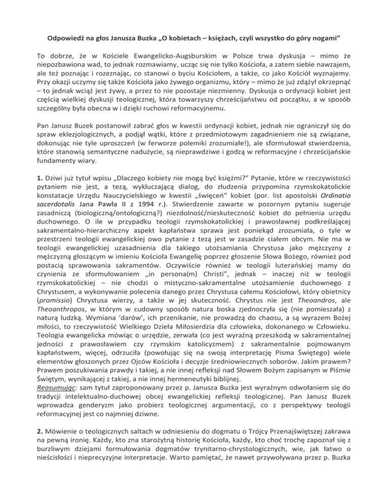 Odpowiedź na głos Janusza Buzka „O kobietach – księżach, czyli wszystko do góry nogami” To dobrze, że w Kościele Ewangelicko-Augsburskim w Polsce trwa dyskusja – mimo że niepozbawiona wad, to jednak rozmawiamy, ucząc się nie tylko Kościoła, a zatem siebie nawzajem, ale też poznając i rozeznając, co stanowi o byciu Kościołem, a także, co jako Kościół wyznajemy. Przy okazji uczymy się także Kościoła jako żywego organizmu, który – mimo że już zdążył okrzepnąć – to jednak wciąż jest żywy, a przez to nie pozostaje niezmienny. Dyskusja o ordynacji kobiet jest częścią wielkiej dyskusji teologicznej, która towarzyszy chrześcijaństwu od początku, a w sposób szczególny była obecna w i dzięki ruchowi reformacyjnemu. Pan Janusz Buzek postanowił zabrać głos w kwestii ordynacji kobiet, jednak nie ograniczył się do spraw eklezjologicznych, a podjął wątki, które z przedmiotowym zagadnieniem nie są związane, dokonując nie tyle uproszczeń (w ferworze polemiki zrozumiałe!), ale sformułował stwierdzenia, które stanowią semantyczne nadużycie, są nieprawdziwe i godzą w reformacyjne i chrześcijańskie fundamenty wiary. 1. Dziwi już tytuł wpisu „Dlaczego kobiety nie mogą być księżmi?” Pytanie, które w rzeczywistości pytaniem nie jest, a tezą, wykluczającą dialog, do złudzenia przypomina rzymskokatolickie konstatacje Urzędu Nauczycielskiego w kwestii „święceń” kobiet (por. list apostolski Ordinatio sacerdotalis Jana Pawła II z 1994 r.). Stwierdzenie zawarte w pozornym pytaniu sugeruje zasadniczą (biologiczną/ontologiczną?) niezdolność/nieskuteczność kobiet do pełnienia urzędu duchownego. O ile w przypadku teologii rzymskokatolickiej i prawosławnej podkreślającej sakramentalno-hierarchiczny aspekt kapłaństwa sprawa jest poniekąd zrozumiała, o tyle w przestrzeni teologii ewangelickiej owo pytanie z tezą jest w zasadzie ciałem obcym. Nie ma w teologii ewangelickiej uzasadnienia dla takiego utożsamiania Chrystusa jako mężczyzny z mężczyzną głoszącym w imieniu Kościoła Ewangelię poprzez głoszenie Słowa Bożego, również pod postacią sprawowania sakramentów. Oczywiście również w teologii luterańskiej mamy do czynienia ze sformułowaniem „in persona(m) Christi”, jednak – inaczej niż w teologii rzymskokatolickiej – nie chodzi o mistyczno-sakramentalne utożsamienie duchownego z Chrystusem, a wykonywanie polecenia danego przez Chrystusa całemu Kościołowi, który obietnicy (promissio) Chrystusa wierzy, a także w jej skuteczność. Chrystus nie jest Theoandros, ale Theoanthropos, w którym w cudowny sposób natura boska zjednoczyła się (nie pomieszała) z naturą ludzką. Wymiana ‘darów’, ich przenikanie, nie prowadzą do chaosu, a są wyrazem Bożej miłości, to rzeczywistość Wielkiego Dzieła Miłosierdzia dla człowieka, dokonanego w Człowieku. Teologia ewangelicka mówiąc o urzędzie, zerwała (co jest wyraźną przeszkodą w sakramentalnej jedności z prawosławiem czy rzymskim katolicyzmem) z sakramentalnie pojmowanym kapłaństwem, więcej, odrzuciła (powołując się na swoją interpretację Pisma Świętego) wiele elementów głoszonych przez Ojców Kościoła i decyzje średniowiecznych soborów. Jakim prawem? Prawem poszukiwania prawdy i takiej, a nie innej refleksji nad Słowem Bożym zapisanym w Piśmie Świętym, wynikającej z takiej, a nie innej hermeneutyki biblijnej. Reasumując: sam tytuł zaproponowany przez p. Janusza Buzka jest wyraźnym odwołaniem się do tradycji intelektualno-duchowej obcej ewangelickiej refleksji teologicznej. Pan Janusz Buzek wprowadza genderyzm jako probierz teologicznej argumentacji, co z perspektywy teologii reformacyjnej jest co najmniej dziwne. 2. Mówienie o teologicznych saltach w odniesieniu do dogmatu o Trójcy Przenajświętszej zakrawa na pewną ironię. Każdy, kto zna starożytną historię Kościoła, każdy, kto choć trochę zapoznał się z burzliwym dziejami formułowania dogmatów trynitarno-chrystologicznych, wie, jak łatwo o nieścisłości i nieprecyzyjne interpretacje. Warto pamiętać, że nawet przywoływana przez p. Buzka formuła homoousios, występująca w Niceanum, posiadała w dziejach Kościoła swoją nieorotodoksyjną interpretację, stąd też felietonistyczna łatwość, z jaką p. Buzek żongluje trynitarnymi terminami, zadziwia, a już na pewno zdumiewa teza, która – mówiąc delikatnie – jest co najmniej nieprawdziwa. Pan Buzek, angażując aparat terminologii trynitarno-teologicznej, stwierdza: „Bóg jest Trójcą i zechciał nam to objawić”. Otóż Bóg NIE JEST Trójcą, a Bóg objawił się jako Trójjedyny Bóg w Osobie Boga Ojca, Boga Syna i Boga Ducha Świętego. Nieprawdą jest, że w Biblii jasno opisane są role każdej z Osób. Potrzebna była cała armada pojęć z zakresu filozofii, aby w ogóle wyjaśnić, czy Osoba w sensie prosopon to też Osoba w sensie persona. Tertulian, Orygenes, Augustyn czy Ojcowie Kapadoccy pielęgnowali różne perspektywy trynitarnej tajemnicy. Kościół w czci i poddaniu dla objawionego w Piśmie Słowa odczytywał i adorował Boskie Tajemnice, których dogmat o Trójcy nie wyczerpuje, ale jest ich prawowiernym odbiciem. W Biblii bez problemu znajdziemy uzasadnienie dla teologii adopcjonistycznej i dopiero refleksja nad Pismem doprowadziła do rozstrzygnięć, które wciąż są przedmiotem twórczych dyskusji teologicznych. Zupełnie nie jest zrozumiałe, z jakich przyczyn teologicznych p. Buzek łączy wewnętrzne życie Trójcy Przenajświętszej z rolą kobiety i mężczyzny w Bożym planie zbawienia. Jakie jest uzasadnienie dla tak radykalnej antropomorfizacji immanentnej Trójcy Świętej? Skąd kanapowo-stolikowe tezy na skróty, łączące Komunię Trójcy z powołaniem kobiety i mężczyzny w perspektywie Kościoła? Reasumując: pan Janusz Buzek formułuje – przepraszam za anachronizm – heretyckie tezy dot