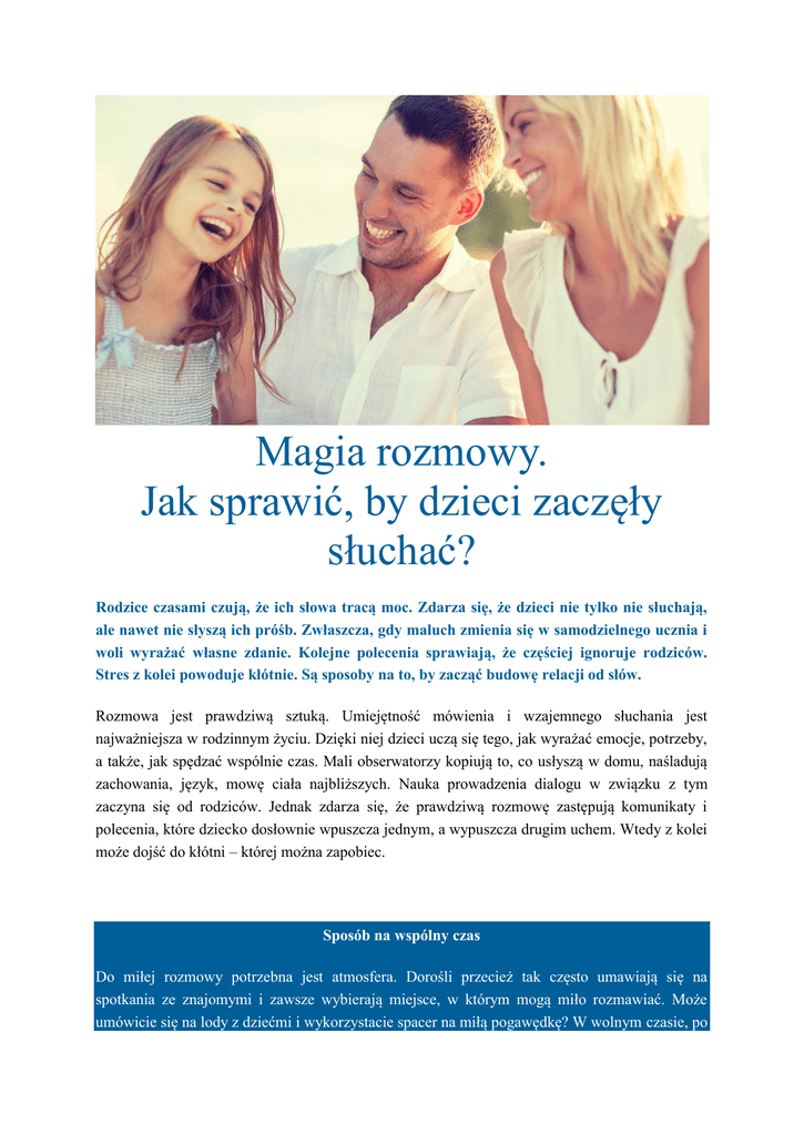 Magia rozmowy. Jak sprawić, by dzieci zaczęły słuchać? Rodzice czasami czują, że ich słowa tracą moc. Zdarza się, że dzieci nie tylko nie słuchają, ale nawet nie słyszą ich próśb. Zwłaszcza, gdy maluch zmienia się w samodzielnego ucznia i woli wyrażać własne zdanie. Kolejne polecenia sprawiają, że częściej ignoruje rodziców. Stres z kolei powoduje kłótnie. Są sposoby na to, by zacząć budowę relacji od słów. Rozmowa jest prawdziwą sztuką. Umiejętność mówienia i wzajemnego słuchania jest najważniejsza w rodzinnym życiu. Dzięki niej dzieci uczą się tego, jak wyrażać emocje, potrzeby, a także, jak spędzać wspólnie czas. Mali obserwatorzy kopiują to, co usłyszą w domu, naśladują zachowania, język, mowę ciała najbliższych. Nauka prowadzenia dialogu w związku z tym zaczyna się od rodziców. Jednak zdarza się, że prawdziwą rozmowę zastępują komunikaty i polecenia, które dziecko dosłownie wpuszcza jednym, a wypuszcza drugim uchem. Wtedy z kolei może dojść do kłótni – której można zapobiec. Sposób na wspólny czas Do miłej rozmowy potrzebna jest atmosfera. Dorośli przecież tak często umawiają się na spotkania ze znajomymi i zawsze wybierają miejsce, w którym mogą miło rozmawiać. Może umówicie się na lody z dziećmi i wykorzystacie spacer na miłą pogawędkę? W wolnym czasie, po pracy, w weekend – masz więcej cierpliwości. Wysłuchaj wtedy wszystkich historii o koleżankach i kolegach albo odpowiedz na zaległe pytania. Spędzajcie czas razem, rozmawiając. Dziecko mówi i słucha z przyjemnością Rytuał rozmowy warto pielęgnować właśnie po to, by słowa stały się sposobem na domowe nieporozumienia, a nie ich źródłem. Pytania o szkołę, o obiad w przedszkolu albo o odrobione lekcje mogą być męczące: zmuszają dziecko do analizowania punktów, które nie są dla niego atrakcyjne w ciągu dnia i rodzą konieczność tłumaczenia się. Rozmowa zaczyna się od ciekawego tematu: np. gdy tato opowie żart, który usłyszał w pracy albo zabawną historię z autobusu. Takie drobiazgi są pretekstem do spontanicznego rodzinnego spotkania na kanapie. W ten sposób maluchy odkrywają przyjemność rozmawiania i słuchania dorosłych. Same zabierają głos, dostrzegają zainteresowanie, które budzą ich historie oraz troskę, gdy opowiadają o problemach. Szacunek dla rozmówcy to podstawa Dziecko również chce, żeby mama wysłuchała tego, co ma jej do powiedzenia. Dlatego warto wprowadzić kilka zasad i unikać nerwowych komunikatów, np.: „Daj mi spokój, wróciłam z pracy, muszę odpocząć!” Łatwo zastąpić zdaniem: „Skarbie, bardzo Cię przepraszam, ale muszę sekundę odpocząć. Miałam ciężki dzień w pracy – opowiem Ci. Zaraz przyjdę do Ciebie, a potem zjemy razem dobry obiad”. Nie zawsze można być perfekcyjnym, dlatego słowo przepraszam bywa tak pomocne, gdy nerwy wezmą górę. Poważne podejście do tematu Gdy w grę wchodzą polecenia, także zadbaj o odpowiednie warunki rozmowy. Przypomnienie o wyrzuceniu śmieci okrzykiem z drugiego pokoju sprawia, że zadanie traci wysoki priorytet: w końcu jest zasygnalizowane niedbale. Specjalnej atmosfery natomiast wymaga rozmowa, która wynika z niewłaściwego zachowania dziecka. Rodzice, którzy chcą podkreślić, że dziecko powinno naprawić błąd, poradzą sobie z tym zadaniem lepiej, gdy najpierw omówią temat razem. Wtedy, już bez nerwów, z pewnym planem rozwiązań, mogą usiąść do spokojnej konwersacji z „winnym”. Zanim wyrazisz opinię lub zdecydujesz o karze, pozwól dziecku na wyjaśnienie sytuacji. Słowa mają znaczenie Ważne, by włączyć niektóre zwroty do codziennych komunikatów. Wystarczy pozornie prosta zmiana „ty” na „ja”. Psychologowie zwracają uwagę na to, że większą skuteczność mają prośby wyrażane poprzez potrzeby i uczucia skierowane do dziecka. Zamiast złościć się, że maluch znowu narzeka na obiad lub nie reaguje na zaproszenie do stołu, warto powiedzieć: „Byłoby mi bardzo miło, gdybyś zjadł obiad. Przygotowałam go specjalnie dla Ciebie”. Gdy karcisz dziecko, również zastosuj tę metodę, pokaż jak ważne jest dla Ciebie grzeczne zachowanie, a skargi nauczycieli sprawiają Ci przykrość. Warto za to zapomnieć o słowach, które blokują porozumienie i mogą być odebrane jako oskarżenie: „ty zawsze…”, „ty nigdy”, „mówiłam ci, że tak będzie”. Zasady udanego dialogu z dzieckiem: Mów, patrząc w oczy dziecku – w czasie rozmowy jesteście sobie równi. Pamiętaj o konsekwencji – nie rzucaj słów na wiatr, jeżeli coś obiecujesz, dotrzymuj danego słowa. Skup się na tym, co mówi maluch i słuchaj go uważnie – okazuj zainteresowanie za pomocą słów i mowy ciała. Używaj magicznych słów: „kocham Cię”, „jesteś taki samodzielny”, „jestem z ciebie dumna” zamiast ciągłych nakazów i zakazów. Zamień polecenia na prośby – pokaż, że to, o co prosisz dziecko, jest dla Ciebie ważne. Dbaj o warunki rozmowy – kiedy rozmawiasz z dzieckiem lub gdy go słuchasz wyłącz telewizor, nie rozmawiaj przez telefon, nie czytaj gazety – poświęć mu całą swoją uwagę. Nie przerywaj dziecku – daj mu możliwość wypowiedzenia całego zdania. Prowadź dialog – używaj zwrotów, które pokażą, że zgadzasz się ze zdaniem dziecka: „tak”, „oczywiście”, „masz rację”. Stosuj parafrazy – czyli powtarzaj swoimi słowami, wypowiedzi dziecka. Staraj się rozszyfrować uczucia dziecka – reaguj, gdy widzisz, że coś je trapi. Pytania to nie wszystko – taki sposób rozmowy może być męczący dla dziecka. Trzymaj nerwy na wodzy – choć to czasem ciężkie zadanie. Przeproś, gdy zareagujesz nerwowo – np. gdy zamiast spokojnej prośby, niegrzecznie potraktujesz dziecko. Przeprosiny uczą dzieci, że z każdej sytuacji jest wyjście. Punktem wyjścia do rozmowy z dzieckiem są uczuc