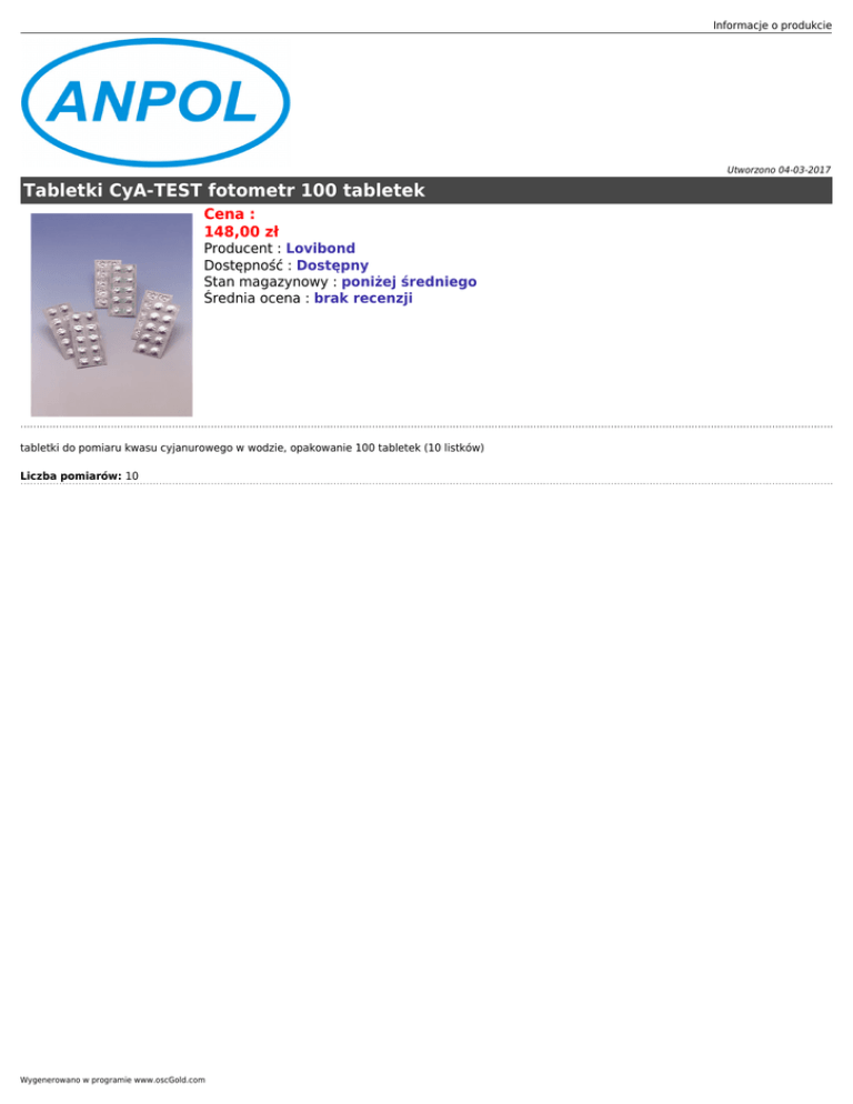 Informacje o produkcie Utworzono 04-03-2017 Tabletki CyA-TEST fotometr 100 tabletek Cena : 148,00 zł Producent : Lovibond Dostępność : Dostępny Stan magazynowy : poniżej średniego Średnia ocena : brak recenzji tabletki do pomiaru kwasu cyjanurowego w wodzie, opakowanie 100 tabletek (10 listków) Liczba pomiarów: 10 Wygenerowano w programie www.oscGold.com