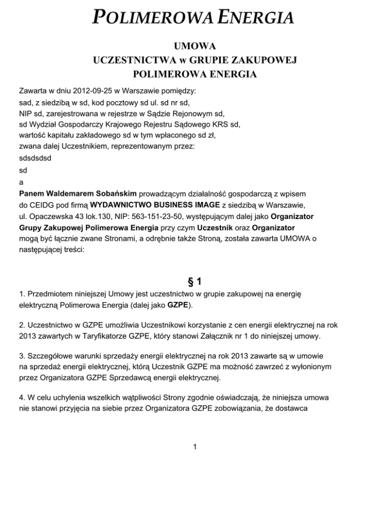 UMOWA UCZESTNICTWA w GRUPIE ZAKUPOWEJ POLIMEROWA ENERGIA Zawarta w dniu 2012-09-25 w Warszawie pomiędzy: sad, z siedzibą w sd, kod pocztowy sd ul. sd nr sd, NIP sd, zarejestrowana w rejestrze w Sądzie Rejonowym sd, sd Wydział Gospodarczy Krajowego Rejestru Sądowego KRS sd, wartość kapitału zakładowego sd w tym wpłaconego sd zł, zwana dalej Uczestnikiem, reprezentowanym przez: sdsdsdsd sd a Panem Waldemarem Sobańskim prowadzącym działalność gospodarczą z wpisem do CEIDG pod firmą WYDAWNICTWO BUSINESS IMAGE z siedzibą w Warszawie, ul. Opaczewska 43 lok.130, NIP: 563-151-23-50, występującym dalej jako Organizator Grupy Zakupowej Polimerowa Energia przy czym Uczestnik oraz Organizator mogą być łącznie zwane Stronami, a odrębnie także Stroną, została zawarta UMOWA o następującej treści: §1 1. Przedmiotem niniejszej Umowy jest uczestnictwo w grupie zakupowej na energię elektryczną Polimerowa Energia (dalej jako GZPE). 2. Uczestnictwo w GZPE umożliwia Uczestnikowi korzystanie z cen energii elektrycznej na rok 2013 zawartych w Taryfikatorze GZPE, który stanowi Załącznik nr 1 do niniejszej umowy. 3. Szczegółowe warunki sprzedaży energii elektrycznej na rok 2013 zawarte są w umowie na sprzedaż energii elektrycznej, którą Uczestnik GZPE ma możność zawrzeć z wyłonionym przez Organizatora GZPE Sprzedawcą energii elektrycznej. 4. W celu uchylenia wszelkich wątpliwości Strony zgodnie oświadczają, że niniejsza umowa nie stanowi przyjęcia na siebie przez Organizatora GZPE zobowiązania, że dostawca 1 energii będzie dostarczał Uczestnikowi energię, w szczególności umowa niniejsza nie stanowi zobowiązania z art. 391 i 393 Kodeksu Cywilnego, a Organizator GZPE jest zwolniony z jakiejkolwiek odpowiedzialności za naruszanie umowy dostawy energii zawartej przez Uczestnika ze wskazanym Sprzedawcą energii. Niniejsza umowa w szczególności nie stanowi także, że Organizator jest sprzedawcą, dostawcą lub dystrybutorem energii. Umowa niniejsza nie stanowi także umowy na obrót lub dostawę energii. §2 1. Uczestnik GZPE deklaruje, iż dokona zakupu energii elektrycznej w roku 2013 u wyłonionego przez Organizatora GZPE Sprzedawcy w łącznej ilości sd MWh. Maksymalne odchylenie od zadeklarowanej ilości energii wynosi 20%. §3 1. Warunkiem uczestnictwa Uczestnika w GZPE jest przystąpienie do GZPE, uiszczenie rocznej opłaty rejestracyjnej na rzecz Organizatora GZPE, zdefiniowanej w regulaminie GZPE, do 07.09.2012 roku. Regulamin GZPE stanowi załącznik do niniejszej umowy. 2. Warunkiem uczestnictwa Uczestnika w GZPE jest przesłanie elektronicznych kopii FV za kupno energii elektrycznej w roku 2012. Ustala się następujący kalendarz tego procesu: FV za okres 01.01.2012 - 31.08.2012: do 31.09.2012 FV za okres 01.09. 2012 - 31.12.2012: do 31.01.2013 FV zostaną przesłane przez Uczestnika GZPE na adres: [email protected] 3. Warunkiem uczestnictwa Uczestnika w GZPE jest przesyłanie elektronicznych kopii FV za kupno energii elektrycznej w roku 2013, w terminie do 7 (siedmiu) dni od dnia otrzymania FV od sprzedawcy energii elektrycznej. FV zostaną przesłane przez Uczestnika GZPE na adres: [email protected] 4. Warunkiem uczestnictwa Uczestnika w GZPE jest terminowe uiszczanie wynagrodzenia przysługującego Organizatorowi GZPE. W przypadku nieterminowego uiszczania wynagrodzenia przez Uczestnika GZPE, Organizator GZPE ma prawo naliczania odsetek ustawowych za zwłokę. 2 5. Warunkiem uczestnictwa Uczestnika w GZPE jest zgoda Uczestnika na zamieszczenie nazwy swojej firmy na stronie internetowej GZPE (www.energia.eplastics.pl). §4 1. Wynagrodzenie Organizatora GZPE stanowi prowizja w wysokości 20% (dwadzieścia procent) od kwoty oszczędności, jakie uzyska Uczestnik GZPE w roku 2013 w porównaniu do kosztów poniesionych na energię w roku 2012 stwierdzonych na podstawie faktur dostarczonych zgodnie z § 3 ust. 2 i 3 powyżej. 2. Wynagrodzenie Organizatora GZPE będzie naliczane w cyklu miesięcznym, począwszy od 01.01.2013. 3. Wynagrodzenie Organizatora GZPE będzie naliczane we wszystkich taryfach i strefach energetycznych, w których pracuje Uczestnik GZPE. 4. Wynagrodzenie Organizatora GZPE będzie naliczane według wzoru: (C12 - C13) x MZ x PR gdzie: C12: cena za jedną MWh (KWh) w PLN netto Uczestnika GZPE w roku 2012 w danym miesiącu. C13: cena za jedną MWH (KWh) w PLN netto Uczestnika GZPE w roku 2013 w danym miesiącu. MZ: miesięczne zużycie energii w danym miesiącu w MWh (kWh) w roku 2013. PR: prowizja (wynagrodzenie) Organizatora GZPE w danym miesiącu. Przy czym dla taryf B comiesięczne rozliczenie nastąpi w MWh, natomiast dla taryf C comiesięczne rozliczenie nastąpi w kWh. 5. Organizator GZPE wystawi każdorazowo FV tytułem wynagrodzenia z terminem płatności 21 (dwudziestu jeden) dni. 6. Uczestnik GZPE zobowiązuje się do opłacenia wystawionej przez Organizatora GZPE FV tytułem wynagrodzenia w terminie 21 (dwudziestu jeden) od daty wystawienia FV przez Organizatora GZPE. 3 7. Maksymalny termin płatności FV wystawionej Uczestnikowi GZPE przez Organizatora GZPE wynosi 30 (trzydzieści) dni od daty wystawienia Uczestnikowi FV za kupno energii elektrycznej przez sprzedawcę energii elektrycznej w danym miesiącu. 8. Uczestnik GZPE wyraża zgodę na otrzymywanie elektronicznych FV wystawionych przez Organizatora GZPE na adres poczty elektronicznej Uczestnika GZPE podany w dalszej części niniejszej umowy. §5 1. Jeżeli Uczestnik GZPE naruszy postanowienia niniejszej umowy (ze szczególnym uwzględnieniem § 3 i § 4) albo Regulaminu GZPE - Organizator GZPE ma prawo rozwiązać niniejszą umowę z zachowaniem trzymiesięcznego okresu wypowiedzenia. Okres wypowiedzenia biegnie począwszy od ostatniego dnia miesiąca kalendarzowego, w którym nastąpiło wypowiedzenie. W takim przypadku Organizator nalicza swoje wynagrodzenie przez cały okres wypowiedzenia. Do obliczenia wynagrodzenia Organizator GZPE użyje średn