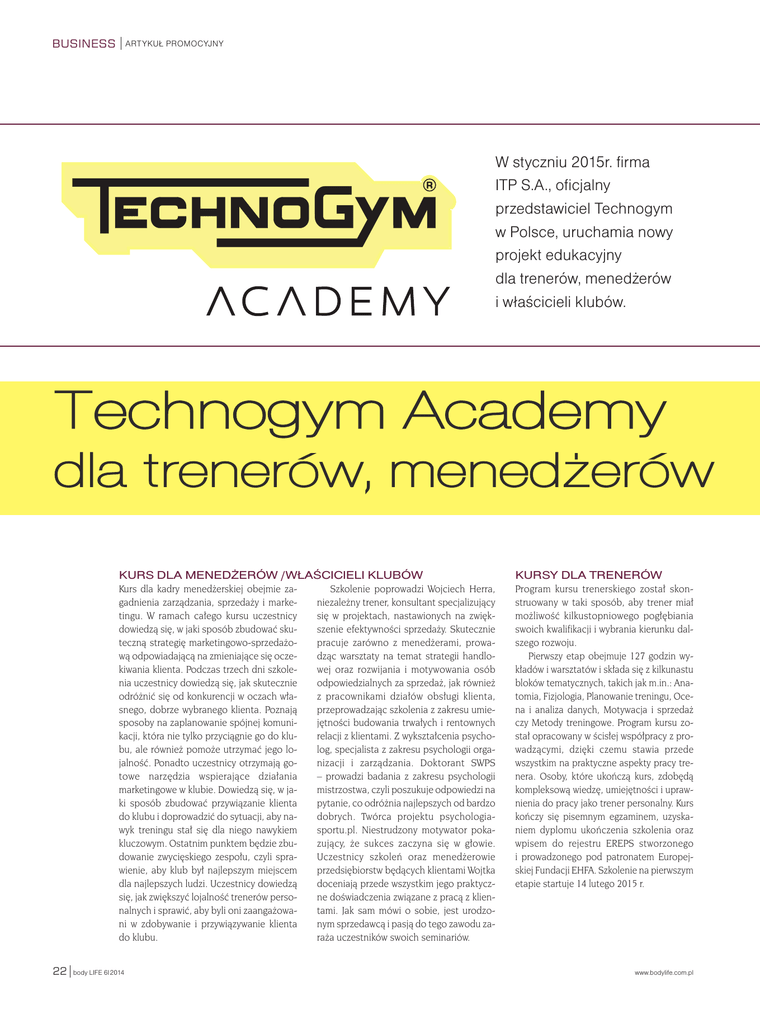 BUSINESS ARTYKUŁ PROMOCYJNY W styczniu 2015r. firma ITP S.A., oficjalny przedstawiciel Technogym w Polsce, uruchamia nowy projekt edukacyjny dla trenerów, menedżerów i właścicieli klubów. Technogym Academy dla trenerów, menedżerów KURS DLA MENEDŻERÓW /WŁAŚCICIELI KLUBÓW Kurs dla kadry mened˝erskiej obejmie zagadnienia zarzàdzania, sprzeda˝y i marketingu. W ramach ca∏ego kursu uczestnicy dowiedzà si´, w jaki sposób zbudowaç skutecznà strategi´ marketingowo-sprzeda˝owà odpowiadajàcà na zmieniajàce si´ oczekiwania klienta. Podczas trzech dni szkolenia uczestnicy dowiedzà si´, jak skutecznie odró˝niç si´ od konkurencji w oczach w∏asnego, dobrze wybranego klienta. Poznajà sposoby na zaplanowanie spójnej komunikacji, która nie tylko przyciàgnie go do klubu, ale równie˝ pomo˝e utrzymaç jego lojalnoÊç. Ponadto uczestnicy otrzymajà gotowe narz´dzia wspierajàce dzia∏ania marketingowe w klubie. Dowiedzà si´, w jaki sposób zbudowaç przywiàzanie klienta do klubu i doprowadziç do sytuacji, aby nawyk treningu sta∏ si´ dla niego nawykiem kluczowym. Ostatnim punktem b´dzie zbudowanie zwyci´skiego zespo∏u, czyli sprawienie, aby klub by∏ najlepszym miejscem dla najlepszych ludzi. Uczestnicy dowiedzà si´, jak zwi´kszyç lojalnoÊç trenerów personalnych i sprawiç, aby byli oni zaanga˝owani w zdobywanie i przywiàzywanie klienta do klubu. 22 body LIFE 6I 2014 Szkolenie poprowadzi Wojciech Herra, niezale˝ny trener, konsultant specjalizujàcy si´ w projektach, nastawionych na zwi´kszenie efektywnoÊci sprzeda˝y. Skutecznie pracuje zarówno z mened˝erami, prowadzàc warsztaty na temat strategii handlowej oraz rozwijania i motywowania osób odpowiedzialnych za sprzeda˝, jak równie˝ z pracownikami dzia∏ów obs∏ugi klienta, przeprowadzajàc szkolenia z zakresu umiej´tnoÊci budowania trwa∏ych i rentownych relacji z klientami. Z wykszta∏cenia psycholog, specjalista z zakresu psychologii organizacji i zarzàdzania. Doktorant SWPS – prowadzi badania z zakresu psychologii mistrzostwa, czyli poszukuje odpowiedzi na pytanie, co odró˝nia najlepszych od bardzo dobrych. Twórca projektu psychologiasportu.pl. Niestrudzony motywator pokazujàcy, ˝e sukces zaczyna si´ w g∏owie. Uczestnicy szkoleƒ oraz mened˝erowie przedsi´biorstw b´dàcych klientami Wojtka doceniajà przede wszystkim jego praktyczne doÊwiadczenia zwiàzane z pracà z klientami. Jak sam mówi o sobie, jest urodzonym sprzedawcà i pasjà do tego zawodu zara˝a uczestników swoich seminariów. KURSY DLA TRENERÓW Program kursu trenerskiego zosta∏ skonstruowany w taki sposób, aby trener mia∏ mo˝liwoÊç kilkustopniowego pog∏´biania swoich kwalifikacji i wybrania kierunku dalszego rozwoju. Pierwszy etap obejmuje 127 godzin wyk∏adów i warsztatów i sk∏ada si´ z kilkunastu bloków tematycznych, takich jak m.in.: Anatomia, Fizjologia, Planowanie treningu, Ocena i analiza danych, Motywacja i sprzeda˝ czy Metody treningowe. Program kursu zosta∏ opracowany w Êcis∏ej wspó∏pracy z prowadzàcymi, dzi´ki czemu stawia przede wszystkim na praktyczne aspekty pracy trenera. Osoby, które ukoƒczà kurs, zdob´dà kompleksowà wiedz´, umiej´tnoÊci i uprawnienia do pracy jako trener personalny. Kurs koƒczy si´ pisemnym egzaminem, uzyskaniem dyplomu ukoƒczenia szkolenia oraz wpisem do rejestru EREPS stworzonego i prowadzonego pod patronatem Europejskiej Fundacji EHFA. Szkolenie na pierwszym etapie startuje 14 lutego 2015 r. www.bodylife.com.pl ARTYKUŁ PROMOCYJNY BUSINESS – nowy projekt edukacyjny i właścicieli klubów Drugi etap kursu b´dzie si´ sk∏ada∏ z kilku modu∏ów tematycznych, które pozwolà trenerom wybraç interesujàce ich zagadnienia i zdecydowaç, w którym kierunku chcà si´ dalej rozwijaç. Planowane jest uruchomienie takich modu∏ów tematycznych jak Sprzeda˝ i Motywacja, Trening Funkcjonalny, Trening w sztukach walki czy Medical Training. Szczegó∏owy plan szkoleƒ b´dzie znany do koƒca tego roku. Trenerzy, którzy wyka˝à si´ najwi´kszà wiedzà i umiej´tnoÊciami, b´dà mieli szans´ wyjechaç na profesjonalny kurs do Wellness Institute dzia∏ajàcego w g∏ównej siedzibie Technogym we W∏oszech i otrzymaç tytu∏ Master Trenera Technogym. B´dzie to ostatni etap kursu trenerskiego w ramach Technogym Academy i jednoczeÊnie wyró˝nienie dla najlepszych uczestników. „Pracujàc nad stworzeniem Technogym Academy, najwa˝niejszy by∏ dla nas przemyÊlany dobór kadry oraz stworzenie kompleksowego programu, dopasowanego do potrzeb rynku. Jestem przekonany, ˝e uda∏o nam si´ to osiàgnàç w 100 proc. Do Paƒstwa dyspozycji oddajemy kurs dla mened˝erów i w∏aÊcicieli klubów fitness, ukierun- www.bodylife.com.pl kowany na zarzàdzanie, motywacj´ i sprzeda˝, prowadzony przez Wojciecha Herr´, który specjalizuje si´ w projektach, nastawionych na zwi´kszenie efektywnoÊci sprzeda˝y. Ponadto jako jedyni na rynku udost´pniamy tak kompleksowy 3-stopniowy kurs dla trenerów personalnych, który daje niesamowite mo˝liwoÊci rozwoju na ka˝dym z etapów. Zaj´cia w ramach kursów poprowadzà specjaliÊci w swojej dziedzinie, którzy skupià si´ na praktycznym aspekcie ka˝dego z zagadnieƒ. Ka˝da osoba, która ukoƒczy kurs, b´dzie w 100 proc. przygotowana do pracy trenera personalnego”. Dominik Śliwowski, Członek Zarządu ITP S.A., General Manager Technogym Polska Dowiedz się więcej na www.technogymacademy.pl Dołącz do nas na Facebooku: www.facebook.com/TechnogymAcademy Najbliższe szkolenia: Club Manager – start: 17 stycznia 2015 Technogym Personal Trainer – start: 14 lutego 2015 Kontakt do organizatora: ITP S.A. ul. Domaniewska 37 02-672 Warszawa tel. 668 470 580 e-mail: [email protected] body LIFE 6I 2014 23