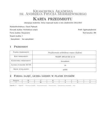 Krakowska Akademia im. Andrzeja Frycza Modrzewskiego Karta przedmiotu obowiązuje studentów, którzy rozpoczęli studia w roku akademickim 2012/2013 WydziałArchitektury i Sztuk Pięknych Kierunek studiów: Architektura wnętrz Profil: Ogólnoakademicki Forma studiów: Stacjonarne Kod kierunku: AW Stopień studiów: I Specjalności: 1 2 bez specjalności Przedmiot Nazwa przedmiotu Projektowanie architektury wnętrz (dyplom) Kod przedmiotu WAISP AWA1S B3 12/13 Kategoria przedmiotu kierunkowe Liczba punktów ECTS 10 Język wykładowy polski Forma zajęć, liczba godzin w planie studiów Semestr 7 W 0 C 90 K 0 S 0 Legenda: W — WykładC — Ćwiczenia/jezykiK — KonwersatoriumS — SeminariumL — Laboratorium/warsztatyI — Inne L 0 I 0 Krakowska Akademia im. Andrzeja Frycza Modrzewskiego 3 Cele przedmiotu Cel 1 Celem przedmiotu jest dostarczenie w oparciu o zakładane efekty kształcenia wiedzy w zakresie świadomego i odpowiedzialnego kształtowania najbliższego otoczenia człowieka; zwrócenie uwagi na rolę edukacji artystycznej społeczeństwa i poprawę jakości życia uzyskiwaną przez realizację myśli projektowej. Cel 2 Celem przedmiotu jest wykształcenie umiejętności tworzenia i realizowania własnych koncepcji projektowych opartych na zróżnicowanych tematycznie założeniach. Wykształcenie kompetencji ukierunkowanych na zdolność do ciągłego rozwijania i interpretowania problemów projektowych. 4 Wymagania wstępne 1 Wiedza z zakresu przedmiotów poprzedzających 5 Modułowe efekty kształcenia MW1 Zna podstawowe zasady funkcjonalne, techniczne i technologiczne związane z projektowaniem i realizacją architektury wnętrz. MW2 Wskazuje powiązania i zależności pomiędzy teoretycznymi i praktycznymi elementami projektowania. MU3 Tworzy i realizuje własne koncepcje projektowe oparte na zróżnicowanych tematycznie założeniach. MU4 Definiuje optymalne dla użytkownika uwarunkowania funkcjonalno-przestrzenne oraz formułuje problemy projektowe i dobiera metody ich rozwiązywania. MU5 Tworzy czytelne prezentacje projektów w formie rysunkowej, modelowej i cyfrowej oraz posiada umiejętność referowania i obrony autorskich projektów. MK6 Samodzielnie rozwija i interpretuje problemy projektowe wykazując się umiejętnościami zbierania, analizowania i interpretowania informacji, rozwijania idei i formułowania krytycznej argumentacji, kierując się wewnętrzną motywacją i właściwą organizacją. MK7 Rozumie potrzebę kontynuacji uczenia się przez całe życie. 6 Treści programowe Lp C1 Ćwiczenia/jezyki Tematyka zajęć Opis szczegółowy bloków tematycznych Wykład wprowadzający: Przestrzenie publiczne, komercyjne, prywatne. Projekt dyplomowy: Wnętrza użyteczności publicznej lub wnętrza mieszkalne. Zagadnienia do wyboru przy realizacji pracy dyplomowej: Przestrzeń edukacji (przedszkola, szkoły); Przestrzenie komercyjne (wnętrza handlowe, wnętrza gastronomiczne); Przestrzeń zamieszkiwania (mieszkania prywatne, hotele); Przestrzeń dla sztuki. Razem 7 Metody dydaktyczne M3. M16. M10. M5. MI1. Ćwiczenia projektowe Wykłady Prezentacje multimedialne Dyskusja Korekty indywidualne i grupowe Strona 2/4 Liczba godzin 90 90 Krakowska Akademia im. Andrzeja Frycza Modrzewskiego 8 Obciążenie pracą studenta Średnia liczba godzin na zrealizowanie aktywności Forma aktywności Godziny kontaktowe z nauczycielem akademickim, w tym: Godziny wynikające z planu studiów 90 Konsultacje przedmiotowe 0 Egzaminy i zaliczenia w sesji 0 Godziny bez udziału nauczyciela akademickiego wynikające z nakładu pracy studenta, w tym: Przygotowanie się do zajęć, w tym studiowanie zalecanej literatury 50 Opracowanie wyników 30 Przygotowanie raportu, projektu, prezentacji, dyskusji 80 Sumaryczna liczba godzin dla przedmiotu wynikająca z 250 całego nakładu pracy studenta 10 Sumaryczna liczba punktów ECTS dla przedmiotu 9 Metody oceny Ocena podsumowująca P2. Egzamin praktyczny Warunki zaliczenia przedmiotu 1 Warunkiem zaliczenia przedmiotu jest sumienność i dokładność w realizacji wszystkich etapów procesu projektowego oraz aktywne uczestnictwo w zajęciach; spełnienie założeń ćwiczeń projektowych; czytelna, twórcza odpowiedź na postawione zadania. Kryteria oceny Na Na Na Na Na 10 ocenę ocenę ocenę ocenę ocenę 3 3.5 4 4.5 5 Projekt Projekt Projekt Projekt Projekt zrealizowany zrealizowany zrealizowany zrealizowany zrealizowany w w w w w stopniu stopniu stopniu stopniu stopniu dostatecznym zadowalającym dobrym znaczącym bardzo dobrym ( wyróżniającym) Macierz realizacji przedmiotu Modułowe efekty kształcenia dla przedmiotu MW1 Odniesienie do efektów kierunkowych Treści programowe K_WO2, K_W09 C1 MW2 K_W08, K_W11 C1 MU1 K_U01, K_U02, K_U03, K_U07, K_U08, K_U09, K_U10, K_U12 C1 Strona 3/4 Metody dydaktyczne M3, M16, M10, M5, MI1 M3, M16, M10, M5, MI1 M3, M16, M10, M5, MI1 Sposoby oceny P2 P2 P2 Krakowska Akademia im. Andrzeja Frycza Modrzewskiego Modułowe efekty kształcenia dla przedmiotu MU3 Odniesienie do efektów kierunkowych K_U07, K_U08, K_U09, K_U10, K_U12 K_U05, K_U06, K_U14, K_U20 MK1 K_K02, K_K06 C1 MK2 K_K01 C1 MU2 11 Treści programowe Metody dydaktyczne Sposoby oceny C1 M3, M16, M10, M5, MI1 P2 C1 M3, M16, M10, M5, MI1 M3, M16, M10, M5, MI1 M3, M16, M10, M5, MI1 P2 P2 P2 Wykaz literatury Literatura podstawowa: [1] E. Neufert — Podręcznik projektowania architektoniczno-budowlanego, Warszawa, 1995, Arkady [2] J. Pile — Historia wnętrz, Warszawa, 2004, Arkady [3] J.Gibbs — Projektowanie Wnętrz, Warszawa, 2008, PWN Literatura uzupełniająca: [1] U. Eco — Jak napisać pracę dyplomową. Poradnik dla humanistów, Warszawa, 2007, Wydawnictwo Uniwersytetu Warszawskiego [2] W. Strzemiński — Teoria widzenia, Kraków, 1958, Wydawnictwo Literackie [3] W. Kandyński — Punkt i linia a płaszczyzna, Warszawa, 1986, PWN [4] R. Arnhem — Sztuka i percepcja wzrokowa. Psychologia twórczego oka, Warszawa, 1978, Wydawnictwo artysty