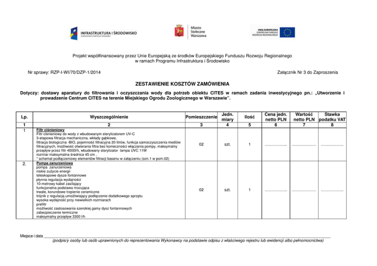 Projekt współfinansowany przez Unie Europejską ze środków Europejskiego Funduszu Rozwoju Regionalnego w ramach Programu Infrastruktura i Środowisko Nr sprawy: RZP-I-WI/70/DZP-1/2014 Załącznik Nr 3 do Zaproszenia ZESTAWIENIE KOSZTÓW ZAMÓWIENIA Dotyczy: dostawy aparatury do filtrowania i oczyszczania wody dla potrzeb obiektu CITES w ramach zadania inwestycyjnego pn.: „Utworzenie i prowadzenie Centrum CITES na terenie Miejskiego Ogrodu Zoologicznego w Warszawie”. Lp. 1 1 2. Wyszczególnienie Pomieszczenie 2 3 Jedn. miary 4 02 02 Filtr ciśnieniowy Filtr ciśnieniowy do wody z wbudowanym sterylizatorem UV-C 3-etapowa filtracja mechaniczna, wkłady gąbkowe, filtracja biologiczna -BIO, pojemność filtracyjna 20 litrów, funkcja samoczyszczenia mediów filtracyjnych, możliwość otwierania filtra bez konieczności włączania pompy, maksymalny przepływ przez filtr 4000l/h, wbudowany sterylizator lampa UVC 11W rozmiar maksymalna średnica 45 cm , * schemat podłączeniowy elementów filtracji basenu w załączeniu (ozn.1 w pom.02) Pompa zanurzeniowa pompa zanurzeniowa niskie zużycie energii teleskopowe dysze fontannowe płynna regulacja wydajności 10-metrowy kabel zasilający funkcjonalna podstawa mocująca trwałe, korundowe trzpienie ceramiczne trójnik z regulacją umożliwiający podłączenie dodatkowego sprzętu wysoka wydajność przy niewielkich rozmiarach prefiltr możliwość zastosowania szerokiej gamy dysz fontannowych zabezpieczenie termiczne maksymalny przepływ 3300 l/h 5 Cena jedn. netto PLN 6 szt. 1 …………….. ……………… …………….. szt. 1 …………….. ……………… …………….. Ilość Wartość Stawka netto PLN podatku VAT 7 8 Miejsce i data ________________________________________________________________________________________________________________________________________ (podpis/y osoby lub osób uprawnionych do reprezentowania Wykonawcy na podstawie odpisu z właściwego rejestru lub ewidencji albo pełnomocnictwa) Nr sprawy: RZP-I-WI/70/DZP-1/2014 3. 4. 5. 6. 7. moc: 40 W wejście ¾ cala, wyjście ¾ cala * schemat podłączeniowy elementów filtracji basenu w załączeniu (ozn.2 w pom.02) Podgrzewacz elektryczny z zabezpieczeniem termicznym Podgrzewacz elektryczny z zabezpieczeniem termicznym (0-45°C ) oraz brakiem przepływu wody. Obudowa z tworzywa, wkład grzałki ze stali kwasoodpornej. Przyłącza wodne 1,5’’. Regulacja temp wody odbywa się za pośrednictwem niezależnego regulatora temperatury. Temperatura otoczenia: - 10° do + 60° C Zasilanie 380V, moc 3kW, klasa ochrony IP40, wymiary 32x14x12 cm (+/- 2cm) * schemat podłączeniowy elementów filtracji basenu w załączeniu (ozn.3 w pom.02) Regulator temperatury Elektroniczny regulator temperatury, zakres pomiarowy 0-45°C. Wyświetlacz LCD wskazuje temperaturę mierzonej wody. Zmiana nastawionej temperatury odbywa się za pośrednictwem potencjometru na obudowie urządzenia. Przez kilka sekund jest widoczna nastawiona temperatura. Długość przewodu czujnika temp 1,5m z możliwością przedłużenia do 10m (2x0,75 mm2). Wymiary: 14 x 12,5 x 8,5 cm (+/- 1cm). Zasilanie: 230 V/50 Hz. Pobór mocy: 1,5 W Przekaźnik: max 2,2 kW. Klasa ochrony: IP 40. Temperatura otoczenia: - 10° do + 60°C * schemat podłączeniowy elementów filtracji basenu w załączeniu (ozn.4 w pom.02) Czujnik przylgowy temperatury Pt 1000 na przewodzie Dz x g 63x10,5 zaciski elektryczne 2, zakres temperatury 0-110stC klasa ochrony IP54 *schemat podłączeniowy elementów filtracji basenu w załączeniu (ozn.5 w pom.02 Filtr zewnętrzny z pompą (utrzymujący parametry wody w basenach zewnętrznych żółwi) pobór mocy (maks.) 18 W Kolor Czarny Wydajność zasilania 600 l/h (+/- 100l) Wymiary (DxSxW) 310 x 100 x 95 mm (+/- 10cm) Napięcie robocze 230 V/50 Hz Długość minimalna kabla 10 m Dalsze dane techniczne Głębokość zanurzenia: maks. 2 m • Temperatura wody: maks. 35°C 02 szt. 1 …………….. ……………… …………….. 02 szt. 1 …………….. ……………… …………….. 02 szt. 1 …………….. ……………… …………….. 06 szt. 2 …………….. ……………… …………….. 08 szt. 1 …………….. ……………… …………….. Urządzenie osmotyczne do oczyszczania wody dla płazów Urządzenie zbudowane na tradycyjnych wkładach. Cztery etapy filtracji wody: 1. 2szt membrany TFC-350 GPD 2. Wkład węglowy wstępny Miejsce i data ________________________________________________________________________________________________________________________________________ (podpis/y osoby lub osób uprawnionych do reprezentowania Wykonawcy na podstawie odpisu z właściwego rejestru lub ewidencji albo pełnomocnictwa) 2 Nr sprawy: RZP-I-WI/70/DZP-1/2014 3. Wkład węglowy szlifujący Zastosowane membrany osmotyczne o wydajności 350 gpd zapewniają czystą i smaczną wodę. W zestawie nie ma potrzeby stosowania zbiornika magazynującego czystą wodę. produkuje wodę na bieżąco - po odkręceniu kranu wody czystej. Wymiary urządzenia: długość: 51,7 cm szerokość: 24,6 cm Min. temperatura wody zasilającej: 4,4’C Max. temperatura wody: 37,7'C Ciśnienie minimalne: 2,8 bara Ciśnienie max: 5,5 bar Wydajność max: 1330 litrów na dobę (zależy od jakości wody) 2 Membrany: 350 GPD Niezbędne zasilanie elektryczne. Wydajność: Realna, testowana wydajność systemu to 1 litr wody uzyskany w ciągu 1 minuty. Ciągła RAZEM NETTO x KWOTA PODATKU VAT x RAZEM BRUTTO x Miejsce i data ________________________________________________________________________________________________________________________________________ (podpis/y osoby lub osób uprawnionych do reprezentowania Wykonawcy na podstawie odpisu z właściwego rejestru lub ewidencji albo pełnomocnictwa) 3