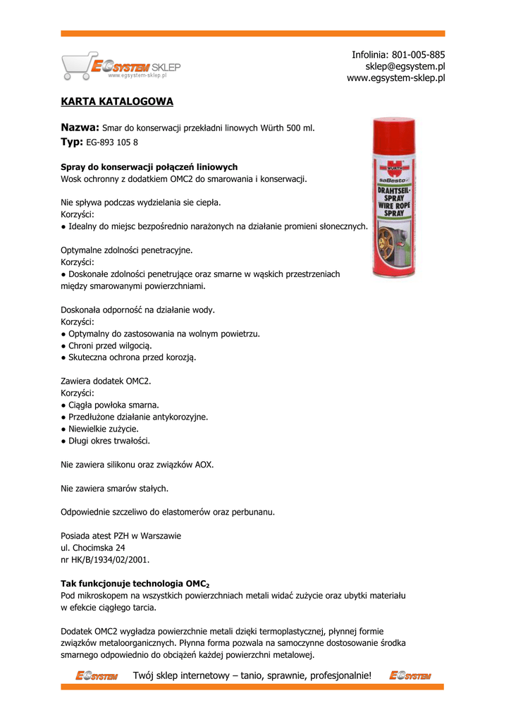 Infolinia: 801-005-885 [email protected] www.egsystem-sklep.pl KARTA KATALOGOWA Nazwa: Smar do konserwacji przekładni linowych Würth 500 ml. Typ: EG-893 105 8 Spray do konserwacji połączeń liniowych Wosk ochronny z dodatkiem OMC2 do smarowania i konserwacji. Nie spływa podczas wydzielania sie ciepła. Korzyści: ● Idealny do miejsc bezpośrednio narażonych na działanie promieni słonecznych. Optymalne zdolności penetracyjne. Korzyści: ● Doskonałe zdolności penetrujące oraz smarne w wąskich przestrzeniach między smarowanymi powierzchniami. Doskonała odporność na działanie wody. Korzyści: ● Optymalny do zastosowania na wolnym powietrzu. ● Chroni przed wilgocią. ● Skuteczna ochrona przed korozją. Zawiera dodatek OMC2. Korzyści: ● Ciągła powłoka smarna. ● Przedłużone działanie antykorozyjne. ● Niewielkie zużycie. ● Długi okres trwałości. Nie zawiera silikonu oraz związków AOX. Nie zawiera smarów stałych. Odpowiednie szczeliwo do elastomerów oraz perbunanu. Posiada atest PZH w Warszawie ul. Chocimska 24 nr HK/B/1934/02/2001. Tak funkcjonuje technologia OMC2 Pod mikroskopem na wszystkich powierzchniach metali widać zużycie oraz ubytki materiału w efekcie ciągłego tarcia. Dodatek OMC2 wygładza powierzchnie metali dzięki termoplastycznej, płynnej formie związków metaloorganicznych. Płynna forma pozwala na samoczynne dostosowanie środka smarnego odpowiednio do obciążeń każdej powierzchni metalowej. Twój sklep internetowy – tanio, sprawnie, profesjonalnie! Infolinia: 801-005-885 [email protected] www.egsystem-sklep.pl ● ● ● ● ● ● Lepsza jakość powierzchni Ciągła powłoka smarna Niewielkie tarcie (do 50% niższe w zakresie tarcia płynnego) Nieznaczny ubytek materiału Niewielkie zużycie Długi okres trwałości Zastosowanie: Do smarowania oraz konserwacji lin metalowych wciągarek, wind, przenośników, wyciągów, jak również lin do podnoszenia ciężarów. Sposób użycia: Elementy oczyścić gruntownie przy użyciu zmywacza LU Art. nr A0890 108. Natryskiwać równomiernie. Powtórne użycie umożliwia powstanie grubej powłoki ochronnej. Dane techniczne System środka smarnego olej smar stały pasta suchy smar ochrona przed korozją Twój sklep internetowy – tanio, sprawnie, profesjonalnie!