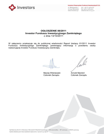 OGŁOSZENIE 88/2011 Investor Funduszu Inwestycyjnego