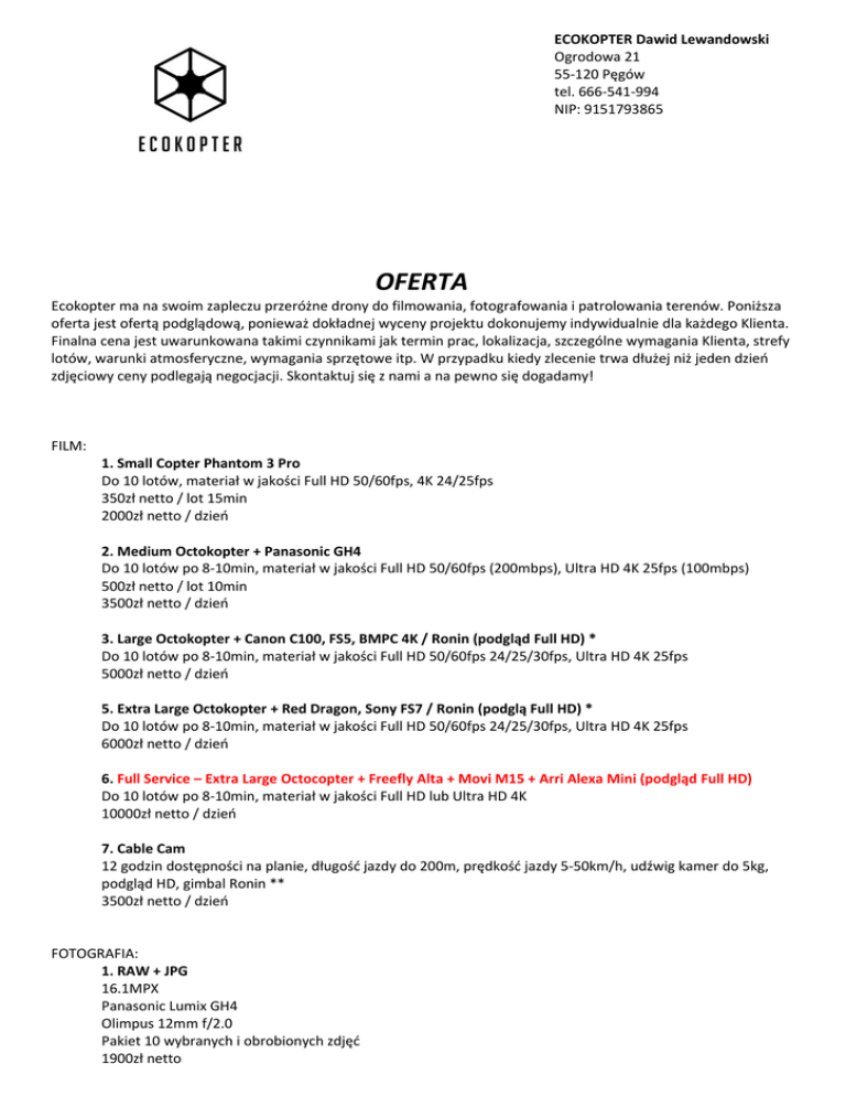 ECOKOPTER Dawid Lewandowski Ogrodowa 21 55-120 Pęgów tel. 666-541-994 NIP: 9151793865 OFERTA Ecokopter ma na swoim zapleczu przeróżne drony do filmowania, fotografowania i patrolowania terenów. Poniższa oferta jest ofertą podglądową, ponieważ dokładnej wyceny projektu dokonujemy indywidualnie dla każdego Klienta. Finalna cena jest uwarunkowana takimi czynnikami jak termin prac, lokalizacja, szczególne wymagania Klienta, strefy lotów, warunki atmosferyczne, wymagania sprzętowe itp. W przypadku kiedy zlecenie trwa dłużej niż jeden dzień zdjęciowy ceny podlegają negocjacji. Skontaktuj się z nami a na pewno się dogadamy! FILM: 1. Small Copter Phantom 3 Pro Do 10 lotów, materiał w jakości Full HD 50/60fps, 4K 24/25fps 350zł netto / lot 15min 2000zł netto / dzień 2. Medium Octokopter + Panasonic GH4 Do 10 lotów po 8-10min, materiał w jakości Full HD 50/60fps (200mbps), Ultra HD 4K 25fps (100mbps) 500zł netto / lot 10min 3500zł netto / dzień 3. Large Octokopter + Canon C100, FS5, BMPC 4K / Ronin (podgląd Full HD) * Do 10 lotów po 8-10min, materiał w jakości Full HD 50/60fps 24/25/30fps, Ultra HD 4K 25fps 5000zł netto / dzień 5. Extra Large Octokopter + Red Dragon, Sony FS7 / Ronin (podglą Full HD) * Do 10 lotów po 8-10min, materiał w jakości Full HD 50/60fps 24/25/30fps, Ultra HD 4K 25fps 6000zł netto / dzień 6. Full Service – Extra Large Octocopter + Freefly Alta + Movi M15 + Arri Alexa Mini (podgląd Full HD) Do 10 lotów po 8-10min, materiał w jakości Full HD lub Ultra HD 4K 10000zł netto / dzień 7. Cable Cam 12 godzin dostępności na planie, długość jazdy do 200m, prędkość jazdy 5-50km/h, udźwig kamer do 5kg, podgląd HD, gimbal Ronin ** 3500zł netto / dzień FOTOGRAFIA: 1. RAW + JPG 16.1MPX Panasonic Lumix GH4 Olimpus 12mm f/2.0 Pakiet 10 wybranych i obrobionych zdjęć 1900zł netto 2. RAW + JPG 16.1MPX Panasonic Lumix GH4 Olimpus 12mm f/2.0 Pakiet 10 wybranych i nieobrobionych zdjęć 1400zł netto 3. RAW + JPG 16.1MPX Panasonic Lumix GH4 Olimpus 12mm f/2.0 Pakiet do 200 zdjęć z całego obiektu (nieselekcjonowane) 1700zł netto WYPOŻYCZALNIA: DJI Ronin – stabilizator do dużych kamer 250zł netto / doba – bez asystenta 650zł netto / dzień – z asystentem TRANSPORT I ZAKWATEROWANIE: Dojazd na zdjęcia do 20km od siedziby firmy jest bezpłatny. Dalsze trasy są liczone 1zł/km netto w dwie strony. W przypadku kiedy konieczny jest nocleg dla naszej ekipy pobieramy opłatę w wysokości 150zł/doba netto. PATROLOWANIE I INNE ZASTOSOWANIA: W celu wyceny niestandardowych zleceń prosimy o kontakt. NAPRAWA I BUDOWA DRONÓW NA ZAMÓWIENIE: W celu wyceny napraw lub budowy urządzeń na zamówienie prosimy o kontakt, ponieważ każde takie zlecenie jest wyceniane i konfigurowane indywidualnie według oczekiwań klienta. * - podana cena bez kamery i optyki ** - do obsługi cable cam są potrzebne minimum 2 osoby, tj. operator cable cama i osoba techniczna. W cenę nie jest wliczony operator gimbala (Ronin bądź Movi) oraz kamera z osprzętem. Na założenie instalacji jezdnej potrzebne są około 2 godziny. W czasie jednego znia zdjęciowego produktywnie jesteśmy w stanie rozłożyć 3 instalacje do różnych ujęć. [email protected] www.ecokopter.pl www.fb.com/ecokopter