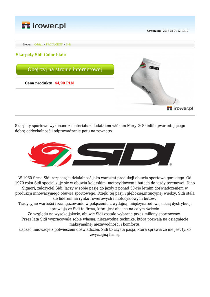 Utworzono: 2017-03-04 12:19:19 Menu: Odzież > PRODUCENT > Sidi Skarpety Sidi Color białe Obejrzyj na stronie internetowej Cena produktu: 44,90 PLN Skarpety sportowe wykonane z materiału z dodatkiem włókien Meryl® Skinlife gwarantującego dobrą oddychalność i odprowadzanie potu na zewnątrz. W 1960 firma Sidi rozpoczęła działalność jako warsztat produkcji obuwia sportowo-górskiego. Od 1970 roku Sidi specjalizuje się w obuwiu kolarskim, motocyklowym i butach do jazdy terenowej. Dino Signori, założyciel Sidi, łączy w sobie pasję do jazdy z ponad 50-cio letnim doświadczeniem w produkcji innowacyjnego obuwia sportowego. Dzięki tej pasji i głębokiej,intuicyjnej wiedzy, Sidi stała się liderem na rynku rowerowych i motocyklowych butów. Tradycyjne wartości i zaangażowanie w połączeniu z wydajną, międzynarodową siecią dystrybucji sprawiają że Sidi to firma, która jest obecna na całym świecie. Ze względu na wysoką jakość, obuwie Sidi zostało wybrane przez miliony sportowców. Przez lata Sidi wypracowała sobie własną, niezawodną technikę, która pozwala na osiągnięcie maksymalnej niezawodności i komfortu. Łącząc innowacje z półwieczem doświadczeń, Sidi to czysta pasja, która sprawia że nie jest tylko zwyczajną firmą. Kolor Adres: www.erowery.pl [email protected] Biały_#FFFFFF Adres: www.irower.pl Telefon: 605 515 185, 34 361 16 71 Email: [email protected] Email: