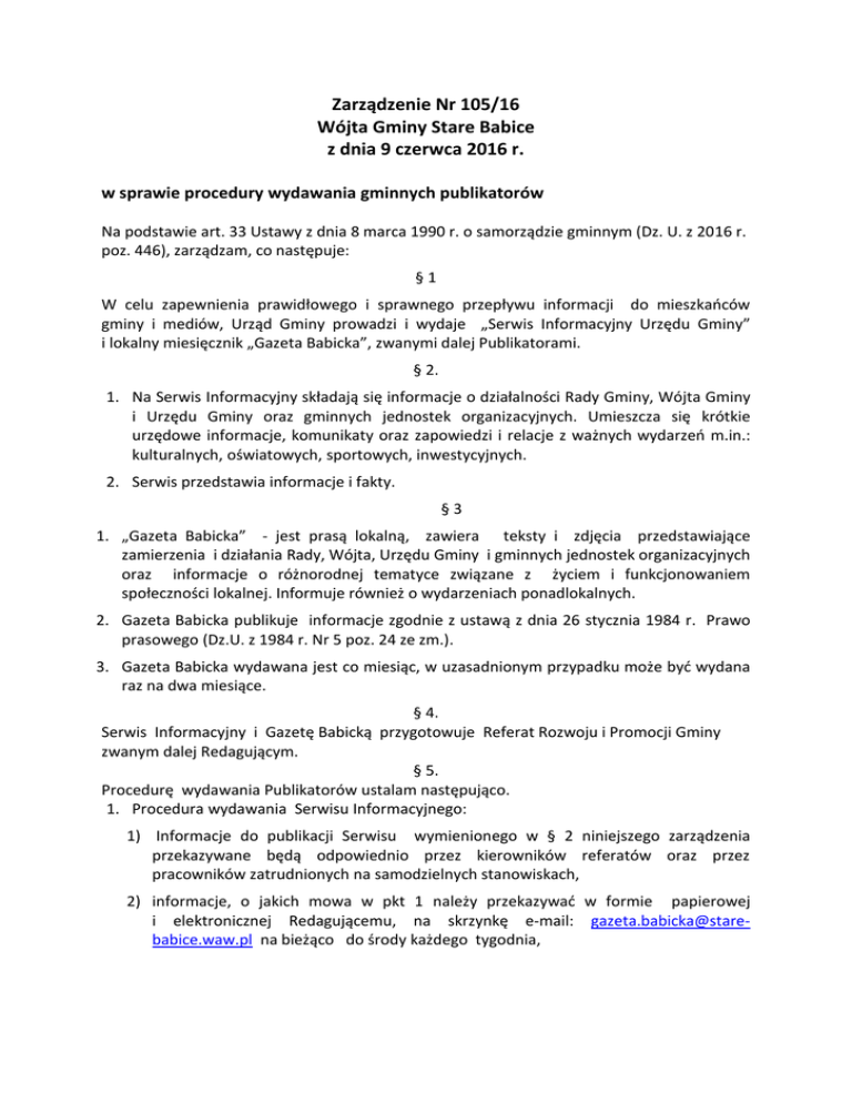Zarządzenie Nr 105/16 Wójta Gminy Stare Babice z dnia 9 czerwca 2016 r. w sprawie procedury wydawania gminnych publikatorów Na podstawie art. 33 Ustawy z dnia 8 marca 1990 r. o samorządzie gminnym (Dz. U. z 2016 r. poz. 446), zarządzam, co następuje: §1 W celu zapewnienia prawidłowego i sprawnego przepływu informacji do mieszkańców gminy i mediów, Urząd Gminy prowadzi i wydaje „Serwis Informacyjny Urzędu Gminy” i lokalny miesięcznik „Gazeta Babicka”, zwanymi dalej Publikatorami. § 2. 1. Na Serwis Informacyjny składają się informacje o działalności Rady Gminy, Wójta Gminy i Urzędu Gminy oraz gminnych jednostek organizacyjnych. Umieszcza się krótkie urzędowe informacje, komunikaty oraz zapowiedzi i relacje z ważnych wydarzeń m.in.: kulturalnych, oświatowych, sportowych, inwestycyjnych. 2. Serwis przedstawia informacje i fakty. §3 1. „Gazeta Babicka” - jest prasą lokalną, zawiera teksty i zdjęcia przedstawiające zamierzenia i działania Rady, Wójta, Urzędu Gminy i gminnych jednostek organizacyjnych oraz informacje o różnorodnej tematyce związane z życiem i funkcjonowaniem społeczności lokalnej. Informuje również o wydarzeniach ponadlokalnych. 2. Gazeta Babicka publikuje informacje zgodnie z ustawą z dnia 26 stycznia 1984 r. Prawo prasowego (Dz.U. z 1984 r. Nr 5 poz. 24 ze zm.). 3. Gazeta Babicka wydawana jest co miesiąc, w uzasadnionym przypadku może być wydana raz na dwa miesiące. § 4. Serwis Informacyjny i Gazetę Babicką przygotowuje Referat Rozwoju i Promocji Gminy zwanym dalej Redagującym. § 5. Procedurę wydawania Publikatorów ustalam następująco. 1. Procedura wydawania Serwisu Informacyjnego: 1) Informacje do publikacji Serwisu wymienionego w § 2 niniejszego zarządzenia przekazywane będą odpowiednio przez kierowników referatów oraz przez pracowników zatrudnionych na samodzielnych stanowiskach, 2) informacje, o jakich mowa w pkt 1 należy przekazywać w formie papierowej i elektronicznej Redagującemu, na skrzynkę e-mail: [email protected] na bieżąco do środy każdego tygodnia, a) Redagujący przygotowuje Serwis Informacyjny w ciągu 2 dni od dnia otrzymania informacji w terminie określonym w pkt. 2 i podaje go się do publicznej wiadomości w formie: i. papierowej, która zostaje wywieszana na tablicach ogłoszeń usytuowanych na terenie Gminy i na tablicy ogłoszeń w Urzędzie Gminy, ii. elektronicznej, który jest umieszczany na stronie internetowej gminy www.stare-babice.waw.pl oraz przesyłany do odbiorców Newslettera Babickiego 3) informacje zawarte w Serwisie mogą być również opublikowane w prasie lokalnej – Gazecie Babickiej lub innych mediach, 4) Serwis ukazuje się co tydzień, do piątku, a w uzasadnionych przypadkach co dwa tygodnie. 2. Procedura wydawania Gazety Babickiej 1) Informacje do publikacji w Gazecie Babickiej wymienionej w § 3 niniejszego zarządzenia przekazywane będą odpowiednio przez kierowników referatów oraz przez pracowników zatrudnionych na samodzielnych stanowiskach, 2) informacje, o jakich mowa w pkt 1 mogą być przekazywane Redagującemu w formie papierowej i elektronicznej, na skrzynkę e-mail: [email protected] do dnia 2-go każdego miesiąca lub w dwóch etapach: a) wstępną informacje o konieczności umieszczenia w Gazecie Babickiej określonego tematu i jego objętości należy zgłaszać do dnia 2-go każdego miesiąca, b) ostateczny materiał przesłać najpóźniej do 10 dnia każdego miesiąca 3) z zebranych informacji Redagujący redaguje teksty, przygotowuje materiały, zdjęcia do publikacji w Gazety Babickiej, w terminie do 18 dnia każdego miesiąca, a następnie cały materiał przekazuje do druku. 4) Gazetę Babicką podaje się do publicznej wiadomości: a) w formie papierowej i rozpowszechnia się poprzez umieszczanie w wyznaczonych punktach na terenie gminy, b) w formie elektronicznej i umieszcza się na stronie internetowej gminy www.stare-babice.waw.pl, może być również wysyłany do odbiorców Newslettera Babickiego. 5) Wydawanie Gazety Babickiej powinno nastąpić raz w miesiącu, nie później niż w ostatnim dniu miesiąca, w uzasadnionych przypadkach gazeta może być wydana w pierwszych dniach następnego miesiąca. § 6. Redagujący Publikatory poza zadaniami określonymi w § 4 i § 5 niniejszego zarządzenia zobowiązany jest do: 1) przestrzegania ustawy prawo prasowe powołanej w § 3 ust 2 2) archiwizowania Publikatorów. § 7. 1. Osobami odpowiedzialnymi za przekazywanie informacji do Publikatorów są kierownicy komórek organizacyjnych, pracownicy zatrudnieni na samodzielnych stanowiskach urzędniczych. a podczas ich nieobecności wyznaczeni przez nich pracownicy 2. Osobą odpowiedzialną za realizację i ostateczne zredagowanie informacji zawartych w Publikatorach jest Kierownik Referatu Rozwoju i Promocji Gminy. 3. Osobą odpowiedzialną za realizację zadań związanych z umieszczaniem serwisu Informacyjnego na tablicach ogłoszeń zlokalizowanych na terenie gminy oraz Gazety Babickiej w wyznaczonych punktach, jest Kierownik Referatu Organizacji i Kadr. § 8. Wykonanie Zarządzenia powierzam kierownictwu urzędu, kierownikom referatów i pracownikom na samodzielnych stanowiskach pracy w Urzędzie Gminy Stare Babice. § 9. Uchylam Zarządzenie Nr 231/05 Wójta Gminy Stare Babice z dnia 23 grudnia 2005 r. w sprawie procedury działania samorządowego serwisu informacyjnego. § 10 Zarządzenie wchodzi w życie z dniem podpisania. Wójt (-) Krzysztof Turek
