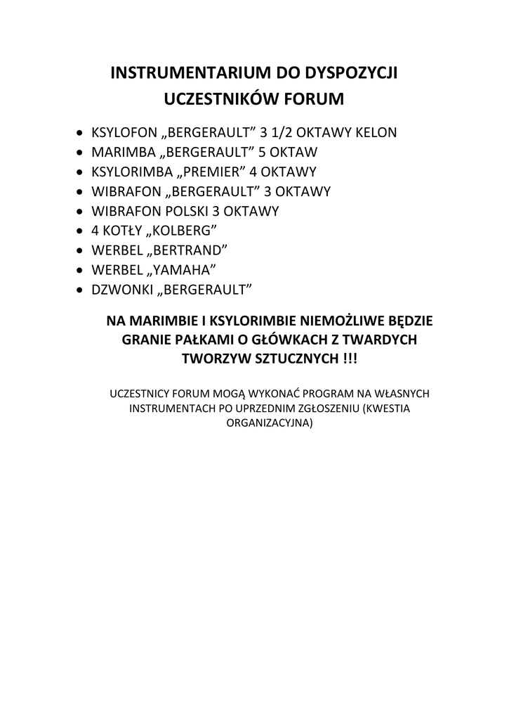 INSTRUMENTARIUM DO DYSPOZYCJI UCZESTNIKÓW FORUM • • • • • • • • • KSYLOFON „BERGERAULT” 3 1/2 OKTAWY KELON MARIMBA „BERGERAULT” 5 OKTAW KSYLORIMBA „PREMIER” 4 OKTAWY WIBRAFON „BERGERAULT” 3 OKTAWY WIBRAFON POLSKI 3 OKTAWY 4 KOTŁY „KOLBERG” WERBEL „BERTRAND” WERBEL „YAMAHA” DZWONKI „BERGERAULT” NA MARIMBIE I KSYLORIMBIE NIEMOŻLIWE BĘDZIE GRANIE PAŁKAMI O GŁÓWKACH Z TWARDYCH TWORZYW SZTUCZNYCH !!! UCZESTNICY FORUM MOGĄ WYKONAĆ PROGRAM NA WŁASNYCH INSTRUMENTACH PO UPRZEDNIM ZGŁOSZENIU (KWESTIA ORGANIZACYJNA)