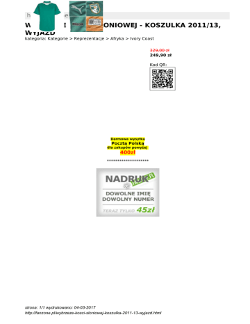 http://fanzone.pl WYBRZEŻE KOŚCI SŁONIOWEJ - KOSZULKA 2011/13, WYJAZD kategoria: Kategorie > Reprezentacje > Afryka > Ivory Coast 329,00 zł 249,90 zł Kod QR: Darmowa wysyłka Pocztą Polską dla zakupów powyżej 400zł ******************** strona: 1/1 wydrukowano: 04-03-2017 http://fanzone.pl/wybrzeze-kosci-sloniowej-koszulka-2011-13-wyjazd.html