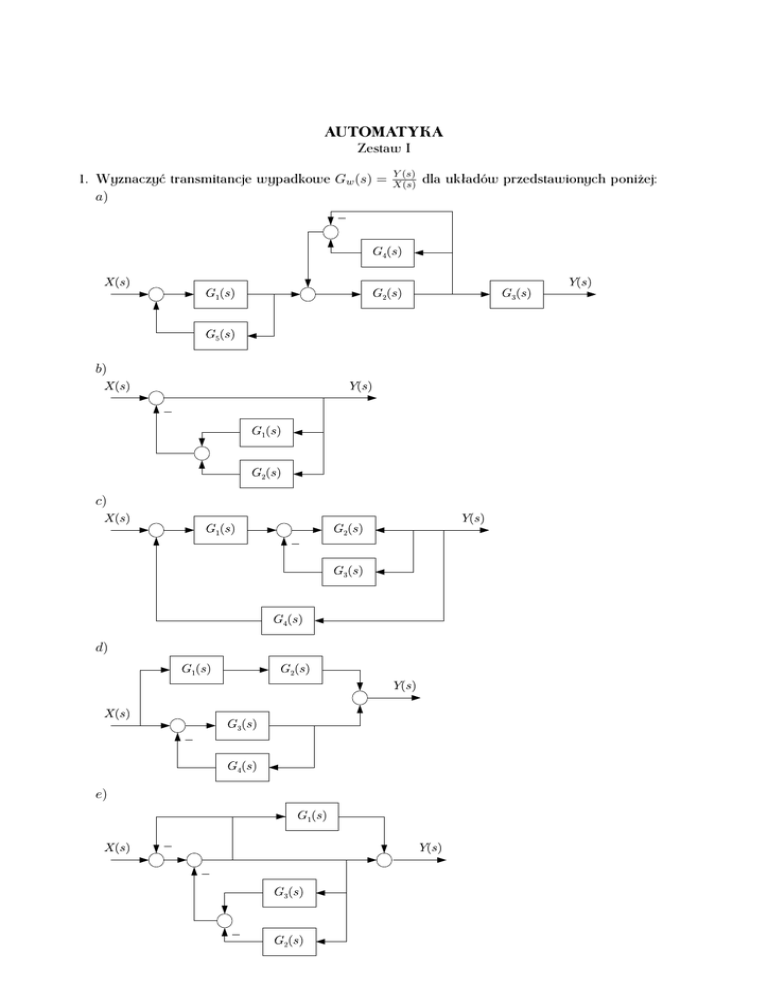 AUTOMATYKA Zestaw I 1. Wyznaczyć transmitancje wypadkowe Gw (s) = a) b) c) d) e) Y (s) X(s) dla układów przedstawionych poniżej: 2. Obiekt przetwarza sygnał u(t) na sygnał y(t). Sygnał u(t)ma postać: Narysować sygnały y(t), jeżeli obiekt: • mnoży sygnał u(t) przez 7, • mnoży sygnał u(t) przez −5, • różniczkuje sygnał u(t), • całkuje sygnał u(t).