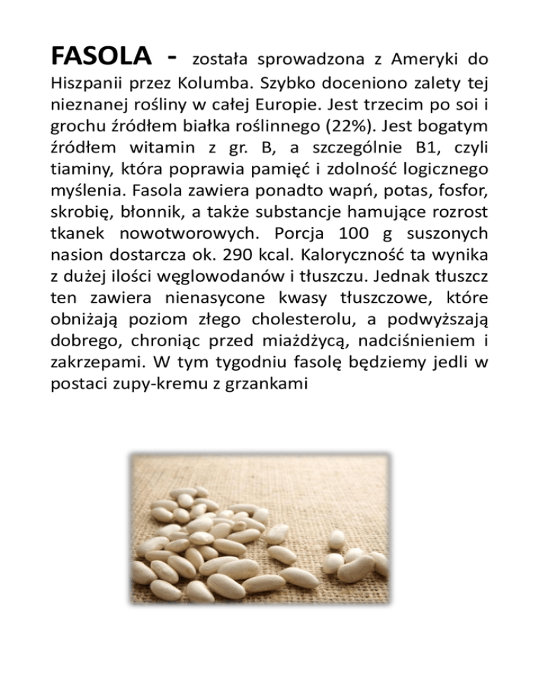 FASOLA - została sprowadzona z Ameryki do Hiszpanii przez Kolumba. Szybko doceniono zalety tej nieznanej rośliny w całej Europie. Jest trzecim po soi i grochu źródłem białka roślinnego (22%). Jest bogatym źródłem witamin z gr. B, a szczególnie B1, czyli tiaminy, która poprawia pamięć i zdolność logicznego myślenia. Fasola zawiera ponadto wapń, potas, fosfor, skrobię, błonnik, a także substancje hamujące rozrost tkanek nowotworowych. Porcja 100 g suszonych nasion dostarcza ok. 290 kcal. Kaloryczność ta wynika z dużej ilości węglowodanów i tłuszczu. Jednak tłuszcz ten zawiera nienasycone kwasy tłuszczowe, które obniżają poziom złego cholesterolu, a podwyższają dobrego, chroniąc przed miażdżycą, nadciśnieniem i zakrzepami. W tym tygodniu fasolę będziemy jedli w postaci zupy-kremu z grzankami