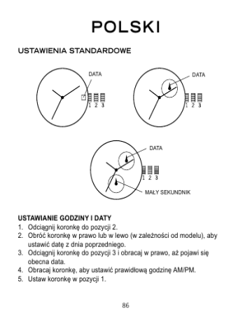 Polski USTAWIENIA STANDARDOWE data data data MAŁY SEKUNDNIK USTAWIANIE GODZINY I DATY 1. Odciągnij koronkę do pozycji 2. 2. Obróć koronkę w prawo lub w lewo (w zależności od modelu), aby ustawić datę z dnia poprzedniego. 3. Odciągnij koronkę do pozycji 3 i obracaj w prawo, aż pojawi się obecna data. 4. Obracaj koronkę, aby ustawić prawidłową godzinę AM/PM. 5. Ustaw koronkę w pozycji 1. 86 MECHANIZM Z TRZEMA WSKAZÓWKAMI, WSKAZANIA DNIA I DATY 2405 data DZIEŃ TYGODNIA USTAWIANIE GODZINY, DATY I DNIA TYGODNIA 1. Odciągnij koronkę do pozycji 2 i obróć w lewo, aby ustawić datę z dnia poprzedniego. 2. Przekręć koronkę w prawo, aby ustawić dzień tygodnia z dnia poprzedniego. 3. Odciągnij koronkę do pozycji 3 i obracaj w prawo, aż pojawi się obecna data i dzień tygodnia. Obracaj koronkę, aby ustawić prawidłową godzinę AM/PM. 4. Ustaw koronkę w pozycji 1. UWAGA: Aby zapewnić dokładność zegarka, nie należy ustawiać daty w godzinach od 21:00 do 1:00. 87 MECHANIZM AUTOMATYCZNY 82S5 1. Aby rozpocząć odmierzanie czasu, należy obrócić koronkę w pozycji 1 15–20 razy. 2. Odciągnij koronkę do pozycji 2 i obróć, aby ustawić godzinę. 3. Ustaw koronkę w pozycji 1. UWAGA: Zegarek z mechanizmem automatycznego naciągu nakręca się automatycznie podczas noszenia zegarka na ręku. Mechanizm nie zawiera baterii. W związku z tym, jeśli zegarek nie jest noszony przez kilka kolejnych dni, rezerwa chodu może ulec wyczerpaniu. Jeśli zegarek zatrzyma się, zalecamy ręczne nakręcenie zegarka poprzez obracanie koronką w prawo, aby uzyskać wymaganą rezerwę chodu. Istotne jest, aby odpowiednio wyregulować zegarek do rozmiaru nadgarstka. Zbyt luźne dopasowanie może spowodować niewystarczający automatyczny naciąg. Gdy zegarek jest w pełni nakręcony, jego rezerwa chodu wystarczy na około 40 godzin pracy. 88 CHRONOGRAF VD53B WSKAZÓWKA 24-GODZINNA WSKAZÓWKA MINUTOWA WSKAZÓWKA SEKUNDOWA USTAWIANIE GODZINY I DATY 1. Przed ustawieniem godziny należy upewnić się, że chronograf jest zatrzymany i wyzerowany (pozycja 12:00). 2. Odciągnij koronkę do pozycji 2. 3. Obracaj koronkę w prawo, aż pojawi się data z dnia poprzedniego. 4. Odciągnij koronkę do pozycji 3, gdy wskazówka sekundowa znajduje się w pozycji 12:00. 5. Obracaj koronkę, aby ustawić godzinę. UWAGA: Wskazówka 24-godzinna porusza się odpowiednio ze wskazówką godzinową i minutową. Przy ustawianiu godziny należy upewnić się, że wskazówka 24-godzinna jest prawidłowo ustawiona. 6. Ustaw koronkę w pozycji 1. UWAGA: Gdy koronka znajduje się w pozycji 2, nie naciskaj przycisków, ponieważ wskazówki chronografu będą się poruszać CHRONOGRAF 1. Naciśnij przycisk A, aby uruchomić/zatrzymać chronograf. 2. Naciśnij przycisk B, aby wyzerować. 89 PODZIAŁ CZASU 1. Naciśnij B, gdy chronograf jest uruchomiony. 2. Naciśnij ponownie B, aby wrócić do chronografu. 3. Naciśnij A, aby zakończyć odmierzanie czasu. 4. Naciśnij B, aby wyzerować. ZEROWANIE CHRONOGRAFU 1. Jeśli którakolwiek ze wskazówek chronografu nie znajduje się w pozycji zerowej (12:00), odciągnij koronkę do pozycji 3. 2. Naciśnij przycisk A, aby przesunąć wskazówki w prawo. Naciśnij przycisk B, aby przesunąć wskazówki do tyłu. 3. Ustaw koronkę w pozycji 1. CHRONOGRAF ISA 8171/201 WSKAZÓWKA SEKUNDOWA LICZNIK MINUT CHRONOGRAFU LICZNIK 1/5 SEKUNDY CHRONOGRAFU DATA USTAWIANIE GODZINY I DATY 1. Odciągnij koronkę do pozycji 2 i obróć w prawo, aby ustawić datę z dnia poprzedniego. 2. Odciągnij koronkę do pozycji 3 i obracaj w prawo, aż pojawi się prawidłowa data. 3. Obracaj koronkę, aby ustawić prawidłową godzinę AM/PM. 90 4. Ustaw koronkę w pozycji 1. UWAGA: Aby zapewnić dokładność zegarka, nie należy ustawiać daty w godzinach od 21:00 do 00:30. OBSŁUGA CHRONOGRAFU 1. Naciśnij przycisk A, aby uruchomić/zatrzymać chronograf. 2. Naciśnij B, aby wyzerować. UWAGA: Po 2 godzinach ciągłego działania chronograf automatycznie zatrzyma się i wyzeruje aby zapewnić oszczędność baterii. PODZIAŁ CZASU 1. Naciśnij B, gdy chronograf jest uruchomiony. 2. Naciśnij ponownie B, aby wrócić do chronografu. 3. Naciśnij A, aby zakończyć odmierzanie czasu. 4. Naciśnij B, aby wyzerować. ZEROWANIE CHRONOGRAFU Jeśli przynajmniej jedna ze wskazówek chronografu nie znajduje się w prawidłowej pozycji zerowej (12:00) po naciśnięciu przycisku B (np. po wymianie baterii): 1. Odciągnij koronkę do pozycji 2. 2. Naciśnij przycisk B, aby wyzerować licznik minut. Każde naciśnięcie przycisku B spowoduje przesunięcie wskazówki minutowej chronografu o jedną jednostkę do przodu. Naciśnij i przytrzymaj przycisk B, aby przyspieszyć przesuwanie. 3. Naciśnij A, aby wyzerować licznik 1/5 sekundy. Każde naciśnięcie przycisku B spowoduje przesunięcie wskazówki 1/5 sekundy chronografu o jedną jednostkę do przodu. Naciśnij i przytrzymaj przycisk B, aby przyspieszyć przesuwanie. 91 CHRONOGRAF VD51B WSKAZÓWKA SEKUNDOWA CHRONOGRAFU DATA WSKAZÓWKA MINUTOWA CHRONOGRAFU USTAWIANIE GODZINY/DNIA 1. Przed ustawieniem godziny należy upewnić się, że wskazówka sekundowa i minutowa chronografu jest ustawiona w pozycji 12:00 i chronograf nie jest uruchomiony. Należy zapoznać się z poniższymi instrukcjami obsługi. 2. Odciągnij koronkę do pozycji 2 i obróć w prawo, aby ustawić datę z dnia poprzedniego. 3. Odciągnij koronkę do pozycji 3, gdy wskazówka sekundowa znajduje się w pozycji 12:00. Wskazówka sekundowa zatrzyma się. 4. Obracaj koronkę w prawo, aż w okienku daty pojawi się prawidłowa data. 5. Obracaj koronkę, aby ustawić prawidłową godzinę AM/PM. 6. Ustaw koronkę w pozycji 1. UWAGA: Gdy koronka znajduje się w pozycji 2, nie naciskaj przycisków. W przeciwnym razie wskazówki chronografu zaczną się poruszać. UWAGA: Aby zapewnić dokładność zegarka, nie należy ustawiać daty w godzinach od 21:00 do 1:00. 92 OBSŁUGA CHRONOGRAFU 1
