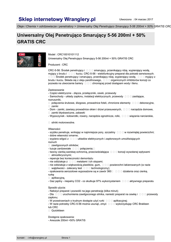 Sklep internetowy Wranglery.pl Utworzono : 04 marzec 2017 Oleje i Chemia > odrdzewiacze i penetratory > Uniwersalny Olej Penetrująco Smarujący 5-56 200ml + 50% GRATIS CRC Uniwersalny Olej Penetrująco Smarujący 5-56 200ml + 50% GRATIS CRC Model : CRC10010101112 Uniwersalny Olej Penetrująco Smarujący 5-56 200ml + 50% GRATIS CRC Producent : CRC CRC-5-56: Środek penetrujący i smarujący, przenikający rdzę, wypierający wodę, myjący z brudu i kurzu. CRC-5-56 - wielofunkcyjny preparat dla potrzeb serwisowych. Środek penetrujący i smarujący, przenikający rdzę, wypierający wodę, myjący z brudu i kurzu. Składa się z oleju parafinowego, organicznych inhibitorów korozji co pozwala na utworzenie bariery chroniącej przed dostępem wody i tlenu. Zastosowanie - Części elektryczne - złącza, przełączniki, cewki, przewody - Samochody - układy zapłonu, instalacji elektrycznych, przewody zasilające, rozruszniki, � połączenia śrubowe, ślizgowe, prowadnice foteli, chronione elementy dekoracyjne, � zamki - Dom - zamki, zawiasy prowadnice okien i drzwi przesuwanych, narzędzia domowe, � zamki błyskawiczne, zabawki - Wypoczynek - kołowrotki, rowery, narzędzia ogrodnicze, rolki, wiązania narciarskie, � silniki motorowodne. Własności: - szybko penetruje, wnikając w najmniejsze pory, szczeliny w rozwiniętej powierzchni; - dobre własności smarne; - wypiera wilgoć z układów elektrycznych i zapłonowych umożliwiających rozruch � zawilgoconych silników; - luzuje zardzewiałe połączenia;� - tworzy cienką warstwę ochronną, przeciwdziałająca korozji wywołanej wpływami � atmosferycznymi; - reperuje bez konieczności demontażu - nie oddziałuje z metalami i ich stopami; - nie oddziałuje z większością plastików, gum, powierzchni lakierowanych (w razie � wątpliwości - zalecany test technologiczny); - opakowania aerozolowe wyposażone są w zawór 360� działania oraz cienką rurkę � aplikacyjną. - Gaz pędny - niepalny CO2 - co skutkuje 97% wykorzystaniem aktywnego preparatu Sposób użycia: - Nałożyć preparat i pozwolić na jego penetrację (kilka minut); - Dla uruchomienia zawilgoconego silnika, nanieść preparat na cewkę i przewody zapłonu; - W przestrzeniach o trudnym dostępie użyć rurki aplikacyjnej; - W razie potrzeby CRC-5-56 można usunąć, zmyć wykorzystując CRC Brakleen lub CRC � Quickkleen Dostępne opakowania: - Areozole 200ml +50% GRATIS kontakt : - [email protected] Strona 1 Sklep internetowy Wranglery.pl Utworzono : 04 marzec 2017 Oleje i Chemia > odrdzewiacze i penetratory > Uniwersalny Olej Penetrująco Smarujący 5-56 200ml + 50% GRATIS CRC Uniwersalny Olej Penetrująco Smarujący 5-56 200ml + 50% GRATIS CRC Dane techniczne (bez gazu pędnego) Kolor: przeźroczysta ciecz o lekko bursztynowym zabarwieniu Ciężar właściwy ( 20�C ): 0,82 g/cm� Punkt zamarzania: < -50�C Punkt zapłonu: 78�C Grubość warstwy (24 godz., 20�C ): 1-2u Wydajność z 1l (20�C ) : 100m� Odporność termiczna: 120�C ( 150�C - narażenie chwilowe ) Cena : 16,99 zł Brutto ( 13,93 zł Netto) Dostępność: Produkt dostępny w naszym sklepie od 28 listopad 2010 kontakt : - [email protected] Strona 2