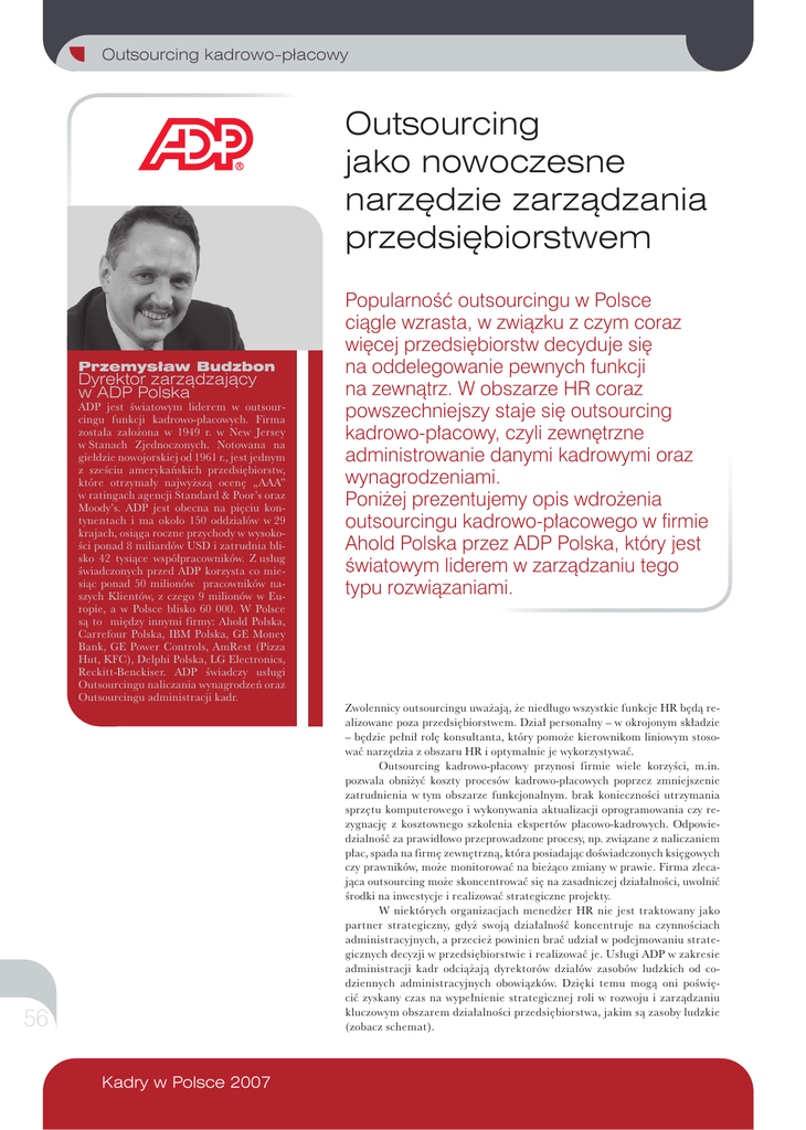 Outsourcing kadrowo-płacowy Outsourcing jako nowoczesne narzędzie zarządzania przedsiębiorstwem Przemysław Budzbon Dyrektor zarządzający w ADP Polska ADP jest światowym liderem w outsourcingu funkcji kadrowo-płacowych. Firma została założona w 1949 r. w New Jersey w Stanach Zjednoczonych. Notowana na giełdzie nowojorskiej od 1961 r., jest jednym z sześciu amerykańskich przedsiębiorstw, które otrzymały najwyższą ocenę „AAA” w ratingach agencji Standard & Poor’s oraz Moody’s. ADP jest obecna na pięciu kontynentach i ma około 150 oddziałów w 29 krajach, osiąga roczne przychody w wysokości ponad 8 miliardów USD i zatrudnia blisko 42 tysiące współpracowników. Z usług świadczonych przed ADP korzysta co miesiąc ponad 50 milionów pracowników naszych Klientów, z czego 9 milionów w Europie, a w Polsce blisko 60 000. W Polsce są to między innymi firmy: Ahold Polska, Carrefour Polska, IBM Polska, GE Money Bank, GE Power Controls, AmRest (Pizza Hut, KFC), Delphi Polska, LG Electronics, Reckitt-Benckiser. ADP świadczy usługi Outsourcingu naliczania wynagrodzeń oraz Outsourcingu administracji kadr. Popularność outsourcingu w Polsce ciągle wzrasta, w związku z czym coraz więcej przedsiębiorstw decyduje się na oddelegowanie pewnych funkcji na zewnątrz. W obszarze HR coraz powszechniejszy staje się outsourcing kadrowo-płacowy, czyli zewnętrzne administrowanie danymi kadrowymi oraz wynagrodzeniami. Poniżej prezentujemy opis wdrożenia outsourcingu kadrowo-płacowego w firmie Ahold Polska przez ADP Polska, który jest światowym liderem w zarządzaniu tego typu rozwiązaniami. Zwolennicy outsourcingu uważają, że niedługo wszystkie funkcje HR będą realizowane poza przedsiębiorstwem. Dział personalny – w okrojonym składzie – będzie pełnił rolę konsultanta, który pomoże kierownikom liniowym stosować narzędzia z obszaru HR i optymalnie je wykorzystywać. Outsourcing kadrowo-płacowy przynosi firmie wiele korzyści, m.in. pozwala obniżyć koszty procesów kadrowo-płacowych poprzez zmniejszenie zatrudnienia w tym obszarze funkcjonalnym. brak konieczności utrzymania sprzętu komputerowego i wykonywania aktualizacji oprogramowania czy rezygnację z kosztownego szkolenia ekspertów płacowo-kadrowych. Odpowiedzialność za prawidłowo przeprowadzone procesy, np. związane z naliczaniem płac, spada na firmę zewnętrzną, która posiadając doświadczonych księgowych czy prawników, może monitorować na bieżąco zmiany w prawie. Firma zlecająca outsourcing może skoncentrować się na zasadniczej działalności, uwolnić środki na inwestycje i realizować strategiczne projekty. W niektórych organizacjach menedżer HR nie jest traktowany jako partner strategiczny, gdyż swoją działalność koncentruje na czynnościach administracyjnych, a przecież powinien brać udział w podejmowaniu strategicznych decyzji w przedsiębiorstwie i realizować je. Usługi ADP w zakresie administracji kadr odciążają dyrektorów działów zasobów ludzkich od codziennych administracyjnych obowiązków. Dzięki temu mogą oni poświęcić zyskany czas na wypełnienie strategicznej roli w rozwoju i zarządzaniu kluczowym obszarem działalności przedsiębiorstwa, jakim są zasoby ludzkie (zobacz schemat). 56 Kadry w Polsce 2007