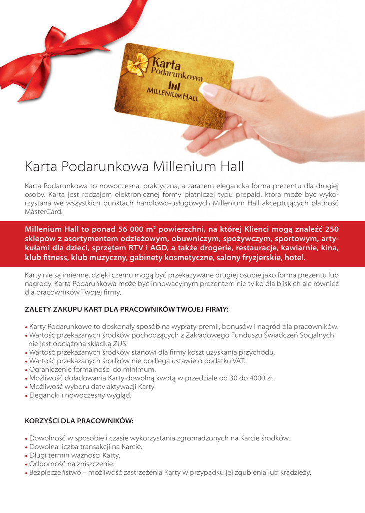 Karta Podarunkowa Millenium Hall Karta Podarunkowa to nowoczesna, praktyczna, a zarazem elegancka forma prezentu dla drugiej osoby. Karta jest rodzajem elektronicznej formy płatniczej typu prepaid, która może być wykorzystana we wszystkich punktach handlowo-usługowych Millenium Hall akceptujących płatność MasterCard. Millenium Hall to ponad 56 000 m2 powierzchni, na której Klienci mogą znaleźć 250 sklepów z asortymentem odzieżowym, obuwniczym, spożywczym, sportowym, artykułami dla dzieci, sprzętem RTV i AGD, a także drogerie, restauracje, kawiarnie, kina, klub fitness, klub muzyczny, gabinety kosmetyczne, salony fryzjerskie, hotel. Karty nie są imienne, dzięki czemu mogą być przekazywane drugiej osobie jako forma prezentu lub nagrody. Karta Podarunkowa może być innowacyjnym prezentem nie tylko dla bliskich ale również dla pracowników Twojej firmy. ZALETY ZAKUPU KART DLA PRACOWNIKÓW TWOJEJ FIRMY: • Karty Podarunkowe to doskonały sposób na wypłaty premii, bonusów i nagród dla pracowników. • Wartość przekazanych środków pochodzących z Zakładowego Funduszu Świadczeń Socjalnych nie jest obciążona składką ZUS. • Wartość przekazanych środków stanowi dla firmy koszt uzyskania przychodu. • Wartość przekazanych środków nie podlega ustawie o podatku VAT. • Ograniczenie formalności do minimum. • Możliwość doładowania Karty dowolną kwotą w przedziale od 30 do 4000 zł. • Możliwość wyboru daty aktywacji Karty. • Elegancki i nowoczesny wygląd. KORZYŚCI DLA PRACOWNIKÓW: • Dowolność w sposobie i czasie wykorzystania zgromadzonych na Karcie środków. • Dowolna liczba transakcji na Karcie. • Długi termin ważności Karty. • Odporność na zniszczenie. • Bezpieczeństwo – możliwość zastrzeżenia Karty w przypadku jej zgubienia lub kradzieży. UŻYTKOWANIE KARTY Transakcji Kartą można dokonywać we wszystkich punktach handlowo-usługowych na terenie Centrum Kulturalno-Handlowego Millenium Hall gdzie istnieje możliwość płatności kartą MasterCard. Karta działa na tych samych zasadach co zwykłe karty płatnicze. Transakcji w sklepach dokonuje się poprzez przeciągnięcie Karty przez terminal i autoryzację za pomocą podpisu użytkownika. Jest to bezpieczna i wygodna forma płatności. Okres ważności Karty to jeden rok od daty aktywacji. Środki zgromadzone na Karcie można wydać dowolną liczbą transakcji, w dowolnej ilości punktów handlowo-usługowych, aż do wyczerpania limitu środków. Stan konta na Karcie można sprawdzić w Punkcie Informacyjnym Millenium Hall, na stronie www.flex-e-card.pl lub dzwoniąc pod numer +48 22 490 69 23. Regulamin Karty dostępny jest na www.milleniumhall.pl KONTAKT Marcela Mianowska tel. 663 224 026 email: [email protected]