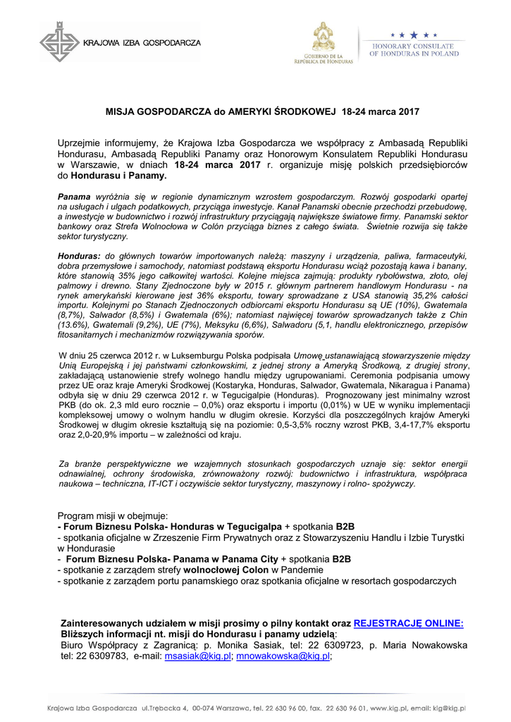 MISJA GOSPODARCZA do AMERYKI ŚRODKOWEJ 18-24 marca 2017 Uprzejmie informujemy, że Krajowa Izba Gospodarcza we współpracy z Ambasadą Republiki Hondurasu, Ambasadą Republiki Panamy oraz Honorowym Konsulatem Republiki Hondurasu w Warszawie, w dniach 18-24 marca 2017 r. organizuje misję polskich przedsiębiorców do Hondurasu i Panamy. Panama wyróżnia się w regionie dynamicznym wzrostem gospodarczym. Rozwój gospodarki opartej na usługach i ulgach podatkowych, przyciąga inwestycje. Kanał Panamski obecnie przechodzi przebudowę, a inwestycje w budownictwo i rozwój infrastruktury przyciągają największe światowe firmy. Panamski sektor bankowy oraz Strefa Wolnocłowa w Colón przyciąga biznes z całego świata. Świetnie rozwija się także sektor turystyczny. Honduras: do głównych towarów importowanych należą: maszyny i urządzenia, paliwa, farmaceutyki, dobra przemysłowe i samochody, natomiast podstawą eksportu Hondurasu wciąż pozostają kawa i banany, które stanowią 35% jego całkowitej wartości. Kolejne miejsca zajmują: produkty rybołówstwa, złoto, olej palmowy i drewno. Stany Zjednoczone były w 2015 r. głównym partnerem handlowym Hondurasu - na rynek amerykański kierowane jest 36% eksportu, towary sprowadzane z USA stanowią 35,2% całości importu. Kolejnymi po Stanach Zjednoczonych odbiorcami eksportu Hondurasu są UE (10%), Gwatemala (8,7%), Salwador (8,5%) i Gwatemala (6%); natomiast najwięcej towarów sprowadzanych także z Chin (13.6%), Gwatemali (9,2%), UE (7%), Meksyku (6,6%), Salwadoru (5,1, handlu elektronicznego, przepisów fitosanitarnych i mechanizmów rozwiązywania sporów. W dniu 25 czerwca 2012 r. w Luksemburgu Polska podpisała Umowę ustanawiającą stowarzyszenie między Unią Europejską i jej państwami członkowskimi, z jednej strony a Ameryką Środkową, z drugiej strony, zakładającą ustanowienie strefy wolnego handlu między ugrupowaniami. Ceremonia podpisania umowy przez UE oraz kraje Ameryki Środkowej (Kostaryka, Honduras, Salwador, Gwatemala, Nikaragua i Panama) odbyła się w dniu 29 czerwca 2012 r. w Tegucigalpie (Honduras). Prognozowany jest minimalny wzrost PKB (do ok. 2,3 mld euro rocznie – 0,0%) oraz eksportu i importu (0,01%) w UE w wyniku implementacji kompleksowej umowy o wolnym handlu w długim okresie. Korzyści dla poszczególnych krajów Ameryki Środkowej w długim okresie kształtują się na poziomie: 0,5-3,5% roczny wzrost PKB, 3,4-17,7% eksportu oraz 2,0-20,9% importu – w zależności od kraju. Za branże perspektywiczne we wzajemnych stosunkach gospodarczych uznaje się: sektor energii odnawialnej, ochrony środowiska, zrównoważony rozwój: budownictwo i infrastruktura, współpraca naukowa – techniczna, IT-ICT i oczywiście sektor turystyczny, maszynowy i rolno- spożywczy. Program misji w obejmuje: - Forum Biznesu Polska- Honduras w Tegucigalpa + spotkania B2B - spotkania oficjalne w Zrzeszenie Firm Prywatnych oraz z Stowarzyszeniu Handlu i Izbie Turystki w Hondurasie - Forum Biznesu Polska- Panama w Panama City + spotkania B2B - spotkanie z zarządem strefy wolnocłowej Colon w Pandemie - spotkanie z zarządem portu panamskiego oraz spotkania oficjalne w resortach gospodarczych Zainteresowanych udziałem w misji prosimy o pilny kontakt oraz REJESTRACJĘ ONLINE: Bliższych informacji nt. misji do Hondurasu i panamy udzielą: Biuro Współpracy z Zagranicą: p. Monika Sasiak, tel: 22 6309723, p. Maria Nowakowska tel: 22 6309783, e-mail: [email protected]; [email protected];