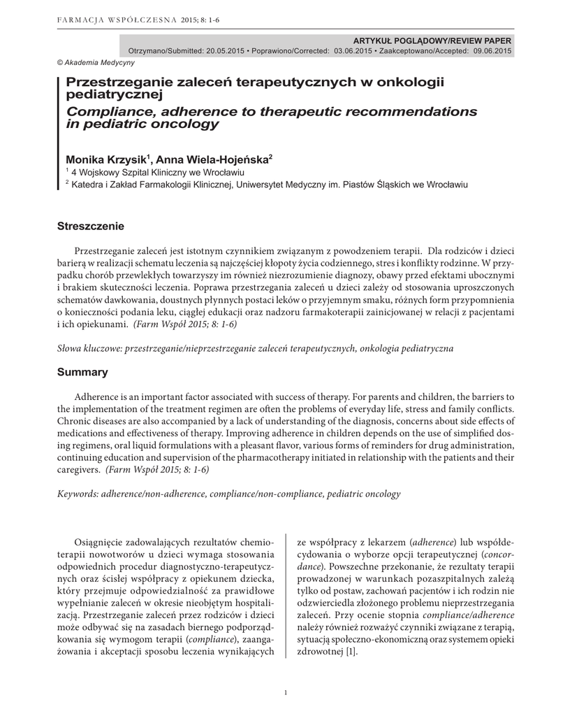 1 FA R M A C J A W S P Ó Ł C Z E S N A 2015; 8: 1-6 ARTYKUŁ POGLĄDOWY/REVIEW PAPER Otrzymano/Submitted: 20.05.2015 • Poprawiono/Corrected: 03.06.2015 • Zaakceptowano/Accepted: 09.06.2015 © Akademia Medycyny Przestrzeganie zaleceń terapeutycznych w onkologii pediatrycznej Compliance, adherence to therapeutic recommendations in pediatric oncology Monika Krzysik1, Anna Wiela-Hojeńska2 1 2 4 Wojskowy Szpital Kliniczny we Wrocławiu Katedra i Zakład Farmakologii Klinicznej, Uniwersytet Medyczny im. Piastów Śląskich we Wrocławiu Streszczenie Przestrzeganie zaleceń jest istotnym czynnikiem związanym z powodzeniem terapii. Dla rodziców i dzieci barierą w realizacji schematu leczenia są najczęściej kłopoty życia codziennego, stres i konflikty rodzinne. W przypadku chorób przewlekłych towarzyszy im również niezrozumienie diagnozy, obawy przed efektami ubocznymi i brakiem skuteczności leczenia. Poprawa przestrzegania zaleceń u dzieci zależy od stosowania uproszczonych schematów dawkowania, doustnych płynnych postaci leków o przyjemnym smaku, różnych form przypomnienia o konieczności podania leku, ciągłej edukacji oraz nadzoru farmakoterapii zainicjowanej w relacji z pacjentami i ich opiekunami. (Farm Współ 2015; 8: 1-6) Słowa kluczowe: przestrzeganie/nieprzestrzeganie zaleceń terapeutycznych, onkologia pediatryczna Summary Adherence is an important factor associated with success of therapy. For parents and children, the barriers to the implementation of the treatment regimen are often the problems of everyday life, stress and family conflicts. Chronic diseases are also accompanied by a lack of understanding of the diagnosis, concerns about side effects of medications and effectiveness of therapy. Improving adherence in children depends on the use of simplified dosing regimens, oral liquid formulations with a pleasant flavor, various forms of reminders for drug administration, continuing education and supervision of the pharmacotherapy initiated in relationship with the patients and their caregivers. (Farm Współ 2015; 8: 1-6) Keywords: adherence/non-adherence, compliance/non-compliance, pediatric oncology Osiągnięcie zadowalających rezultatów chemioterapii nowotworów u dzieci wymaga stosowania odpowiednich procedur diagnostyczno-terapeutycznych oraz ścisłej współpracy z opiekunem dziecka, który przejmuje odpowiedzialność za prawidłowe wypełnianie zaleceń w okresie nieobjętym hospitalizacją. Przestrzeganie zaleceń przez rodziców i dzieci może odbywać się na zasadach biernego podporządkowania się wymogom terapii (compliance), zaangażowania i akceptacji sposobu leczenia wynikających ze współpracy z lekarzem (adherence) lub współdecydowania o wyborze opcji terapeutycznej (concordance). Powszechne przekonanie, że rezultaty terapii prowadzonej w warunkach pozaszpitalnych zależą tylko od postaw, zachowań pacjentów i ich rodzin nie odzwierciedla złożonego problemu nieprzestrzegania zaleceń. Przy ocenie stopnia compliance/adherence należy również rozważyć czynniki związane z terapią, sytuacją społeczno-ekonomiczną oraz systemem opieki zdrowotnej [1]. 1 FA R M A C J A W S P Ó Ł C Z E S N A 2015; 8: 1-6 Czynniki związane z pacjentem i jego opiekunem oraz terapią prowadzi do rozwoju zagrażającej życiu mielosupresji. Nasilone ryzyko działań niepożądanych dotyczy pacjentów dziedziczących allele wariantowe TPMT3*A, TPMT3*C, TPMT*2 [8]. Czy pochodzenie etniczne ma wpływ na występowanie problemów z przestrzeganiem zaleceń w onkologii dziecięcej? Odpowiedź nie jest jednoznaczna. Brak przestrzegania zaleceń podczas terapii 6-MP stwierdzano częściej wśród dzieci Afroamerykanów, Azjatów i Latynosów w porównaniu do białych Amerykanów [3,6]. Jednak według Pollock i wsp. większa śmiertelność pediatrycznej populacji afroamerykańskiej i latynoskiej z ostrą białaczką limfoblastyczną nie miała związku z compliance, ale wynikała z różnic farmakogenetycznych warunkujących odpowiedź na chemioterapię [9]. Istotnym utrudnieniem realizacji zaleceń terapeutycznych w onkologii pediatrycznej jest niedostateczna liczba komercyjnych preparatów dostosowanych do potrzeb dzieci. Uzyskanie np. dokładnej pożądanej dawki merkaptopuryny z dostępnej postaci tabletek 50 mg jest bardzo trudne. Dopiero w 2012 roku dopuszczono do obrotu w krajach Unii Europejskiej merkaptopurynę w formie zawiesiny doustnej o smaku malinowym (Xaluprine), która umożliwia dozowanie z dokładnością do 2 mg [10]. Ryzyko wznowy choroby nowotworowej na skutek niewłaściwej realizacji zaleceń wskazuje, że ocena przestrzegania reżimu terapeutycznego powinna stanowić dodatkowy czynnik prognostyczny w ostrej białaczce limfoblastycznej u dzieci [11]. Według raportu WHO przestrzeganie zaleceń terapeutycznych wśród dzieci i nastolatków wynosi od 43% do 100%, średnio 58% w krajach rozwiniętych. U niemowląt i małych dzieci zależy od zdolności rodzica lub opiekuna do właściwego zrozumienia i postępowania według wytycznych, natomiast starsze dzieci uczą się postępowania terapeutycznego pod kontrolą opiekuna [1]. W warunkach domowych zapominanie o konieczności podania leku dziecku wynikające z roztargnienia rodzica jest najczęstszą przyczyną non-adherence. Odstępstwa od zaleceń mają również związek ze znaczną ceną leku, niechęcią do postaci preparatu, obawą przed wystąpieniem działań niepożądanych, poprawą samopoczucia i zdrowia dziecka, barierą emocjonalną oraz brakiem wiary w skuteczność zleconego leczenia [12]. Realizację zaleceń terapeutycznych w onkologii pediatrycznej często zakłócają błędy popełniane podczas podania leku. Analiza dokumentacji medycznej 117 wizyt ambulatoryjnych w jednej z klinik onkologii Niepowodzenia w realizacji założeń leczenia onkologicznego mogą być spowodowane powikłaniami chemioterapii. Ich wystąpienie lub nasilenie u dzieci determinują