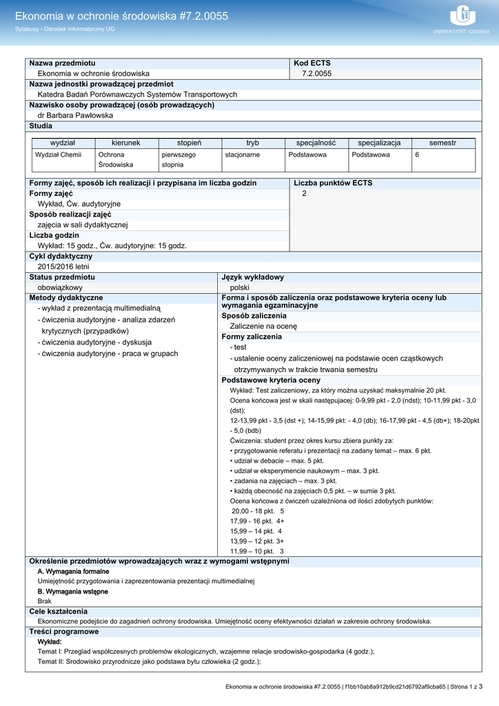 Ekonomia w ochronie środowiska #7.2.0055 Sylabusy - Ośrodek Informatyczny UG Nazwa przedmiotu Ekonomia w ochronie środowiska Nazwa jednostki prowadzącej przedmiot Katedra Badań Porównawczych Systemów Transportowych Nazwisko osoby prowadzącej (osób prowadzących) dr Barbara Pawłowska Studia wydział Wydział Chemii kierunek Ochrona Środowiska stopień pierwszego stopnia Kod ECTS 7.2.0055 tryb stacjonarne specjalność Podstawowa specjalizacja Podstawowa semestr 6 Formy zajęć, sposób ich realizacji i przypisana im liczba godzin Liczba punktów ECTS Formy zajęć 2 Wykład, Ćw. audytoryjne Sposób realizacji zajęć zajęcia w sali dydaktycznej Liczba godzin Wykład: 15 godz., Ćw. audytoryjne: 15 godz. Cykl dydaktyczny 2015/2016 letni Status przedmiotu Język wykładowy obowiązkowy polski Metody dydaktyczne Forma i sposób zaliczenia oraz podstawowe kryteria oceny lub wymagania egzaminacyjne - wykład z prezentacją multimedialną Sposób zaliczenia - ćwiczenia audytoryjne - analiza zdarzeń Zaliczenie na ocenę krytycznych (przypadków) Formy zaliczenia - ćwiczenia audytoryjne - dyskusja - test - ćwiczenia audytoryjne - praca w grupach - ustalenie oceny zaliczeniowej na podstawie ocen cząstkowych otrzymywanych w trakcie trwania semestru Podstawowe kryteria oceny Wykład: Test zaliczeniowy, za który można uzyskać maksymalnie 20 pkt. Ocena końcowa jest w skali następujacej: 0-9,99 pkt - 2,0 (ndst); 10-11,99 pkt - 3,0 (dst); 12-13,99 pkt - 3,5 (dst +); 14-15,99 pkt: - 4,0 (db); 16-17,99 pkt - 4,5 (db+); 18-20pkt - 5,0 (bdb) Ćwiczenia: student przez okres kursu zbiera punkty za: • przygotowanie referatu i prezentacji na zadany temat – max. 6 pkt. • udział w debacie – max. 5 pkt. • udział w eksperymencie naukowym – max. 3 pkt. • zadania na zajęciach – max. 3 pkt. • każdą obecność na zajęciach 0,5 pkt. – w sumie 3 pkt. Ocena końcowa z ćwiczeń uzależniona od ilości zdobytych punktów: 20,00 - 18 pkt. 5 17,99 - 16 pkt. 4+ 15,99 – 14 pkt. 4 13,99 – 12 pkt. 3+ 11,99 – 10 pkt. 3 Określenie przedmiotów wprowadzających wraz z wymogami wstępnymi A. Wymagania formalne Umiejętność przygotowania i zaprezentowania prezentacji multimedialnej B. Wymagania wstępne Brak Cele kształcenia Ekonomiczne podejście do zagadnień ochrony środowiska. Umiejętność oceny efektywności działań w zakresie ochrony środowiska. Treści programowe Wykład: Temat I: Przeglad współczesnych problemów ekologicznych, wzajemne relacje srodowisko-gospodarka (4 godz.); Temat II: Srodowisko przyrodnicze jako podstawa bytu człowieka (2 godz.); Ekonomia w ochronie środowiska #7.2.0055 | f1bb10ab8a912b9cd21d6792af9cba65 | Strona 1 z 3 Ekonomia w ochronie środowiska #7.2.0055 Sylabusy - Ośrodek Informatyczny UG • Społeczne aspekty wykorzystania srodowiska; • Prawne aspekty wykorzystania srodowiska; • Ekonomiczne aspekty wykorzystania srodowiska; Temat III: Gospodarowanie jako proces racjonalnego wykorzystania materii i energii (3 godz.); • Fizyczny wymiar procesów gospodarowania; • Zasoby i czynniki produkcji; • Rola energii w procesach gospodarowania; Temat IV: Zagadnienia ekologiczne w teorii ekonomii (2 godz.); • Ekologizacja gospodarki i ekonomizacja srodowiska; • Efektywność rynku w warunkach doskonałej konkurencji i jego zawodność przy występowaniu kosztów zewnętrznych i dóbr publicznych • Korygowanie efektów zewnetrznych: podatek Pigou i równowaga Pareto, twierdzenie Coase’a • Proces internalizacji efektów zewnetrznych Temat V: Podstawy polityki ekologicznej (4 godz.); • Istota i pojecie polityki ekologicznej; • Zrównoważony rozwój jako podstawa polityki ekologicznej; • Podmioty polityki ekologicznej; • Cele, zasady i kierunki polityki; • Instrumenty polityki; Ćwiczenia: Temat I: Materialne podstawy procesów konsumpcji (2 godz.) • Potrzeby ludzkie i sposoby ich zaspokajania; • Kierunki i konsekwencje rozwoju współczesnej konsumpcji; Temat II: Zagrożenia srodowiskowe powodowane przez antropogeniczna działalność człowieka (4 godz.); • Globalne zmiany klimatyczne; • Niszczenie warstwy ozonowej; • Wylesienie powierzchni Ziemi; • Zanieczyszczenie hydrosfery; • Degradacja krajobrazu i niszczenie bioróżnorodnosci; Temat III: Oddziaływanie sektorów gospodarki i form gospodarowania na środowisko przyrodnicze (4 godz.); Temat IV: Eksperyment naukowy: korygowanie efektów zewnetrznych: twierdzenie Coase’a (2 godz.); Temat V: Działania na rzecz poprawy efektywmości gospodarowania kapitałem naturalnym z wykorzystaniem METAPLANU (3 godz.) Wykaz literatury Literatura do wykładu: 1) B. Fiedor, S. Czaja, A. Grabarczyk, Z. Jakubczyk: Podstawy ekonomii środowiska i zasobów naturalnych, Wydawnictwo C.H. Beck, Warszawa 2002; 2) Gospodarka a środowisko i ekologia, pod red. K. Małachowskiego, Wydawnictwa Fachowe CeDeWu, Warszawa 2007; Literatura dodatkowa: 1) S. Czaja, A. Becla: Ekologiczne podstawy gospodarowania, wydawnictwo Akademii Ekonomicznej we Wrocławiu, Wrocław 2007; 2) L. R. Brown: Gospodarka ekologiczna na miarę Ziemi, Książka i Wiedza, Warszawa 2003 http://www.earth-conservation.org/eko-ekonomia/Ekoekonomia%5Bwww.ziemia.org%5D.pdf ; 3) J. Berdo: Zrównoważony rozwój. – w stronę życia w harmonii z przyrodą, Earth Conservation, Sopot 2006, http://www.earthconservation.org/rozwoj_pdf/Zrownowazony-rozwoj-calosc.pdf; Efekty uczenia się K_W04rozróżnia podstawowe pakiety oprogramowania użytkowego oraz operuje podstawowymi metodami i narzędziami matematycznymi, statystycznymi i informatycznymi w opisie i interpretacji zjawisk i procesów przyrodniczych; K_W11opisuje podstawowe metody, techniki i narzędzia pozwalające na racjonalne wykorzystywanie, kształtowanie i odtwarzanie zasobów naturalnych; K_W13definiuje podstawowe regulacje prawne i instrumenty stosowania prawa w ochronie środowiska; K_W15opisuje podstawowe zasady ochrony środowiska z punktu widzenia