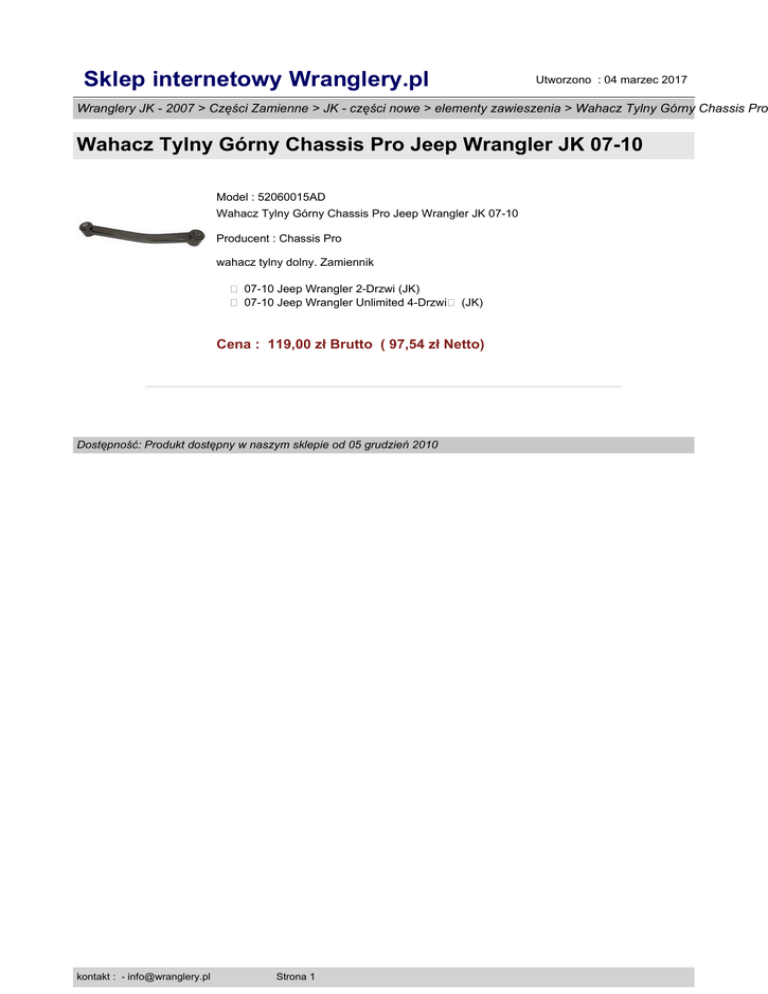 Sklep internetowy Wranglery.pl Utworzono : 04 marzec 2017 Wranglery JK - 2007 > Części Zamienne > JK - części nowe > elementy zawieszenia > Wahacz Tylny Górny Chassis Pro Wahacz Tylny Górny Chassis Pro Jeep Wrangler JK 07-10 Model : 52060015AD Wahacz Tylny Górny Chassis Pro Jeep Wrangler JK 07-10 Producent : Chassis Pro wahacz tylny dolny. Zamiennik � 07-10 Jeep Wrangler 2-Drzwi (JK) � 07-10 Jeep Wrangler Unlimited 4-Drzwi� (JK) Cena : 119,00 zł Brutto ( 97,54 zł Netto) Dostępność: Produkt dostępny w naszym sklepie od 05 grudzień 2010 kontakt : - [email protected] Strona 1