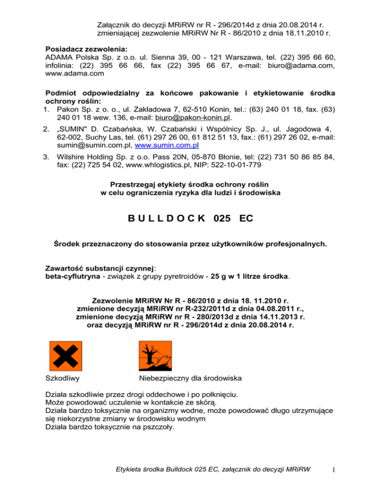 Załącznik do decyzji MRiRW nr R - 296/2014d z dnia 20.08.2014 r. zmieniającej zezwolenie MRiRW Nr R - 86/2010 z dnia 18.11.2010 r. Posiadacz zezwolenia: ADAMA Polska Sp. z o.o. ul. Sienna 39, 00 - 121 Warszawa, tel. (22) 395 66 60, infolinia: (22) 395 66 66, fax (22) 395 66 67, e-mail: [email protected], www.adama.com Podmiot odpowiedzialny za końcowe pakowanie i etykietowanie środka ochrony roślin: 1. Pakon Sp. z o. o., ul. Zakładowa 7, 62-510 Konin, tel.: (63) 240 01 18, fax. (63) 240 01 18 wew. 136, e-mail: [email protected]. 2. „SUMIN" D. Czabańska, W. Czabański i Wspólnicy Sp. J., ul. Jagodowa 4, 62-002, Suchy Las, tel. (61) 297 26 00, 61 812 51 13, fax.: (61) 297 26 02, e-mail: [email protected], www.sumin.com.pl 3. Wilshire Holding Sp. z o.o. Pass 20N, 05-870 Błonie, tel: (22) 731 50 86 85 84, fax: (22) 725 54 02, www.whlogistics.pl, NIP: 522-10-01-779 Przestrzegaj etykiety środka ochrony roślin w celu ograniczenia ryzyka dla ludzi i środowiska B U L L D O C K 025 EC Środek przeznaczony do stosowania przez użytkowników profesjonalnych. Zawartość substancji czynnej: beta-cyflutryna - związek z grupy pyretroidów - 25 g w 1 litrze środka. Zezwolenie MRiRW Nr R - 86/2010 z dnia 18. 11.2010 r. zmienione decyzją MRiRW nr R-232/2011d z dnia 04.08.2011 r., zmienione decyzją MRiRW nr R - 280/2013d z dnia 14.11.2013 r. oraz decyzją MRiRW nr R - 296/2014d z dnia 20.08.2014 r. Szkodliwy Niebezpieczny dla środowiska Działa szkodliwie przez drogi oddechowe i po połknięciu. Może powodować uczulenie w kontakcie ze skórą. Działa bardzo toksycznie na organizmy wodne, może powodować długo utrzymujące się niekorzystne zmiany w środowisku wodnym Działa bardzo toksycznie na pszczoły. Etykieta środka Bulldock 025 EC, załącznik do decyzji MRiRW 1 Załącznik do decyzji MRiRW nr R - 296/2014d z dnia 20.08.2014 r. zmieniającej zezwolenie MRiRW Nr R - 86/2010 z dnia 18.11.2010 r. I OPIS DZIAŁANIA BULLDOCK 025 EC jest środkiem owadobójczym w formie koncentratu do sporządzania emulsji wodnej, o działaniu kontaktowym i żołądkowym, przeznaczonym do zwalczania szkodników ssących i gryzących w roślinach rolniczych i warzywnych. Na roślinie działa powierzchniowo. Środek stosuje się używając opryskiwaczy polowych. II ZASTOSOWANIE ŚRODKA 1. Pszenica ozima Mszyca zbożowa Maksymalna dawka środka dla jednorazowego zastosowania: 0,25 l/ha. zalecana dawka środka dla jednorazowego zastosowania: 0,25 l/ha. Termin stosowania: Środek stosować po wykłoszeniu, nie później niż do fazy mlecznej dojrzałości ziarna. Skrzypionki Maksymalna dawka środka dla jednorazowego zastosowania: 0,25 l/ha. zalecana dawka środka dla jednorazowego zastosowania: 0,25 l/ha. Termin stosowania: Środek stosować od początku okresu wylęgania się larw. Maksymalna liczba zabiegów w sezonie wegetacyjnym: 2. Minimalny odstęp pomiędzy zabiegami: 14 dni. Zalecana ilość wody: 150-400 l/ha. Zalecane opryskiwanie: średniokropliste. 2. Rzepak ozimy Chowacz brukwiaczek Maksymalna dawka środka dla jednorazowego zastosowania: 0,25 l/ha. zalecana dawka środka dla jednorazowego zastosowania: 0,25 l/ha. Termin stosowania: Środek stosować po wystąpieniu chrząszczy, przed złożeniem jaj, zgodnie z sygnalizacją. Chowacz czterozębny Maksymalna dawka środka dla jednorazowego zastosowania: 0,25 l/ha. zalecana dawka środka dla jednorazowego zastosowania: 0,25 l/ha. Termin stosowania: Środek stosować po wystąpieniu chrząszczy, zgodnie z sygnalizacją. Szkodniki łuszczynowe (pryszczarek kapustnik, chowacz podobnik). Maksymalna dawka środka dla jednorazowego zastosowania: 0,25 l/ha. zalecana dawka środka dla jednorazowego zastosowania: 0,25 l/ha. Termin stosowania: Środek stosować po wystąpieniu szkodników, w początkowym okresie opadania płatków kwiatowych. Maksymalna liczba zabiegów w sezonie wegetacyjnym: 2. Minimalny odstęp pomiędzy zabiegami: 14 dni. Zalecana ilość wody: 150-400 l/ha. Zalecane opryskiwanie: średniokropliste. 3. Burak cukrowy Pchełka burakowa Etykieta środka Bulldock 025 EC, załącznik do decyzji MRiRW 2 Załącznik do decyzji MRiRW nr R - 296/2014d z dnia 20.08.2014 r. zmieniającej zezwolenie MRiRW Nr R - 86/2010 z dnia 18.11.2010 r. Maksymalna dawka środka dla jednorazowego zastosowania: 0,2 l/ha. zalecana dawka środka dla jednorazowego zastosowania: 0,2 l/ha. Termin stosowania: Środek stosować w okresie pojawienia się pierwszych chrząszczy lub po zauważeniu pierwszych uszkodzeń. Maksymalna liczba zabiegów w sezonie wegetacyjnym: 2. Minimalny odstęp pomiędzy zabiegami: 14 dni. Zalecana ilość wody: 150-400 l/ha. Zalecane opryskiwanie: średniokropliste. 4. Ziemniak Larwy i chrząszcze stonki ziemniaczanej Maksymalna dawka środka dla jednorazowego zastosowania: 0,3 l/ha. zalecana dawka środka dla jednorazowego zastosowania: 0,2-0,3 l/ha. Termin stosowania: Środek stosować zgodnie z sygnalizacją, po pojawieniu się najmłodszych stadiów larw stonki (L1 i L2). Wyższą z zalecanych dawek stosować do zwalczania chrząszczy oraz w przypadku bujnej naci ziemniaczanej. Maksymalna liczba zabiegów w sezonie wegetacyjnym: 2. Minimalny odstęp pomiędzy zabiegami: 14 dni. Zalecana ilość wody: 150-400 l/ha. Zalecane opryskiwanie: średniokropliste. 5. Kapusta głowiasta biała uprawiana w gruncie Gąsienice bielinka rzepnika, gąsienice tantnisia krzyżowiaczka. Maksymalna dawka środka dla jednorazowego zastosowania: 0,3 l/ha. zalecana dawka środka dla jednorazowego zastosowania: 0,2-0,3 l/ha. Piętnówka kapustnica Maksymalna dawka środka dla jednorazowego zastosowania: 0,4 l/ha. Zalecana dawka środka dla jednorazowego zastosowania: 0,3-0,4 l/ha. Termin stosowania: Opryskiwać w okresie masowego wylęgania się gąsienic. Niższą z zalecanych dawek środka stosować na wcześniejsze stadia rozwojowe gąsienic. Mszyca kapuściana Maksymalna dawka środka dla jednorazowego zastosowania: 0,3 l/ha. Zalecana dawka środka