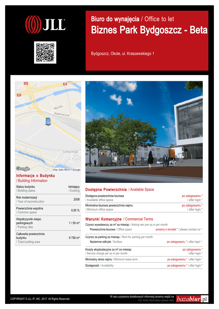 Biuro do wynajęcia / Office to let Biznes Park Bydgoszcz - Beta Bydgoszcz, Okole, ul. Kraszewskiego 1 Informacje o Budynku / Building Information Status budynku / Building status Istniejący / Existing Rok modernizacji / Year of reconstruction 2008 Powierzchnia wspólna / Common space 0,00 % Współczynnik miejsc parkingowych / Parking ratio 1 / 50 m² Całkowita powierzchnia budynku / Total building area 9 756 m² Dostępna Powierzchnia / Available Space Dostępna powierzchnia biurowa / Available office space po zalogowaniu * / after login * Minimalna biurowa powierzchnia najmu / Minimum office space po zalogowaniu * / after login * Warunki Komercyjne / Commercial Terms Czynsz wywoławczy za m² za miesiąc / Asking rent per sq m per month Powierzchnia biurowa / Office space prosimy o kontakt * / please contact us * Czynsz za parking za miesiąc / Rent for parking per month Naziemne odkryte / Surface po zalogowaniu * / after login * Koszty eksploatacyjne za m² za miesiąc / Service charge per sq m per month COPYRIGHT © JLL IP, INC. 2017. All Rights Reserved po zalogowaniu * / after login * Minimalny okres najmu / Minimum lease term po zalogowaniu * / after login * Dostępność / Availability po zalogowaniu * / after login * W celu uzyskania dodatkowych informacji prosimy wejdź na For more information please click Dostępna Powierzchnia / Available Space Piętro / Floor Powierzchnia wolna / Vacant space Dostępność / Availability 0 prosimy o kontakt * / please contact us * prosimy o kontakt * / please contact us * 2 prosimy o kontakt * / please contact us * prosimy o kontakt * / please contact us * 3 prosimy o kontakt * / please contact us * prosimy o kontakt * / please contact us * Razem / Total po zalogowaniu * / after login * Standardowe Wykończenie / Standard Fit-Out Klimatyzacja / Air conditioning Podnoszone podłogi / Raised floor Podwieszany sufit / Suspended ceiling Okablowanie telefoniczne / Telephone cabling Okablowanie komputerowe / Computer cabling Okablowanie elektryczne / Power cabling Tryskacze / Sprinklers Czujniki dymu / Smoke detectors Wykładzina / Carpeting Podział powierzchni ściankami / Wall partitioning Recepcja / Reception Ochrona budynku / Security Kable światłowodowe / Fiber optics Kontrola dostępu do budynku / Access control Uchylne okna / Openable windows Dwustronne zasilanie / Emergency power supply W celu uzyskania dodatkowych informacji lub zorganizowania spotkania prosimy o kontakt: / For more information or to arrange a viewing please contact: +48 58 350 62 62 Niniejsze warunki mają charakter wyłącznie informacyjny i nie stanowią części wiążącej oferty lub umowy. / The Property Particulars are for information purposes only and do not form any part of binding offer or contract. COPYRIGHT © JLL IP, INC. 2017. All Rights Reserved W celu uzyskania dodatkowych informacji prosimy wejdź na For more information please click