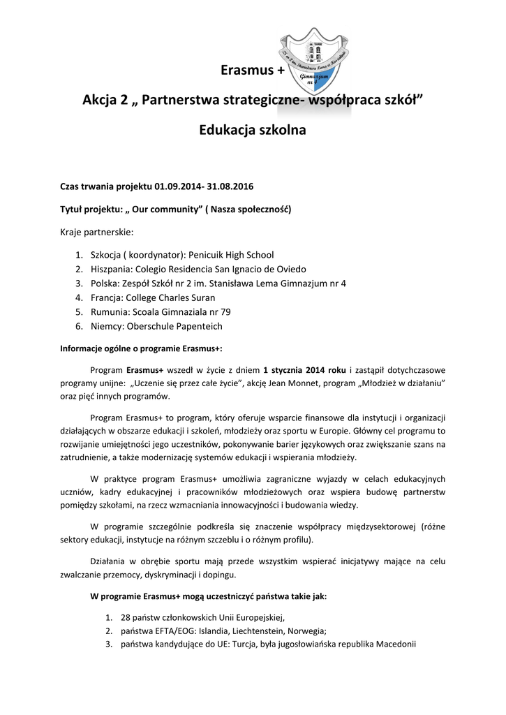 Erasmus + Akcja 2 „ Partnerstwa strategiczne- współpraca szkół” Edukacja szkolna Czas trwania projektu 01.09.2014- 31.08.2016 Tytuł projektu: „ Our community” ( Nasza społeczność) Kraje partnerskie: 1. 2. 3. 4. 5. 6. Szkocja ( koordynator): Penicuik High School Hiszpania: Colegio Residencia San Ignacio de Oviedo Polska: Zespół Szkół nr 2 im. Stanisława Lema Gimnazjum nr 4 Francja: College Charles Suran Rumunia: Scoala Gimnaziala nr 79 Niemcy: Oberschule Papenteich Informacje ogólne o programie Erasmus+: Program Erasmus+ wszedł w życie z dniem 1 stycznia 2014 roku i zastąpił dotychczasowe programy unijne: „Uczenie się przez całe życie”, akcję Jean Monnet, program „Młodzież w działaniu” oraz pięć innych programów. Program Erasmus+ to program, który oferuje wsparcie finansowe dla instytucji i organizacji działających w obszarze edukacji i szkoleń, młodzieży oraz sportu w Europie. Główny cel programu to rozwijanie umiejętności jego uczestników, pokonywanie barier językowych oraz zwiększanie szans na zatrudnienie, a także modernizację systemów edukacji i wspierania młodzieży. W praktyce program Erasmus+ umożliwia zagraniczne wyjazdy w celach edukacyjnych uczniów, kadry edukacyjnej i pracowników młodzieżowych oraz wspiera budowę partnerstw pomiędzy szkołami, na rzecz wzmacniania innowacyjności i budowania wiedzy. W programie szczególnie podkreśla się znaczenie współpracy międzysektorowej (różne sektory edukacji, instytucje na różnym szczeblu i o różnym profilu). Działania w obrębie sportu mają przede wszystkim wspierać inicjatywy mające na celu zwalczanie przemocy, dyskryminacji i dopingu. W programie Erasmus+ mogą uczestniczyć państwa takie jak: 1. 28 państw członkowskich Unii Europejskiej, 2. państwa EFTA/EOG: Islandia, Liechtenstein, Norwegia; 3. państwa kandydujące do UE: Turcja, była jugosłowiańska republika Macedonii