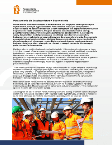Porozumienie dla Bezpieczeństwa w Budownictwie Porozumienie dla Bezpieczeństwa w Budownictwie jest inicjatywą ośmiu generalnych wykonawców, zwanych sygnatariuszami Porozumienia, mającą na celu poprawę bezpieczeństwa na polskich budowach. Celem nadrzędnym jest poprawa warunków pracy i ograniczenie liczby wypadków. Program działania zakłada zrealizowanie szeregu projektów wprowadzających rozwiązania systemowe z dziedziny BHP, m.in.: wspólne wzory dokumentów, model potwierdzania kwalifikacji zawodowych pracowników budowlanych czy szkolenia okresowe skierowane do pracowników branży. Porozumienie propaguje kulturę bezpieczeństwa, uświadamia zagrożenia płynące z pracy na budowie, aby w konsekwencji eliminować ryzyko. Dążymy do podniesienia bezpieczeństwa na budowie nie tylko w siłach własnych, ale również u naszych partnerów biznesowych, podwykonawców i dostawców. Każdego roku na polskich budowach dochodzi do około 120 śmiertelnych, a to oznacza, że co 3 dni ginie człowiek. Głównym powodem takiego stanu rzeczy jest brak kwalifikacji pracowników budowlanych, nieprzestrzeganie zasad BHP oraz niedoskonały system zabezpieczeń. Najczęstsze zdarzenia to upadki z wysokości, uderzenia spadającym przedmiotem lub przygniecenia. Najniebezpieczniejsza jest praca na dachach, rusztowaniach, a także w głębokich wykopach. Co druga ofiara śmiertelna na budowie to pracownik ze stażem pracy, nieprzekraczającym trzech miesięcy. Każdy taki wypadek to ogromna tragedia rodziny poszkodowanego. – Nie ma nic gorszego niż wypadek. W jego obliczu wszystko to, co jest związane z rywalizacją, wynikiem finansowym, wygranym przetargiem, traci znaczenie – mówi Krzysztof Andrulewicz, prezes firmy Skanska. – Z wypadkiem śmiertelnym związane są straty socjalne, emocjonalne i finansowe. Z jednej strony jest on dramatem dla rodziny i negatywnie wpływa na morale zespołu, z drugiej podważa on zaufanie do firmy, wpływając niekorzystnie na jej wizerunek biznesowy i dalszą współpracę z generalnym wykonawcą. Nadrzędnym celem Porozumienia nie jest zredukowanie wypadków śmiertelnych w branży budowlanej, ale ich całkowite wyeliminowanie, bowiem nie ma liczby wypadków, na którą możemy się zgodzić. Hasłem przewodnim tej kampanii jest „zero wypadków”. Tylko myśląc w ten sposób, możemy odnieść wspólny sukces. Aby osiągnąć ten cel, w ramach Porozumienia opracowano szereg projektów wprowadzających systemowe rozwiązania z dziedziny BHP na place budów sygnatariuszy. Działania te rozłożone są na wiele lat i wiążą się nie tylko ze zmianami organizacyjnymi, ale także ze zmianą mentalności przyzwyczajeń pracowników i społeczeństwa. – Obniżenie statystyki wypadkowości na polskich budowach to bardzo istotne cele, choć jest to praca na lata – podkreśla Jerzy Werle, wiceprezes zarządu Warbudu. – Trzeba bowiem przede wszystkim zmienić świadomość naszych pracowników. Sami muszą chcieć pracować zgodnie ze standardami bezpieczeństwa. Zmian wymagają również przepisy prawa budowlanego, co pozwoli na włączenie w proces bezpieczeństwa wszystkich uczestników procesu budowlanego. Zreformować należy także przepisy BHP, ponieważ wiele materiałów i sprzętu, które wykorzystujemy na budowach pochodzą zza granicy, a ich używanie musi być zgodne ze standardami unijnymi. – Drogą do osiągnięcia sukcesu jest uświadomienie naszym podwykonawcom, jak ważna jest dbałość o bezpieczeństwo pracowników na placu budowy. Nie będziemy współpracowali z firmami, które aspekty finansowe przedkładają nad względy bezpieczeństwa – zapowiada Wojciech Łukaszek, wiceprezes Hochtief Polska. Przestrzeganie standardów BHP ma być czynnikiem warunkującym współpracę z daną firmą podwykonawczą. Przedsiębiorstwa, które nie będą chciały respektować zasad bezpieczeństwa, będą pozbawione możliwości współpracy z generalnym wykonawcą, który przystąpił do Porozumienia. Egzekwowanie przestrzegania zasad BHP od podwykonawców będzie się jednak odbywać na zasadach partnerskich. Zadaniem Porozumienia jest zapewnienie podwykonawcom odpowiednich warunków do realizacji tego, czego będzie się od nich wymagać, a więc odpowiedniego czasu na wykonanie zadania oraz odpowiedniego poziomu cenowego, tak by była możliwa realizacja zarówno zadań podstawowych, jak i tych z zakresu bezpieczeństwa pracy. W najbliższym czasie w ramach Porozumienia mają zostać wypracowane standardy raportowania wypadków. – Chcemy się dzielić z innymi firmami budowlanymi wynikami wypadkowości. Pracujemy obecnie nad zasadami raportowania i upubliczniania danych o wypadkach. Zamierzamy je pokazywać, po to, by móc się rozliczać z efektów działania Porozumienia – mówi prezes Budimexu Dariusz Blocher. Dodaje również, że promocja bezpiecznej pracy na budowie powinna rozpoczynać się na uczelniach i w szkołach, co wiąże się z opracowaniem modelu certyfikowanego pracownika Wzorem dla działań Porozumienia jest Wielka Brytania. Pod koniec lat 90. ubiegłego wieku liczba wypadków śmiertelnych wynosiła tam około 120 rocznie, podobnie jak obecnie w Polsce. Największe firmy budowlane powołały Grupę Generalnych Wykonawców, która zrzeszała 23 firmy mające 35-procentowy udział w brytyjskim rynku. Nadrzędnymi celami Grupy było zmniejszenie liczby wypadków śmiertelnych o 10 procent co roku i zapewnienie w pełni wykwalifikowanej siły roboczej przez trzy lata. Cel osiągnięto – przez dziesięć lat liczba śmiertelnych wypadków na brytyjskich budowach spadła o połowę (ze 105 do 53 rocznie). Skoro zmiana w zakresie bezpieczeństwa była możliwa w jednym miejscu, to nie ma żadnych przeszkód, by przeprowadzić ją również w Polsce. Według umowy między sygnatariuszami Porozumienia, każda spółka będzie pełniła roczną prezydencję, podczas której będzie miała szansę zaprezentowa