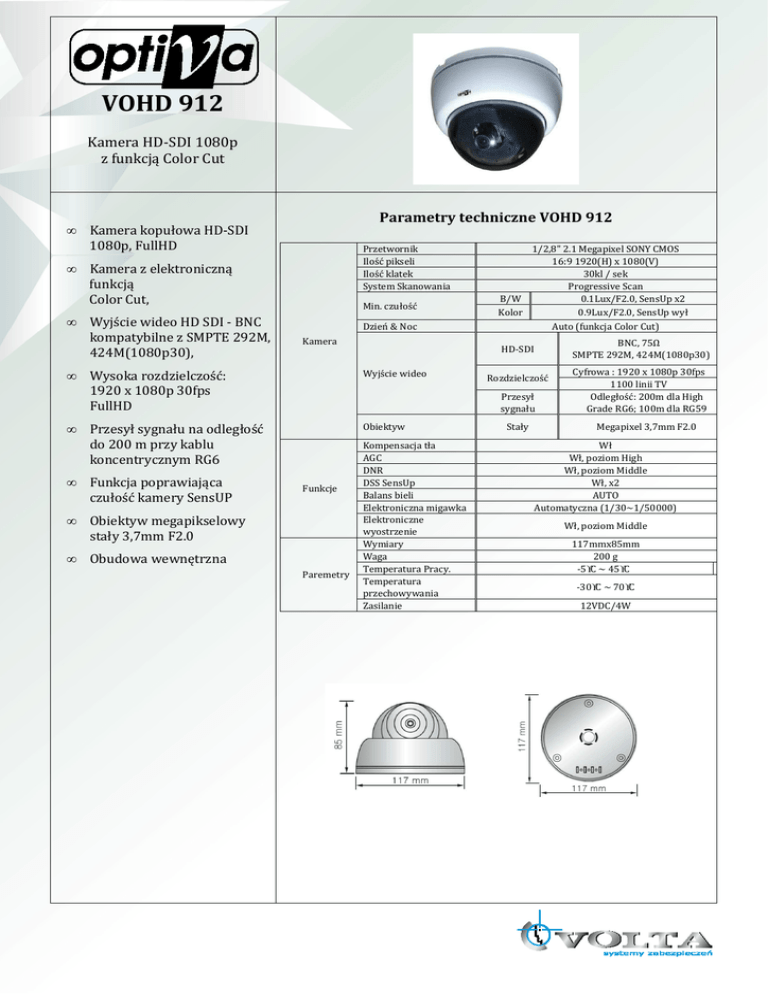 VOHD 912 Kamera HD-SDI 1080p z funkcją Color Cut • • • • • Parametry techniczne VOHD 912 Kamera kopułowa HD-SDI 1080p, FullHD Kamera z elektroniczną funkcją Color Cut, Wyjście wideo HD SDI - BNC kompatybilne z SMPTE 292M, 424M(1080p30), Min. czułość Dzień & Noc Kamera Wyjście wideo Przesył sygnału na odległość do 200 m przy kablu koncentrycznym RG6 Obiektyw Funkcja poprawiająca czułość kamery SensUP • Obiektyw megapikselowy stały 3,7mm F2.0 1/2,8" 2.1 Megapixel SONY CMOS 16:9 1920(H) x 1080(V) 30kl / sek Progressive Scan B/W 0.1Lux/F2.0, SensUp x2 Kolor 0.9Lux/F2.0, SensUp wył Auto (funkcja Color Cut) BNC, 75Ω SMPTE 292M, 424M(1080p30) HD-SDI Wysoka rozdzielczość: 1920 x 1080p 30fps FullHD • • Przetwornik Ilość pikseli Ilość klatek System Skanowania Rozdzielczość Przesył sygnału Funkcje Obudowa wewnętrzna Paremetry Kompensacja tła AGC DNR DSS SensUp Balans bieli Elektroniczna migawka Elektroniczne wyostrzenie Wymiary Waga Temperatura Pracy. Temperatura przechowywania Zasilanie Stały Cyfrowa : 1920 x 1080p 30fps 1100 linii TV Odległość: 200m dla High Grade RG6; 100m dla RG59 Megapixel 3,7mm F2.0 Wł Wł, poziom High Wł, poziom Middle Wł, x2 AUTO Automatyczna (1/30~1/50000) Wł, poziom Middle 117mmx85mm 200 g -5°C ~ 45°C -30°C ~ 70°C 12VDC/4W