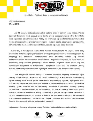 iloveRally – Rajdowe Show w samym sercu Katowic. Informacja prasowa 17 maj 2016 Już 11 czerwca odbędzie się wielkie rajdowe show w samym sercu miasta. Po raz dziewiąty będziemy mogli poczuć sporą dawkę emocji podczas kolejnej edycji iLoveRally, którą organizuje Stowarzyszenie X. Każdy, kto interesuje się sportami motorowymi, będzie mógł z bliska podziwiać prawdziwe wyścigowe i rajdowe bestie, obserwować pokazy driftu, porozmawiać z mechanikami i zawodnikami, dzieląc się swoją pasją z innymi. iLoveRally to niewątpliwie jedyna taka impreza motoryzacyjna na Śląsku, która łączy środowisko motoryzacyjne i jednocześnie promuje bezpieczeństwo w ruchu drogowym. Tu spotykają się pasjonaci, profesjonaliści oraz amatorzy, dzieląc się swoimi zainteresowaniami w doborowym towarzystwie. Tegoroczna impreza, to nowa formuła, dodatkowy nowy odcinek pokazowy i nowe atrakcje. Rajdowe show pojawi się pod najwyższym budynkiem w Katowicach – budynkiem Altus oraz na terenach „Strefy Kultury”. Na trasie prócz kierowców rajdowych zaprezentują się drifterzy i kartingowcy. Na wszystkich kibiców, którzy 11 czerwca odwiedzą imprezę iLoveRally, będą czekały liczne atrakcje i konkursy. Na ulicy Chełkowskiego w Katowicach zlokalizowany będzie otwarty Park Kibica, gdzie zaprezentują się maszyny rajdowe, wyścigowe, 4X4, driftowe czy zabytkowe, natomiast pod NOSPR w Strefie Kultury usytuowany będzie Park Atrakcji, gdzie znajdzie się tor gokartowy, szkolenia z pierwszej pomocy, pokazy ratownictwa i bezpieczeństwa w samochodzie. W trakcie imprezy będziemy gościć znanych kierowców rajdowych, którzy opowiedzą o tym jak zacząć karierę rajdowca, o rajdach samochodowych i ich rozwoju w Polsce. W poprzednich edycjach iLR odwiedził m.in. Kajetan Kajetanowicz, Tomek Kuchar, Wojtek Chuchała, Andi Mancin czy Sobiesław Zasada. Na uważnych kibiców będą czekać nagrody!! Najnowsze informacje o imprezie znajdą Państwo na kanale facebookaiLoveRally.