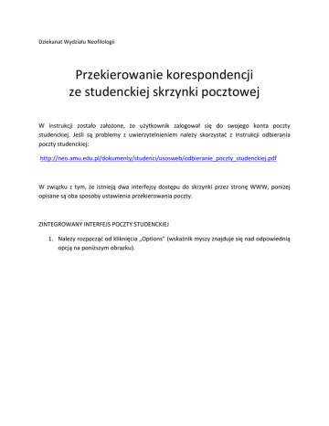 Dziekanat Wydziału Neofilologii Przekierowanie korespondencji ze studenckiej skrzynki pocztowej W instrukcji zostało założone, że użytkownik zalogował się do swojego konta poczty studenckiej. Jeśli są problemy z uwierzytelnieniem należy skorzystad z instrukcji odbierania poczty studenckiej: http://neo.amu.edu.pl/dokumenty/studenci/usosweb/odbieranie_poczty_studenckiej.pdf W związku z tym, że istnieją dwa interfejsy dostępu do skrzynki przez stronę WWW, poniżej opisane są oba sposoby ustawienia przekierowania poczty. ZINTEGROWANY INTERFEJS POCZTY STUDENCKIEJ 1. Należy rozpocząd od kliknięcia „Options” (wskaźnik myszy znajduje się nad odpowiednią opcją na poniższym obrazku). 2. Następnie z rozwijanego drzewa opcji należy wybrad „Local Account” 3. Kolejnym krokiem jest kliknięcie „Forwarding” 4. Następnie należy włączyd przekierowanie (zaznaczyd „Enable automatic forwarding”), podad adres (w polu „Forward to:”), na który mają byd wysyłane przekierowane wiadomości oraz zdecydowad czy mają byd pozostawiane kopie maili na serwerze (pole „Keep a copy of the Message”). 5. Po zdefiniowaniu przekierowania należy kliknąd przycisk „Save Preferences”. LEKKI INTERFEJS POCZTY STUDENCKIEJ 1. Należy rozpocząd od kliknięcia „Options” (wskaźnik myszy znajduje się nad odpowiednią opcją na poniższym obrazku). 2. Następnie przechodząc do zakładki „Mail” należy wybrad „Settings” 3. Kolejnym krokiem jest zaznaczenie opcji „Enable forwarding”. Możemy również zaznaczyd opcję „Do not leave copy on server”, jeśli nie chcemy pozostawiad kopii wiadomości na serwerze. W polu „Email Address” należy wprowadzid adres e-mail, na który ma byd dokonywane przekierowanie i kliknąd przycisk „Add”, następnie „Save”.