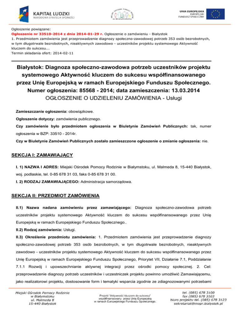 Ogłoszenie powiązane: Ogłoszenie nr 33510-2014 z dnia 2014-01-29 r. Ogłoszenie o zamówieniu - Białystok 1. Przedmiotem zamówienia jest przeprowadzenie diagnozy społeczno-zawodowej potrzeb 353 osób bezrobotnych, w tym długotrwale bezrobotnych, nieaktywnych zawodowo - uczestników projektu systemowego Aktywność kluczem do sukcesu... Termin składania ofert: 2014-02-11 Białystok: Diagnoza społeczno-zawodowa potrzeb uczestników projektu systemowego Aktywność kluczem do sukcesu współfinansowanego przez Unię Europejską w ramach Europejskiego Funduszu Społecznego. Numer ogłoszenia: 85568 - 2014; data zamieszczenia: 13.03.2014 OGŁOSZENIE O UDZIELENIU ZAMÓWIENIA - Usługi Zamieszczanie ogłoszenia: obowiązkowe. Ogłoszenie dotyczy: zamówienia publicznego. Czy zamówienie było przedmiotem ogłoszenia w Biuletynie Zamówień Publicznych: tak, numer ogłoszenia w BZP: 33510 - 2014r. Czy w Biuletynie Zamówień Publicznych zostało zamieszczone ogłoszenie o zmianie ogłoszenia: nie. SEKCJA I: ZAMAWIAJĄCY I. 1) NAZWA I ADRES: Miejski Ośrodek Pomocy Rodzinie w Białymstoku, ul. Malmeda 8, 15-440 Białystok, woj. podlaskie, tel. 0-85 678 31 03, faks 0-85 678 31 00. I. 2) RODZAJ ZAMAWIAJĄCEGO: Administracja samorządowa. SEKCJA II: PRZEDMIOT ZAMÓWIENIA II.1) Nazwa nadana zamówieniu przez zamawiającego: Diagnoza społeczno-zawodowa potrzeb uczestników projektu systemowego Aktywność kluczem do sukcesu współfinansowanego przez Unię Europejską w ramach Europejskiego Funduszu Społecznego.. II.2) Rodzaj zamówienia: Usługi. II.3) Określenie przedmiotu zamówienia: 1. Przedmiotem zamówienia jest przeprowadzenie diagnozy społeczno-zawodowej potrzeb 353 osób bezrobotnych, w tym długotrwale bezrobotnych, nieaktywnych zawodowo - uczestników projektu systemowego Aktywność kluczem do sukcesu współfinansowanego przez Unię Europejską w ramach Europejskiego Funduszu Społecznego, Priorytet VII, Działanie 7.1, Poddziałanie 7.1.1 Rozwój i upowszechnianie aktywnej integracji przez ośrodki pomocy społecznej. 2. Cel: przeprowadzenie diagnozy potrzeb uczestników i uczestniczek projektu powinno umożliwić Zamawiającemu, jako realizatorowi projektu, dostosowanie form i tematyki wsparcia zgodnie ze zdiagnozowanymi potrzebami uczestników. Konsultacje z doradcą zawodowym mają na celu określenie potrzeb i predyspozycji zawodowych uczestników i uczestniczek, ustalenie kierunków kształcenia, umożliwiających uczestnikom i uczestniczkom realistyczny wybór lub zmianę zawodu oraz wejście, powrót na rynek pracy lub odbycie stażu zawodowego, przy uwzględnieniu popytu na określone zawody na lokalnym rynku pracy. Konsultacje z psychologiem mają na celu przełamanie barier, rozpoznanie sytuacji osobistej, rodzinnej i zdrowotnej, oraz propozycji rozwiązania problemu. 3. Usługa będzie polegała na: a) przeprowadzeniu dla 353 uczestników i uczestniczek projektu indywidualnych konsultacji z doradcą zawodowym w wymiarze 2 godzin zegarowych dla każdego uczestnika i uczestniczki, b) przeprowadzeniu dla 353 uczestników i uczestniczek projektu indywidualnych konsultacji z psychologiem w wymiarze 2 godzin zegarowych dla każdego uczestnika i uczestniczki, c) sporządzeniu 353 indywidualnych diagnoz o każdej osobie oraz raportu zbiorczego z przeprowadzonej diagnozy. 4. Przewiduje się, że z konsultacji skorzysta 353 uczestników i uczestniczek projektu będących osobami bezrobotnymi, w tym długotrwale bezrobotnymi, nieaktywnymi zawodowo. 5. Zamawiający zastrzega sobie możliwość zmniejszenia ilości uczestników i uczestniczek projektu objętych diagnozą społeczno-zawodową w ilości nieprzekraczającej 20% liczby uczestników z prawem proporcjonalnego zmniejszenia ceny. 6. Miejsce przeprowadzenia diagnozy społeczno-zawodowej potrzeb uczestników i uczestniczek projektu: teren miasta Białegostoku. 7. Wykonawca zobowiązany będzie do przeprowadzenia diagnozy dla 353 uczestników i uczestniczek, w łącznym wymiarze 4 godzin zegarowych dla każdego uczestnika i uczestniczki, w tym: 2 godziny zegarowe doradztwa zawodowego indywidualnego oraz bezpośrednio po nich 2 godziny zegarowe indywidualnych konsultacji z psychologiem. Wykonawca zapewni min. 15-minutową przerwę pomiędzy spotkaniem z doradcą zawodowym a psychologiem. Uwaga: Każda z osób powinna być zdiagnozowana w jednym dniu przez doradcę zawodowego i psychologa. 8.Konsultacje mogą być prowadzone w każdy dzień tygodnia, oprócz niedziel, w godzinach 800 - 1700 i powinny odbywać się w następujących dwóch etapach: a) I etap: w terminie 14 dni od daty podpisania umowy - dla 206 osób, b) II etap: w okresie od dnia 11.08.2014r. do dnia 25.08.2014r. - dla 147 osób. 9. Diagnoza powinna być przeprowadzona przez doradców zawodowych i psychologów posiadających odpowiednie kwalifikacje i doświadczenie w realizacji usług stanowiących przedmiot niniejszego zamówienia. 10. W ramach realizacji przedmiotu zamówienia Wykonawca zobowiązany będzie do: a) przeprowadzenia diagnozy społeczno-zawodowej w formie indywidualnej konsultacji z doradcą zawodowym i konsultacji z psychologiem, tj. przeprowadzenia doradztwa indywidualnego zawodowego w wymiarze 2 godzin zegarowych i psychologicznego w wymiarze 2 godzin zegarowych, dla każdego uczestnika i uczestniczki oraz sporządzenie indywidualnej diagnozy o każdej osobie zgodnie z narzędziem do przeprowadzenia diagnozy opracowanym przez Zamawiającego, stanowiącym załącznik nr 1 do niniejszej SIWZ, b) ustalenia, po konsultacji z Zamawiającym, harmonogramu konsultacji z doradcą zawodowym i psychologiem, zawierającego godziny konsultacji na każdy dzień, ilość diagnozowanych danego dnia uczestników i uczestniczek, miejsce odbywania konsultacji, dane personalne doradcy zawodowego i psychologa i przekazania harmonogramu Zamawiającemu przed rozpoczęciem diagnozy. Za poinformowanie o ustalonych terminach i godzinach konsultacji poszczególny