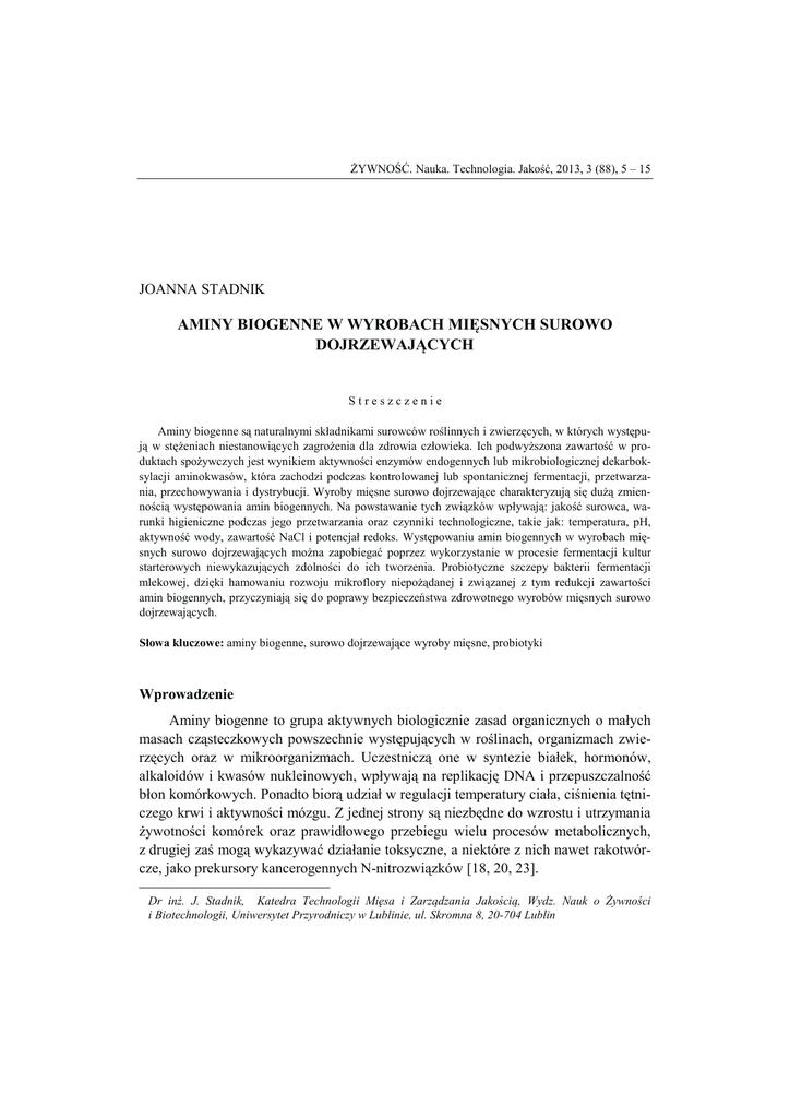 ŻYWNOŚĆ. Nauka. Technologia. Jakość, 2013, 3 (88), 5 – 15 JOANNA STADNIK AMINY BIOGENNE W WYROBACH MIĘSNYCH SUROWO DOJRZEWAJĄCYCH Streszczenie Aminy biogenne są naturalnymi składnikami surowców roślinnych i zwierzęcych, w których występują w stężeniach niestanowiących zagrożenia dla zdrowia człowieka. Ich podwyższona zawartość w produktach spożywczych jest wynikiem aktywności enzymów endogennych lub mikrobiologicznej dekarboksylacji aminokwasów, która zachodzi podczas kontrolowanej lub spontanicznej fermentacji, przetwarzania, przechowywania i dystrybucji. Wyroby mięsne surowo dojrzewające charakteryzują się dużą zmiennością występowania amin biogennych. Na powstawanie tych związków wpływają: jakość surowca, warunki higieniczne podczas jego przetwarzania oraz czynniki technologiczne, takie jak: temperatura, pH, aktywność wody, zawartość NaCl i potencjał redoks. Występowaniu amin biogennych w wyrobach mięsnych surowo dojrzewających można zapobiegać poprzez wykorzystanie w procesie fermentacji kultur starterowych niewykazujących zdolności do ich tworzenia. Probiotyczne szczepy bakterii fermentacji mlekowej, dzięki hamowaniu rozwoju mikroflory niepożądanej i związanej z tym redukcji zawartości amin biogennych, przyczyniają się do poprawy bezpieczeństwa zdrowotnego wyrobów mięsnych surowo dojrzewających. Słowa kluczowe: aminy biogenne, surowo dojrzewające wyroby mięsne, probiotyki Wprowadzenie Aminy biogenne to grupa aktywnych biologicznie zasad organicznych o małych masach cząsteczkowych powszechnie występujących w roślinach, organizmach zwierzęcych oraz w mikroorganizmach. Uczestniczą one w syntezie białek, hormonów, alkaloidów i kwasów nukleinowych, wpływają na replikację DNA i przepuszczalność błon komórkowych. Ponadto biorą udział w regulacji temperatury ciała, ciśnienia tętniczego krwi i aktywności mózgu. Z jednej strony są niezbędne do wzrostu i utrzymania żywotności komórek oraz prawidłowego przebiegu wielu procesów metabolicznych, z drugiej zaś mogą wykazywać działanie toksyczne, a niektóre z nich nawet rakotwórcze, jako prekursory kancerogennych N-nitrozwiązków [18, 20, 23]. Dr inż. J. Stadnik, Katedra Technologii Mięsa i Zarządzania Jakością, Wydz. Nauk o Żywności i Biotechnologii, Uniwersytet Przyrodniczy w Lublinie, ul. Skromna 8, 20-704 Lublin 6 Joanna Stadnik Celem pracy było przedstawienie aktualnego stanu wiedzy w zakresie ogólnej charakterystyki amin biogennych, czynników warunkujących ich tworzenie w surowo dojrzewających wyrobach mięsnych oraz wykorzystania kultur starterowych, w tym szczepów probiotycznych, jako metody zapobiegania ich występowaniu. Aminy biogenne - charakterystyka ogólna Aminy biogenne powstają w wyniku dekarboksylacji aminokwasów obojętnych i zasadowych. Aminy lotne (m.in. β-fenyloetyloamina) powstają także podczas redukcyjnego aminowania lub transaminacji aldehydów i ketonów [20, 27, 38, 40]. Ze względu na budowę chemiczną wyróżnia się aminy o strukturze alifatycznej (agmatyna, kadaweryna, putrescyna, spermidyna, spermina), aromatycznej (β-fenyloetyloamina, tyramina) oraz heterocyklicznej (histamina, tryptamina). Klasyfikacja ze względu na liczbę grup aminowych obejmuje podział na: monoaminy (β-fenyloetyloamina, tyramina), diaminy (histamina, kadaweryna, putrescyna, tryptamina) oraz poliaminy (agmatyna, spermidyna, spermina) [18, 20]. Nazwy amin biogennych tworzone są na podstawie nazw aminokwasów będących ich prekursorami. I tak: histamina powstaje w wyniku usunięcia grupy α-karboksylowej z histydyny, tyramina – z tyrozyny, β-fenyloetyloamina - z fenyloalaniny, tryptamina – z tryptofanu. Prekursorem kadaweryny jest lizyna, agmatyny – arginina, zaś putrescyny – ornityna [20]. Aminy biogenne, obecne w żywności jako naturalne składniki surowców roślinnych i zwierzęcych, występują w niskim stężeniu i nie stanowią zagrożenia dla zdrowia człowieka. Ich podwyższona zawartość w produktach spożywczych jest wynikiem aktywności enzymów endogennych zawartych w surowcach użytych do ich produkcji lub mikrobiologicznej dekarboksylacji aminokwasów zachodzącej podczas kontrolowanej lub spontanicznej fermentacji, przetwarzania, przechowywania i dystrybucji [40]. Czynnikami warunkującymi powstawanie amin biogennych w żywności jest obecność prekursorów, tj. wolnych aminokwasów oraz mikroorganizmów wykazujących zdolność biosyntezy enzymów katalizujących ich dekarboksylację. Ich tworzenie zależy również od warunków umożliwiających wzrost mikroorganizmów i biosyntezę dekarboksylaz oraz od warunków mających korzystny wpływ na aktywność dekarboksylaz [1, 40]. Wolne aminokwasy są naturalnymi składnikami żywności lub uwalniane są w wyniku reakcji proteolizy. Zatem wysoka zawartość białka oraz obecność w żywności szczepów bakterii charakteryzujących się wysoką aktywnością enzymów proteolitycznych są czynnikami zwiększającymi ryzyko powstawania amin biogennych [20]. Pomimo że zdolność do dekarboksylacji aminokwasów nie jest powszechna wśród bakterii, wiele gatunków należących do rodzajów: Bacillus, Citrobacter, Clostridium, Escherichia, Klebsiella, Kocuria, Listeria, Micrococcus, Photobacterium, AMINY BIOGENNE W WYROBACH MIĘSNYCH SUROWO DOJRZEWAJĄCYCH 7 Plesiomonas, Proteus, Pseudomonas, Salmonella, Shewanella, Shigella, Staphylococcus oraz bakterii kwasu mlekowego z rodzaju Carnobacterium, Lactobacillus, Lactococcus, Leuconostoc, Enterococcus, Pediococcus i Streptococcus, jest zdolnych do dekarboksylacji jednego lub więcej aminokwasów [20, 40, 45]. Nie wszystkie szczepy tego samego gatunku wykazują zdolność do wytwarzania amin biogennych [11]. Mikroorganizmy wytwarzające dekarboksylazy aminokwasów mogą stanowić naturalną mikroflorę surowców spożywczych, przeniknąć do żywości w wyniku jej zanieczyszczenia w trakcie produk