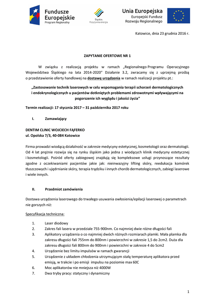 Katowice, dnia 23 grudnia 2016 r. ZAPYTANIE OFERTOWE NR 1 W związku z realizacją projektu w ramach „Regionalnego Programu Operacyjnego Województwa Śląskiego na lata 2014-2020” Działanie 3.2, zwracamy się z uprzejmą prośbą o przedstawienie oferty handlowej na dostawę urządzenia w ramach realizacji projektu pt.: „Zastosowanie technik laserowych w celu wspomagania terapii schorzeń dermatologicznych i endokrynologicznych u pacjentów dotkniętych problemami zdrowotnymi wpływającymi na pogorszenie ich wyglądu i jakości życia” Termin realizacji: 17 stycznia 2017 – 31 października 2017 roku I. Zamawiający DENTIM CLINIC WOJCIECH FĄFERKO ul. Opolska 7/3, 40-084 Katowice Firma prowadzi wiodącą działalność w zakresie medycyny estetycznej, kosmetologii oraz dermatologii. Od 4 lat prężnie rozwija się na rynku śląskim jako jedna z wiodących klinik medycyny estetycznej i kosmetologii. Pośród oferty zabiegowej znajdują się kompleksowe usługi przynoszące rezultaty zgodne z oczekiwaniami pacjentów jakie jak: nieinwazyjny lifting skóry, reedukacja komórek tłuszczowych i ujędrnianie skóry, terapia trądziku i innych chorób dermatologicznych, zabiegi laserowe i wiele innych. II. Przedmiot zamówienia Dostawa urządzenia laserowego do trwałego usuwania owłosienia/epilacji laserowej o parametrach nie gorszych niż: Specyfikacja techniczna: 1. 2. 3. 4. 5. 6. 7. Laser diodowy Zakres fali lasera w przedziale 755-900nm. Co najmniej dwie różne długości fali Aplikatory urządzenia o co najmniej dwóch różnych rozmiarach plamki. Mała plamka dla zakresu długości fali 755nm do 800nm i powierzchni w zakresie 1,5 do 2cm2. Duża dla zakresu długości fali 800nm do 900nm i powierzchni w zakresie 4 do 5cm2 Urządzenie bez limitu impulsów w ramach gwarancji Urządzenie z układem chłodzenia utrzymującym stałą temperaturę aplikatora przed emisją, w trakcie i po emisji impulsu na poziomie max 60C Moc aplikatorów nie mniejsza niż 4000W Dwa tryby pracy: statyczny i dynamiczny 1 Kod CPV: 33128000-3 Lasery medyczne inne niż stosowane w chirurgii III. Składanie ofert częściowych Nie jest dopuszczane/ lub są dopuszczane IV. Możliwość podwykonawstwa Zamawiający dopuszcza możliwość zlecenia części lub całości zamówienia podwykonawcom. V. Przygotowanie oferty Oferta powinna: Posiadać datę sporządzenia i datę ważności, Zawierać adres siedziby oferenta lub adres korespondencyjny, Zawierać NIP oferenta, Określać cenę netto zamówienia, Zawierać warunki dostawy (termin) oraz warunki gwarancji, Zawierać podpis i pieczęć oferenta Oferta powinna być sporządzona na Załączniku nr 1. Do oferty należy także dołączyć Załącznik nr 2 Oświadczenie o braku powiązań pomiędzy podmiotami współpracującymi. VI. Kryteria oceny ofert Zamawiający dokona wyboru oferty na podstawie porównania kryteriów: cena (netto), ocena polega na obliczeniu ilorazu ceny najniższej do ceny oferowanej gdzie oferta z najniższą ceną otrzyma 1 punkt, następnie ocena jest przemnażana razy wagę 80% • termin realizacji, ocena polega na obliczeniu ilorazu najkrótszego terminu realizacji do terminu oferowanego, gdzie oferta z najkrótszym terminem otrzyma 1 punkt, następnie ocena jest przemnażana razy wagę 20% VII. Wycofanie oferty Oferent przed datą wyboru dostawcy może zmienić lub wycofać swoją ofertę. VIII. Miejsce i termin składania ofert Oferta może być dostarczona za pośrednictwem: poczty, kurierem lub osobiście na adres: DENTIM CLINIC WOJCIECH FĄFERKO ul. Opolska 7/3, 40-084 Katowice poczty elektronicznej na adresy e-mail: [email protected] 2 IX. Wybór oferenta nastąpi w dniu 9 stycznia 2017 o godz. 9:00 Oferty należy składać do dnia 5 stycznia 2017 do godz. 14:00 Oferty złożone po w/w terminie nie będą rozpatrywane. Zakres wykluczenia W celu uniknięcia konfliktu interesów zamówienia nie mogą być udzielane podmiotom powiązanym z zamawiającym osobowo lub kapitałowo. Przez powiązania kapitałowe lub osobowe rozumie się wzajemne powiązania między zamawiającym lub osobami upoważnionymi do zaciągania zobowiązań w imieniu zamawiającego lub osobami wykonującymi w imieniu zamawiającego czynności związane z przygotowaniem i przeprowadzeniem procedury wyboru wykonawcy, a wykonawcą, polegające w szczególności na: uczestniczeniu w spółce jako wspólnik spółki cywilnej lub spółki osobowej, posiadaniu co najmniej 10 % udziałów lub akcji, pełnieniu funkcji członka organu nadzorczego lub zarządzającego, prokurenta, pełnomocnika, pozostawaniu w związku małżeńskim, w stosunku pokrewieństwa lub powinowactwa w linii prostej, pokrewieństwa drugiego stopnia lub powinowactwa drugiego stopnia w linii bocznej lub w stosunku przysposobienia, opieki lub kurateli. X. Wybór wykonawcy i podpisanie umowy Zamawiający zaproponuje wybranemu oferentowi, który uzyskał największą ilość punktów, zawarcie umowy na realizację przedmiotu zamówienia. Warunkiem podpisania umowy z wybranym wykonawcą będzie złożenie wniosku o dofinansowanie w ramach Działania 3.2 Regionalnego Programu Operacyjnego Województwa Śląskiego na lata 20142020. XI. Kontakt w sprawie postępowania ofertowego Szczegółowych informacji na temat przedmiotu zamówienia udzielają: Pani Patrycja Kurpik, telefon 535 150 530 3 ZAŁĄCZNIK nr 1 Skierowane do: DENTIM CLINIC WOJCIECH FĄFERKO ul. Opolska 7/3, 40-084 Katowice Dane oferenta: Nazwa oferenta:……………………………………………………………………………………… Adres/ siedziba firmy:………………………………………………………………………………… NIP:………………………………………………………………………………………………………. OFERTA 1. Kryterium cena Pozycja Cena netto Dostawa urządzenia laserowego do trwałego usuwania owłosienia/epilacji laserowej o parametrach nie gor