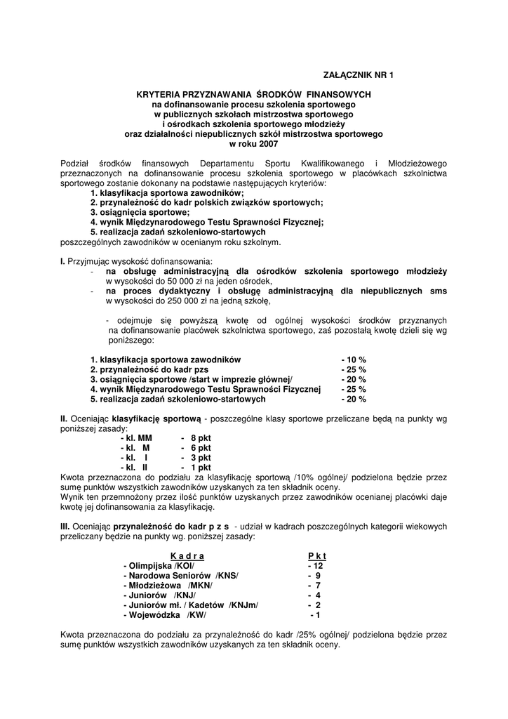 ZAŁĄCZNIK NR 1 KRYTERIA PRZYZNAWANIA ŚRODKÓW FINANSOWYCH na dofinansowanie procesu szkolenia sportowego w publicznych szkołach mistrzostwa sportowego i ośrodkach szkolenia sportowego młodzieży oraz działalności niepublicznych szkół mistrzostwa sportowego w roku 2007 Podział środków finansowych Departamentu Sportu Kwalifikowanego i Młodzieżowego przeznaczonych na dofinansowanie procesu szkolenia sportowego w placówkach szkolnictwa sportowego zostanie dokonany na podstawie następujących kryteriów: 1. klasyfikacja sportowa zawodników; 2. przynależność do kadr polskich związków sportowych; 3. osiągnięcia sportowe; 4. wynik Międzynarodowego Testu Sprawności Fizycznej; 5. realizacja zadań szkoleniowo-startowych poszczególnych zawodników w ocenianym roku szkolnym. I. Przyjmując wysokość dofinansowania: - na obsługę administracyjną dla ośrodków szkolenia sportowego młodzieży w wysokości do 50 000 zł na jeden ośrodek, - na proces dydaktyczny i obsługę administracyjną dla niepublicznych sms w wysokości do 250 000 zł na jedną szkołę, - odejmuje się powyższą kwotę od ogólnej wysokości środków przyznanych na dofinansowanie placówek szkolnictwa sportowego, zaś pozostałą kwotę dzieli się wg poniższego: 1. klasyfikacja sportowa zawodników 2. przynależność do kadr pzs 3. osiągnięcia sportowe /start w imprezie głównej/ 4. wynik Międzynarodowego Testu Sprawności Fizycznej 5. realizacja zadań szkoleniowo-startowych - 10 % - 25 % - 20 % - 25 % - 20 % II. Oceniając klasyfikację sportową - poszczególne klasy sportowe przeliczane będą na punkty wg poniższej zasady: - kl. MM - 8 pkt - kl. M - 6 pkt - kl. I - 3 pkt - kl. II - 1 pkt Kwota przeznaczona do podziału za klasyfikację sportową /10% ogólnej/ podzielona będzie przez sumę punktów wszystkich zawodników uzyskanych za ten składnik oceny. Wynik ten przemnożony przez ilość punktów uzyskanych przez zawodników ocenianej placówki daje kwotę jej dofinansowania za klasyfikację. III. Oceniając przynależność do kadr p z s - udział w kadrach poszczególnych kategorii wiekowych przeliczany będzie na punkty wg. poniższej zasady: Kadra - Olimpijska /KOl/ - Narodowa Seniorów /KNS/ - Młodzieżowa /MKN/ - Juniorów /KNJ/ - Juniorów mł. / Kadetów /KNJm/ - Wojewódzka /KW/ Pkt - 12 - 9 - 7 - 4 - 2 -1 Kwota przeznaczona do podziału za przynależność do kadr /25% ogólnej/ podzielona będzie przez sumę punktów wszystkich zawodników uzyskanych za ten składnik oceny. Wynik ten pomnożony przez ilość punktów uzyskanych przez zawodników ocenianej placówki daje kwotę jej dofinansowania za udział w kadrach. IV. Osiągnięcia sportowe Podobnie, jak przy ocenie ww. składników - osiągnięcia sportowe /uzyskane lokaty w imprezie głównej przez każdego zawodnika w ocenianym roku szkolnym/ będą przeliczane na punkty wg poniższej zasady: Zajmowane miejsca Oceniane imprezy sportowe I II III IV-VIII IX-XII Udział IO 100 99 98 90 85 75 Igrzyska Olimpijskie MSwS 1/ Mistrzostwa Świata Seniorów 70 69 68 52 44 40 PSwS 2/ Puchary Świata – seniorów MMSw 1/ Młodzieżowe Mistrzostwa Świata 60 59 58 44 38 30 MPSw 2/ Młodzieżowe Puchary Świata MES 1/ Mistrzostwa Europy Seniorów 50 49 48 38 30 25 PES 2/ Puchary Europy Seniorów MME 1/ Młodzieżowe Mistrzostwa Europy MPE 2/ Młodzieżowe Puchary Europy 45 44 43 33 26 21 Un 3/ Uniwersjada AMSw 4/ Akademickie Mistrzostwa Świata MSwJ 1/ Mistrzostwa Świata Juniorów 40 39 38 28 22 18 PSwJ 2/ Puchary Świata Juniorów MSwJm 1/ Mistrzostwa Świata Juniorów mł. 35 34 33 24 18 14 PSwJm 2/ Puchary Świata Juniorów mł. MEJ 1/ Mistrzostwa Europy Juniorów 30 29 28 20 15 11 PEJ 2/ Puchary Europy Juniorów MEJm 1/ Mistrzostwa Europy Juniorów mł. 25 24 23 16 11 8 PEJm 2/ Puchary Europy Juniorów mł. MPS 1/ Mistrzostwa Polski Seniorów PPS 20 19 18 13 9 6 2/ Puchary Polski Seniorów ExK 3/ Rozgrywki Ekstraklasy MMP 1/ Młodzieżowe Mistrzostwa Polski MPP 15 14 13 9 5 3 2/ Młodzieżowe Puchary Polski 1L 3/ Rozgrywki I ligi MPJ 1/ Mistrzostwa Polski Juniorów PPJ 2/ Puchary Polski Juniorów 10 9 8 6 3 1 2L 3/ Rozgrywki II ligi CLJ 4/ rozgrywki Centralnych Lig Juniorów MPJm 1/ Mistrzostwa Polski Juniorów mł. OOM 2/ Ogólnopolska Olimpiada Młodzieży PPJm 3/ Puchary Polski Juniorów mł. 5 4 3 2 1 -3L 4/ Rozgrywki III i niższych lig, 5/ zawody z udziałem ekip zagranicznych w ZMnr kraju i za granicą 1/ Międzywojewódzkie Mistrzostwa Młodzików MMM 3 2 1 ---2/ zawody krajowe w kat. juniora mł. i młodzika ZKr Uwaga: 1/ start w imprezach pucharowych oceniany będzie tylko za miejsce w klasyfikacji generalnej. 2/ udział w kwalifikacjach do MŚ i ME wszystkich kategorii wiekowych będzie oceniany jak 1 mce w mistrzostwach Polski danej kategorii wiekowej. Kwota przeznaczona do podziału za osiągnięcia sportowe /20% ogólnej/ podzielona będzie przez sumę punktów wszystkich zawodników uzyskanych za ten składnik oceny. Wynik ten pomnożony przez ilość punktów uzyskanych przez zawodników ocenianej placówki daje kwotę jej dofinansowania za start w imprezach głównych. V. Oceniając wynik Międzynarodowego Testu Sprawności Fizycznej – wynik MTSF przeliczany będzie na punkty wg. poniższej zasady: Poziom sprawności Liczba pkt. MTSF Ocena – pkt. 5 wybitny > 641 3 wysoki 561 – 640 2 średni 481 – 560 1 niski < 480 Kwota przeznaczona do podziału za wynik MTSF /25% ogólnej/ podzielona będzie przez sumę punktów wszystkich zawodników uzyskanych za ten składnik oceny. Wynik ten pomnożony przez ilość punktów uzyskanych przez zawodników ocenianej placówki daje kwotę jej dofinansowania za udział w kadrach. VI. Stopień realizacji zadań szkoleniowo-startowych będzie uwzględniany proporcjonalnie do jego wykonania przez zawodników poszczególnych placówek szkolnictwa sportowego: - realizacja zadania - 3 pkt - brak realizacji zadania - 1 pkt - brak zadania - 0 pkt Kwota przeznaczona do 