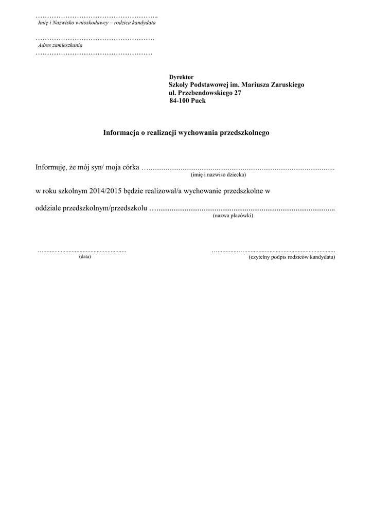 ……………………………………………... Imię i Nazwisko wnioskodawcy – rodzica kandydata ……………………………………………. Adres zamieszkania …………………………………………… Dyrektor Szkoły Podstawowej im. Mariusza Zaruskiego ul. Przebendowskiego 27 84-100 Puck Informacja o realizacji wychowania przedszkolnego Informuję, że mój syn/ moja córka …................................................................................................... (imię i nazwiso dziecka) w roku szkolnym 2014/2015 będzie realizował/a wychowanie przedszkolne w oddziale przedszkolnym/przedszkolu …............................................................................................... (nazwa placówki) …..................................................... (data) ….............….......................................................... (czytelny podpis rodziców kandydata)