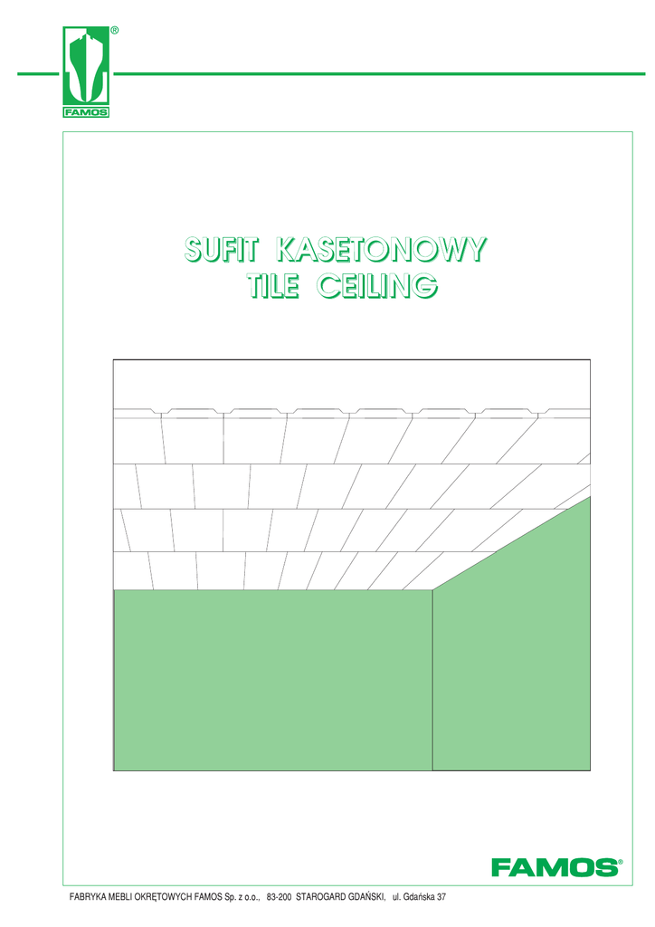 SUFIT KASETONOWY TILE CEILING FABRYKA MEBLI OKRÊTOWYCH FAMOS Sp. z o.o., 83-200 STAROGARD GDAÑSKI, ul. Gdañska 37 -1- SUFIT KASETONOWY Sufit kasetonowy zosta³ zaprojektowany do stosowania w pomieszczeniach gdzie wymagany jest ³atwy dostêp do przestrzeni pomiêdzy sufitem a pok³adem stalowym lub stropem. Zastosowanie w kasetonach we³ny mineralnej o ró¿nej gêstoœci a tak¿e dodatkowa izolacja dŸwigarów noœnych, zapewnia konstrukcji sufitowej spe³nienie ró¿nych klas zabezpieczenia ogniowego. Elementy sufitowe umo¿liwiaj¹ tworzenie ró¿norodnych uk³adów architektonicznych a tak¿e ³¹czenie z sufitem listwowym produkowanym w FAMOSIE. KONSTRUKCJA Sufit kasetonowy sk³ada siê z elementów szalunkowych, kratownicy noœnej oraz zamocowañ. Jako elementy szalunkowe stosuje siê p³yty sufitowe /kasetony/ w bogatym typoszeregu wymiarowym listwy sufitowe oraz profile przyœcienne. Izolacjê termiczn¹ dla okreœlonej klasy odpornoœci ogniowej, a tak¿e izolacjê dŸwiêkoch³onn¹ stanowi we³na mineralna stosownej gêstoœci i gruboœci, wklejona w kasetony i listwy sufitowe. Kratownicê noœn¹ sufitu stanowi¹ dŸwigary monta¿owe, których kszta³t umo¿liwia zatrzaskowy monta¿ kasetonów w dŸwigarach. DŸwigary po³¹czone s¹ ze sob¹ za pomoc¹ z³¹cz k¹towych i wieszaków naro¿nych tworz¹c kratownice. Kratownica noœna podwieszona jest do pok³adu stalowego lub stropu za pomoc¹ zawieszeñ zaczepów i sprê¿yn blokuj¹cych umo¿liwiaj¹cych p³ynne poziomowanie p³aszczyzny sufitu. ODPORNOŒÆ OGNIOWA Materia³y podstawowe u¿yte do produkcji p³yt œciennych s¹ sklasyfikowane jako niepalne, natomiast materia³y wykoñczeniowe stosowane jako ok³adziny zewnêtrzne spe³niaj¹ w³asnoœci wolnego rozprzestrzeniania siê p³omienia (WRP). Wszystkie stosowane materia³y w konstrukcji s¹ równie¿ nietoksyczne. Prezentowane tu konstrukcje sufitowe przesz³y miêdzynarodowe standardowe badania ogniowe dla klasy B w laboratorium "DANTEST" w Kopenhadze, laboratorium BRANDVERSUCHSHAUS w Hamburgu oraz w laboratoriach krajowych, spe³niaj¹c odpowiednie wymagania Miêdzynarodowej Konwencji o Bezpieczeñstwie ¿ycia na morzu SOLAS-1974 z poprawkami. Na tej podstawie uzyskano atesty na klasê B0/A15 i wydane przez w³adze Administracyjne i Towarzystwa Klasyfikacyjne ró¿nych krajów. MONTA¯ Przed przyst¹pieniem do monta¿u sufitu nale¿y wykonaæ trasowanie punktów zawieszenia kratownicy do pok³adu stalowego lub stropu. W wyznaczonych punktach mocuje siê zawieszki sufitowe. Podwieszenie dŸwigarów do zawieszek nastêpuje za pomoc¹ z³¹cz stalowych dŸwigara i sprê¿yn blokuj¹cych, a do wieszaków naro¿nych poprzez zaczepy dŸwigarów. Nastêpn¹ czynnoœci¹ jest wypoziomowanie kratownicy. W³aœciwe wypoziomowanie jest gwarancj¹ uzyskania równej p³aszczyzny sufitu. Po wypoziomowaniu kratownicy, w dŸwigary noœne nale¿y wcisn¹æ zatrzaskowo p³yty i listwy sufitowe. Widoczne powierzchnie listew sufitowych i maskuj¹cych, na czas produkcji i monta¿u zabezpieczone s¹ foli¹ ochronn¹ samoprzylepn¹. W przypadku zabrudzenia widocznych powierzchni listew po zdjêciu folii ochronnej, powierzchnie te daj¹ siê czyœciæ przy pomocy myd³a lub detergentów rozpuszczonych w letniej wodzie. Jeœli powierzchnia jest silniej zabrudzona, wówczas do czyszczenia mo¿na stosowaæ stê¿ony detergent lub rozpuszczalniki jak aceton lub benzyna. Nie nale¿y stosowaæ proszków i past œciernych. FABRYKA MEBLI OKRÊTOWYCH FAMOS Sp. z o.o., 83-200 STAROGARD GDAÑSKI, ul. Gdañska 37 -2- TILE CEILING The tile ceiling has been designed for application in such compartsments where an easy acces to space between and steel deck or roof is required. Fire protection of different class is obtained by insulation of mineral wool in tiles of different density as well as by additional insulation of girder. The connection of tile ceiling with strip ona is posible thanks to the elements of ceiling. CONSTRUCTION The tile ceiling consists of lining elements, supporting gird and fastenings. As lining elements are used ceiling tiles in plenteous dimension range, ceiling strips and profiles at wall. Mineral wool of appropriate density and thickness insurted into tiles and ceiling strip makes the thermal insulation. Mounting girders form the supporting gird. Their shape makes snap-pressing assembly of tiles in girders possible. Girders forming ceiling gird are joined to each other by means of angle connectors and corner hangers. The gird is hung up to the steel deck by means of holders and blocking springs making fluent levelling of ceiling surface possible. FIRE RESISTANCE Basic materials are classified as non-combustible. Finishing materials-decorative coatings-meet the requirements of international standard in scope of low flame-spread characteristics. All materials are non-toxic. Here presented wall structures passed international fire test according to SOLAS-1974 Convection with a mendments and comply with is relevant requirements. Fire test for B class were carried out at "DANTEST" laboratory in Copenhagen, "BRANDVERSUCHSHAUS" laboratory in Hamburg and domestic laboratories. Wall structure is approved as B0/A15 by different Clasification Societes and National Authorities. Certificaties of approvals, materials and approved drawings of mounting joints are submitted on request. MOUNTING Before startimg the mounting of ceilings, points of suspension shall be marked on steel deck or roff. Then, round bars of girder suspension are fastened to steel deck or soffit in these marked points. Hanging up of girders to girder suspension is realized by means of steel connectors of the girder and blocking springs where as hanging up of girders to corner hangers is done by girders catches. The levelling of gird is the next activity to be done. When the gird is already levelled, ceiling panels and strips are snap-pressed into girders. Visible surfaces of ceiling panels and strips are protected by p