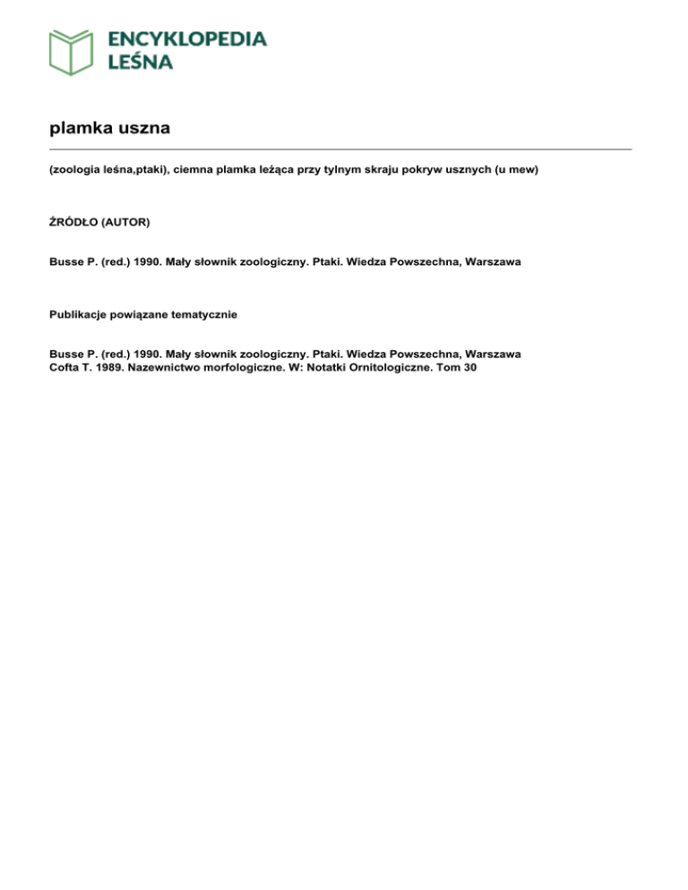 plamka uszna (zoologia leśna,ptaki), ciemna plamka leżąca przy tylnym skraju pokryw usznych (u mew) ŹRÓDŁO (AUTOR) Busse P. (red.) 1990. Mały słownik zoologiczny. Ptaki. Wiedza Powszechna, Warszawa Publikacje powiązane tematycznie Busse P. (red.) 1990. Mały słownik zoologiczny. Ptaki. Wiedza Powszechna, Warszawa Cofta T. 1989. Nazewnictwo morfologiczne. W: Notatki Ornitologiczne. Tom 30