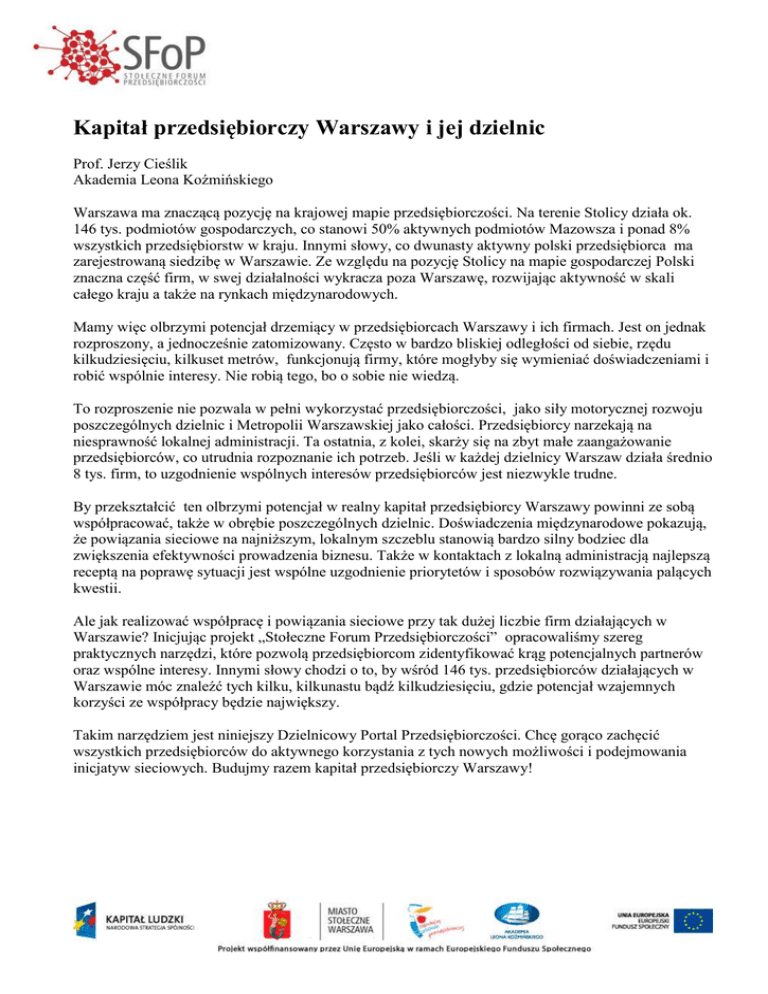 Kapitał przedsiębiorczy Warszawy i jej dzielnic Prof. Jerzy Cieślik Akademia Leona Koźmińskiego Warszawa ma znaczącą pozycję na krajowej mapie przedsiębiorczości. Na terenie Stolicy działa ok. 146 tys. podmiotów gospodarczych, co stanowi 50% aktywnych podmiotów Mazowsza i ponad 8% wszystkich przedsiębiorstw w kraju. Innymi słowy, co dwunasty aktywny polski przedsiębiorca ma zarejestrowaną siedzibę w Warszawie. Ze względu na pozycję Stolicy na mapie gospodarczej Polski znaczna część firm, w swej działalności wykracza poza Warszawę, rozwijając aktywność w skali całego kraju a także na rynkach międzynarodowych. Mamy więc olbrzymi potencjał drzemiący w przedsiębiorcach Warszawy i ich firmach. Jest on jednak rozproszony, a jednocześnie zatomizowany. Często w bardzo bliskiej odległości od siebie, rzędu kilkudziesięciu, kilkuset metrów, funkcjonują firmy, które mogłyby się wymieniać doświadczeniami i robić wspólnie interesy. Nie robią tego, bo o sobie nie wiedzą. To rozproszenie nie pozwala w pełni wykorzystać przedsiębiorczości, jako siły motorycznej rozwoju poszczególnych dzielnic i Metropolii Warszawskiej jako całości. Przedsiębiorcy narzekają na niesprawność lokalnej administracji. Ta ostatnia, z kolei, skarży się na zbyt małe zaangażowanie przedsiębiorców, co utrudnia rozpoznanie ich potrzeb. Jeśli w każdej dzielnicy Warszaw działa średnio 8 tys. firm, to uzgodnienie wspólnych interesów przedsiębiorców jest niezwykle trudne. By przekształcić ten olbrzymi potencjał w realny kapitał przedsiębiorcy Warszawy powinni ze sobą współpracować, także w obrębie poszczególnych dzielnic. Doświadczenia międzynarodowe pokazują, że powiązania sieciowe na najniższym, lokalnym szczeblu stanowią bardzo silny bodziec dla zwiększenia efektywności prowadzenia biznesu. Także w kontaktach z lokalną administracją najlepszą receptą na poprawę sytuacji jest wspólne uzgodnienie priorytetów i sposobów rozwiązywania palących kwestii. Ale jak realizować współpracę i powiązania sieciowe przy tak dużej liczbie firm działających w Warszawie? Inicjując projekt „Stołeczne Forum Przedsiębiorczości” opracowaliśmy szereg praktycznych narzędzi, które pozwolą przedsiębiorcom zidentyfikować krąg potencjalnych partnerów oraz wspólne interesy. Innymi słowy chodzi o to, by wśród 146 tys. przedsiębiorców działających w Warszawie móc znaleźć tych kilku, kilkunastu bądź kilkudziesięciu, gdzie potencjał wzajemnych korzyści ze współpracy będzie największy. Takim narzędziem jest niniejszy Dzielnicowy Portal Przedsiębiorczości. Chcę gorąco zachęcić wszystkich przedsiębiorców do aktywnego korzystania z tych nowych możliwości i podejmowania inicjatyw sieciowych. Budujmy razem kapitał przedsiębiorczy Warszawy!
