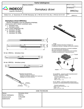 Karta katalogowa Nr str. / L. str.: 1 /1 Nazwa produktu: Nr katalogowy: Domykacz drzwi 09923xy Indeco S.A., ul. Kaczorowa 37, 03-046 Warszawa, tel. (+48 22) 313 0 313, fax. (+48 22) 313 0 314 Data: 2009-04-21 Domykacz drzwi 09923xy 32 19 Element dociągający drzwi do położenia skrajnego, wykonywany jest w dwóch wariantach jako; x: 1 - domykacz lewy 2 - domykacz prawy oraz w trzech kategoriach siły: y: A - domykacz 10-25kg B - domykacz 25-50kg C - domykacz 50-100kg Uwagi: Szczegóły instalacji domykacza dostępne są w oddzielnej instrukcji i katalogu technicznym INDECO. Do zainstalowania domykacza na drzwich niezbędne jest uzycie akcesoriów domykacza. Akcesoria domykacza przystosowane są do montażu z profilami symetrycznymi i niesymetrycznymi: 377 Nr kat. 099231y - domykacz lewy Trzpień Wkręt Nr kat. 099232y - domykacz prawy Adapter Regulacja siły domykacza: Domykacz 25-50kg ma mozliwość regulacji siły domykania, poprzez wkret regulacyjny znajdujący sie na końcu siłownika. Zawartośc opakowania: Zmniejszanie siły domykacza Adapter do profili symetrycznych - 2 szt Trzpień - 1 szt Wkrety ST 3,5 x13 - 4 szt DANE TECHNICZNE Zastosowanie: Opakowanie Domykacz drzwi 09923xy A100,A200 1/szt. Zawartość opakowania : Adapter do profili niesymetrycznych - 2 szt Trzpień -1 szt Wkręt ST 3,5x13 - 4 szt Nr kat. 099241 - akcesoria profili symetrycznych (CALGARY,VICTORIA,EDMONTON,YUKON,HUDSON) Zwiększanie siły domykacza Nazwa Numer katalogowy Nr kat.099242 - akcesoria profli niesymetrycznych (NIAGARA, WIDNSOR, LOGAN)