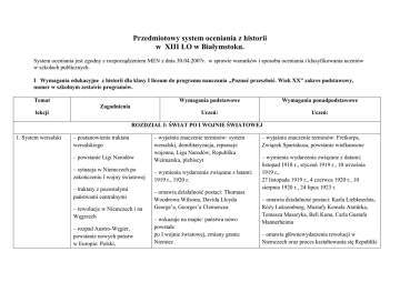 Przedmiotowy system oceniania z historii w XIII LO w Białymstoku. System oceniania jest zgodny z rozporządzeniem MEN z dnia 30.04.2007r. w sprawie warunków i sposobu oceniania i klasyfikowania uczniów w szkołach publicznych. I Wymagania edukacyjne z historii dla klasy I liceum do programu nauczania „Poznać przeszłość. Wiek XX” zakres podstawowy, numer w szkolnym zestawie programów. Temat Wymagania podstawowe Wymagania ponadpodstawowe Uczeń: Uczeń: Zagadnienia lekcji ROZDZIAŁ I: ŚWIAT PO I WOJNIE ŚWIATOWEJ 1. System wersalski – postanowienia traktatu wersalskiego – powstanie Ligi Narodów – wyjaśnia znaczenie terminów: system wersalski, demilitaryzacja, reparacje wojenne, Liga Narodów, Republika Weimarska, plebiscyt – sytuacja w Niemczech po zakończeniu I wojny światowej – wymienia wydarzenia związane z latami: 1919 r., 1920 r. – traktaty z pozostałymi państwami centralnymi – omawia działalność postaci: Thomasa Woodrowa Wilsona, Davida Lloyda George’a, Georges’a Clemencea – rewolucje w Niemczech i na Węgrzech – rozpad Austro-Węgier, powstanie nowych państw w Europie: Polski, – wskazuje na mapie: państwa nowo powstałe po I wojnie światowej, zmiany granic Niemiec – wyjaśnia znaczenie terminów: Freikorps, Związek Spartakusa, powstanie wielkanocne – wymienia wydarzenia związane z datami: listopad 1918 r., styczeń 1919 r., 10 września 1919 r., 27 listopada 1919 r., 4 czerwca 1920 r., 10 sierpnia 1920 r., 24 lipca 1923 r. – omawia działalność postaci: Karla Liebknechta, Róży Luksemburg, Mustafy Kemala Atatürka, Tomasza Masaryka, Beli Kuna, Carla Gustafa Mannerheima – omawia głównewydarzenia rewolucji w Niemczech oraz proces kształtowania się Republiki Czechosłowacji, Królestwa SHS (Jugosławii), Litwy, Łotwy, Estonii, Finlandii, Irlandii, Islandii, Wolnego Miasta Gdańska i ZSRR – nowy układ sił w Europie po I wojnie światowej, strefę zdemilitaryzowaną, tereny plebiscytowe, Paryż, Genewę Weimarskiej – ocenia związki rewolucji w Niemczech z rewolucją bolszewicką w Rosji Radzieckiej – prezentuje główne założenia polityki USA, – wskazuje na mapie zmiany granic na terytorium Francji dawnego imperium tureckiego i Wielkiej Brytanii na konferencji paryskiej – określa skutki polityczne, gospodarcze i militarne traktatu wersalskiego dla Niemiec – podaje różnice w celach dyplomacji USA, Wielkiej Brytanii i Francji na konferencji paryskiej – podaje przyczyny niezadowolenia Niemiec – wymienia postanowienia traktatów pokojowych z ustalonych zasad traktatu wersalskiego z Austrią, Bułgarią, Węgrami i Turcją – przedstawia i ocenia postanowienia – dokonuje bilansu I wojny światowej traktatu wersalskiego dotyczące Polski – tłumaczy, w jakim celu powstała Liga Narodów – wymienia przykłady zawiązywania się nowych sojuszy politycznych i politycznowojskowych między państwami Europy po zakończeniu I wojny światowej 2. Odbudowa powojenna i wielki – skutki I wojny światowej (kryzys gospodarczy, zniszczenia wojenne, bezrobocie, konflikty społeczne) – wyjaśnia znaczenie terminów: wielki kryzys gospodarczy, czarny czwartek, mniejszość narodowa, inflacja, autorytaryzm, totalitaryzm, nacjonalizm, – analizuje konsekwencje polityczne, gospodarcze, społeczne i kulturowe I wojny światowej – opisuje przemiany w Turcji po I wojnie światowej – ocenia założenia i trwałość systemu wersalskiego – wyjaśnia znaczenie terminów: pandemia, etatyzm gospodarczy, interwencjonizm państwowy, cło protekcyjne, zasada samostanowienia, deflacja, kryzys – powojenna hiperinflacja asymilacja, rządy parlamentarno-gabinetowe hiperinflacja, New Deal – zasady funkcjonowania i działalność Ligi Narodów – wymienia wydarzenia związane z datami: 1919 r., październik 1929 r., 1933 r. – problemy narodowościowe – omawia działalność Franklina Delano Roosevelta – kryzys demokracji w Europie – pierwsze koncepcje zjednoczenia Europy – podaje przyczyny wielkiego kryzysu gospodarczego – wielki kryzys gospodarczy – przedstawia najważniejsze skutki wielkiego kryzysu – metody walki z kryzysem (New Deal) – opisuje strukturę Ligi Narodów – charakteryzuje wpływ małego traktatu wersalskiego na sytuację politycznospołeczną Europy Środkowej – określa wzrost nastrojów nacjonalistycznych w Europie wpływających na ustanawianie reżimów autorytarnych i totalitarnych – omawia działalność postaci: Erica Drummonda, Johna Maynarda Keynesa, Richarda CoudenhoveKalergiego, Edvarda Beneša, Éduarda Herriota, Aristide’a Brianda – ocenia znaczenie paktu Brianda-Kellogga – przedstawia pierwsze koncepcje zjednoczenia Europy (ruch paneuropejski i idea Paneuropy) – wyjaśnia mechanizm powstania wielkiego kryzysu gospodarczego – wymienia najważniejsze państwa należące do Ligi Narodów – ocenia decyzję Stanów Zjednoczonych o nieprzystąpieniu do Ligi Narodów – opisuje pierwsze próby podważenia systemu wersalskiego w Europie na początku lat 20. XX w. (Bawaria, Włochy) – wymienia kraje europejskie, które w okresie międzywojennym nie doświadczyły kryzysu demokracji 3. Kryzys demokracji w Europie – narodziny i rozwój włoskiego faszyzmu (ideologia, działalność – wyjaśnia znaczenie terminów: ustrój, ideologia, faszyzm, marsz na Rzym, pucz, – wyjaśnia znaczenie terminów: korporacja, Związki Włoskich Kombatantów, Narodowa partii faszystowskiej, przejęcie władzy, budowa państwa totalitarnego) – Republika Weimarska – powstanie nazizmu w Niemczech – wymienia wydarzenia związane z latami: 1919 r., 1922 r., 1925 r., 1929 r., 1933 r. – przejęcie władzy przez Adolfa Hitlera, budowa państwa totalitarnego – omawia działalność postaci: Benita Mussoliniego, Adolfa Hitlera – społeczeństwo III Rzeszy – początek zbrodni nazistów przed wybuchem II wojny światowej – faszyzm i autorytaryzm winnych krajach europ