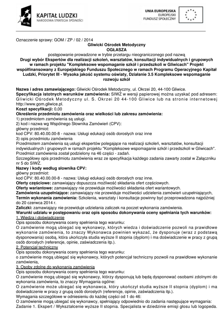 Oznaczenie sprawy: GOM / ZP / 02 / 2014 Gliwicki Ośrodek Metodyczny OGŁASZA postępowanie prowadzone w trybie przetargu nieograniczonego pod nazwą Drugi wybór Ekspertów dla realizacji szkoleń, warsztatów, konsultacji indywidualnych i grupowych w ramach projektu "Kompleksowe wspomaganie szkół i przedszkoli w Gliwicach" Projekt współfinansowany z Europejskiego Funduszu Społecznego w ramach Programu Operacyjnego Kapitał Ludzki, Priorytet III - Wysoka jakość systemu oświaty, Działanie 3.5 Kompleksowe wspomaganie rozwoju szkół Nazwa i adres zamawiającego: Gliwicki Ośrodek Metodyczny, ul. Okrzei 20, 44-100 Gliwice. Specyfikacja istotnych warunków zamówienia: SIWZ w wersji papierowej można uzyskać pod adresem: Gliwicki Ośrodek Metodyczny ul. S. Okrzei 20 44-100 Gliwice lub na stronie internetowej http://www.gom.gliwice.pl. Koszt specyfikacji: 0,00 Określenie przedmiotu zamówienia oraz wielkości lub zakresu zamówienia: 1) przedmiotem zamówienia są usługi. 2) kod i nazwa wg Wspólnego Słownika Zamówień (CPV): główny przedmiot: kod CPV: 80.40.00.00-8 - nazwa: Usługi edukacji osób dorosłych oraz inne 3) opis przedmiotu zamówienia Przedmiotem zamówienia są usługi ekspertów polegające na realizacji szkoleń, warsztatów, konsultacji indywidualnych i grupowych w ramach projektu "Kompleksowe wspomaganie szkół i przedszkoli w Gliwicach". Przedmiot zamówienia został podzielony na 46 części - zadań. Szczegółowy opis przedmiotu zamówienia wraz ze specyfikacja każdego zadania zawarty został w Załączniku nr 5 do SIWZ. Nazwy i kody według słownika CPV: główny przedmiot: kod CPV: 80.40.00.00-8 - nazwa: Usługi edukacji osób dorosłych oraz inne. Oferty częściowe: zamawiający dopuszcza możliwość składania ofert częściowych. Oferty wariantowe: zamawiający nie przewiduje możliwości składania ofert wariantowych. Zamówienia uzupełniające: zamawiający nie przewiduje możliwości udzielenia zamówień uzupełniających, Termin wykonania zamówienia: Szkolenia, warsztaty i konsultacje powinny być przeprowadzona najpóźniej do 20 czerwca 2014 r. Zaliczki: zamawiający nie przewiduje udzielania zaliczek na poczet wykonania zamówienia. Warunki udziału w postępowaniu oraz opis sposobu dokonywania oceny spełniania tych warunków: 1. Wiedza i doświadczenie Opis sposobu dokonywania oceny spełnienia tego warunku: O zamówienie mogą ubiegać się wykonawcy, których wiedza i doświadczenie pozwoli na prawidłowe wykonanie zamówienia, to znaczy Wykonawca powinien wykazać, że dysponuje (wraz z podstawą dysponowania) osobą, która ukończyła studia wyższe II stopnia (dyplom) i ma doświadczenie w pracy z grupą osób dorosłych (referencje, opinie, zaświadczenia itp.). 2. Potencjał techniczny Opis sposobu dokonywania oceny spełnienia tego warunku: o zamówienie mogą ubiegać się wykonawcy, których potencjał techniczny pozwoli na prawidłowe wykonanie zamówienia, 3. Osoby zdolne do wykonania zamówienia Opis sposobu dokonywania oceny spełnienia tego warunku: O zamówienie mogą ubiegać się wykonawcy, którzy dysponują lub będą dysponować osobami zdolnymi do wykonania zamówienia, to znaczy Wymagania ogólne: O zamówienie może ubiegać się wykonawca, który ukończył studia wyższe II stopnia (dyplom) i ma doświadczenie w pracy z grupą osób dorosłych (referencje, opinie, zaświadczenia itp.). Wymagania szczegółowe w odniesieniu do każdej części od 1 do 46: O zamówienie mogą ubiegać się wykonawcy, spełniający odpowiednio do zadania następujące wymagania: Zadanie 1. Ekspert / Wykształcenie wyższe II stopnia. Specjalista w dziedzinie emisji głosu lub logopeda. Praktyk. Doświadczenie w prowadzeniu szkoleń dla rad pedagogicznych Zadanie 2. Ekspert zewnętrzny / Wykształcenie wyższe II stopnia. Trener w dziedzinie radzenia sobie ze stresem lub psycholog praktyk lub coach. Doświadczenie w prowadzeniu szkoleń dla rad pedagogicznych Zadanie 3. Ekspert / Wykształcenie wyższe II stopnia. Trener, specjalista w dziedzinie komunikacji interpersonalnej, pracy w grupie lub psycholog praktyk. Doświadczenie w prowadzeniu szkoleń dla rad pedagogicznych Zadanie 4. Ekspert / Wykształcenie wyższe II stopnia. Specjalista edukacji przedszkolnej i wczesnoszkolnej, znawca metody nauczania matematyki według Edyty Gruszczyk-Kolczyńskiej i Ewy Zielińskiej, praktyk. Doświadczenie w prowadzeniu szkoleń z w/w metody dla rad pedagogicznych. Zadanie 5. Ekspert / Wykształcenie wyższe II stopnia. Specjalista edukacji przedszkolnej lub nauczyciel muzyki lub muzykoterapeuta, znawca metody aktywnego słuchania muzyki według Batti Straus, , praktyk. Doświadczenie w prowadzeniu szkoleń z w/w metody dla rad pedagogicznych. Zadanie 6. Ekspert / Wykształcenie wyższe II stopnia. Trener, specjalista w dziedzinie komunikacji interpersonalnej, pracy w grupie, psycholog, praktyk. Doświadczenie w prowadzeniu szkoleń dla rad pedagogicznych Zadanie 7. Ekspert / Wykształcenie wyższe II stopnia. Trener w dziedzinie radzenia sobie ze stresem, psycholog, praktyk, coach. Doświadczenie w prowadzeniu szkoleń dla rad pedagogicznych. Zadanie 8. Ekspert / wykształcenie wyższe II stopnia, Coach, specjalista z zakresu radzenia sobie ze stresem, wypaleniem zawodowym, kwalifikacje do prowadzenia szkoleń i warsztatów z zakresu komunikacji interpersonalnej, rozwiązywania konfliktów i integracji zespołu (certyfikaty, kursy, studia podyplomowe), praktyk z minimum dwuletnim doświadczeniem w prowadzeniu szkoleń albo psycholog lub socjolog zajmujący się badaniem relacji międzyludzkich osób dorosłych oraz stosujący w pracy z nimi metod uaktywniania zasobów ludzkich i wykorzystania ich w kontaktach z innym (minimum dwuletnie doświadczenie) Zadanie 9. Ekspert / wykształcenie wyższe II stopnia/Foniatra. Zadanie 10. Ekspert / wykształcenie wyższe II stopnia, Nauczyciel informatyki lub doradca metodyczny informatyki. Specja
