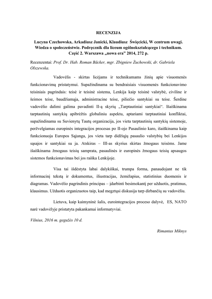 RECENZIJA Lucyna Czechowska, Arkadiusz Janicki, Klaudiusz Święcicki, W centrum uwagi. Wiedza o społeczeństwie. Podręcznik dla liceum ogólnokształcącego i technikum. Część 2. Warszawa „nowa era” 2014, 272 p. Recenzentai: Prof. Dr. Hab. Roman Bäcker, mgr. Zbigniew Żuchowski, dr. Gabriela Olszewska. Vadovėlis - skirtas licėjams ir technikumams žinių apie visuomenės funkcionavimą pristatymui. Supažindinama su bendraisiais visuomenės funkcionavimo teisiniais pagrindais: teisė ir teisinė sistema, Lenkija kaip teisinė valstybė, civiline ir šeimos teise, baudžiamąja, administracine teise, piliečio santykiai su teise. Šerdine vadovėlio dalimi galima pavadinti II-ą skyrių „Tarptautiniai santykiai“. Išaiškinama tarptautinių santykių apibrėžtis globaliniu aspektu, aptariami tarptautiniai konfliktai, supažindinama su Suvienytų Tautų organizacija, jos vieta tarptautinių santykių sistemoje, peržvelgiamas europinės integracijos procesas po II-ojo Pasaulinio karo, išaiškinama kaip funkcionuoja Europos Sąjunga, jos vieta tarp didžiųjų pasaulio valstybių bei Lenkijos sąsajos ir santykiai su ja. Atskiras – III-as skyrius skirtas žmogaus teisėms. Jame išaiškinama žmogaus teisių samprata, pasaulinės ir europinės žmogaus teisių apsaugos sistemos funkcionavimas bei jos raiška Lenkijoje. Visa tai išdėstyta labai dalykiškai, trumpa forma, panaudojant ne tik informacinį tekstą ir dokumentus, iliustracijas, žemėlapius, statistinius duomenis ir diagramas. Vadovėlio pagrindinis principas – įdarbinti besimokantį per užduotis, pratimus, klausimus. Užduotis organizuotos taip, kad megztųsi diskusija tarp dirbančių su vadovėliu. Lietuva, kaip kaimyninė šalis, eurointegracijos proceso dalyvė, ES, NATO narė vadovėlyje pristatyta pakankamai informatyviai. Vilnius, 2016 m. gegužės 10 d. Rimantas Miknys