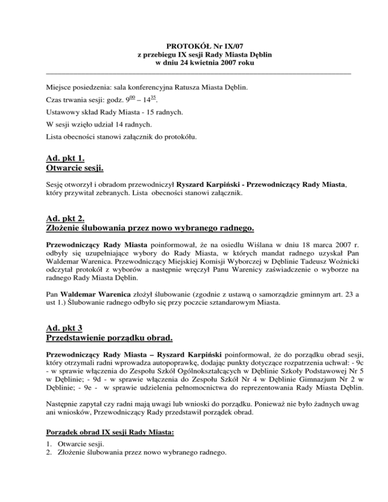 Protokół Nr IX/07 z przebiegu IX sesji Rady Miasta